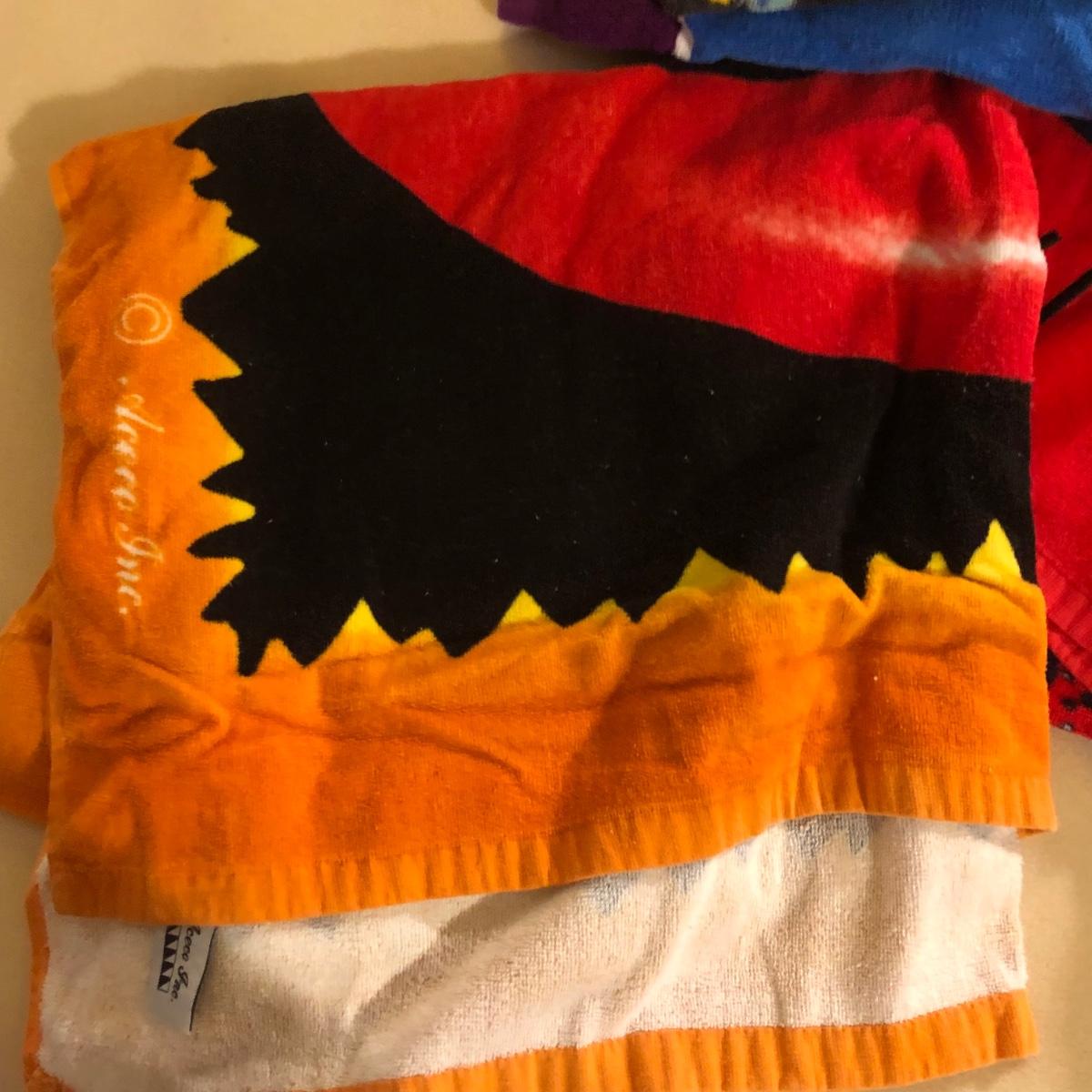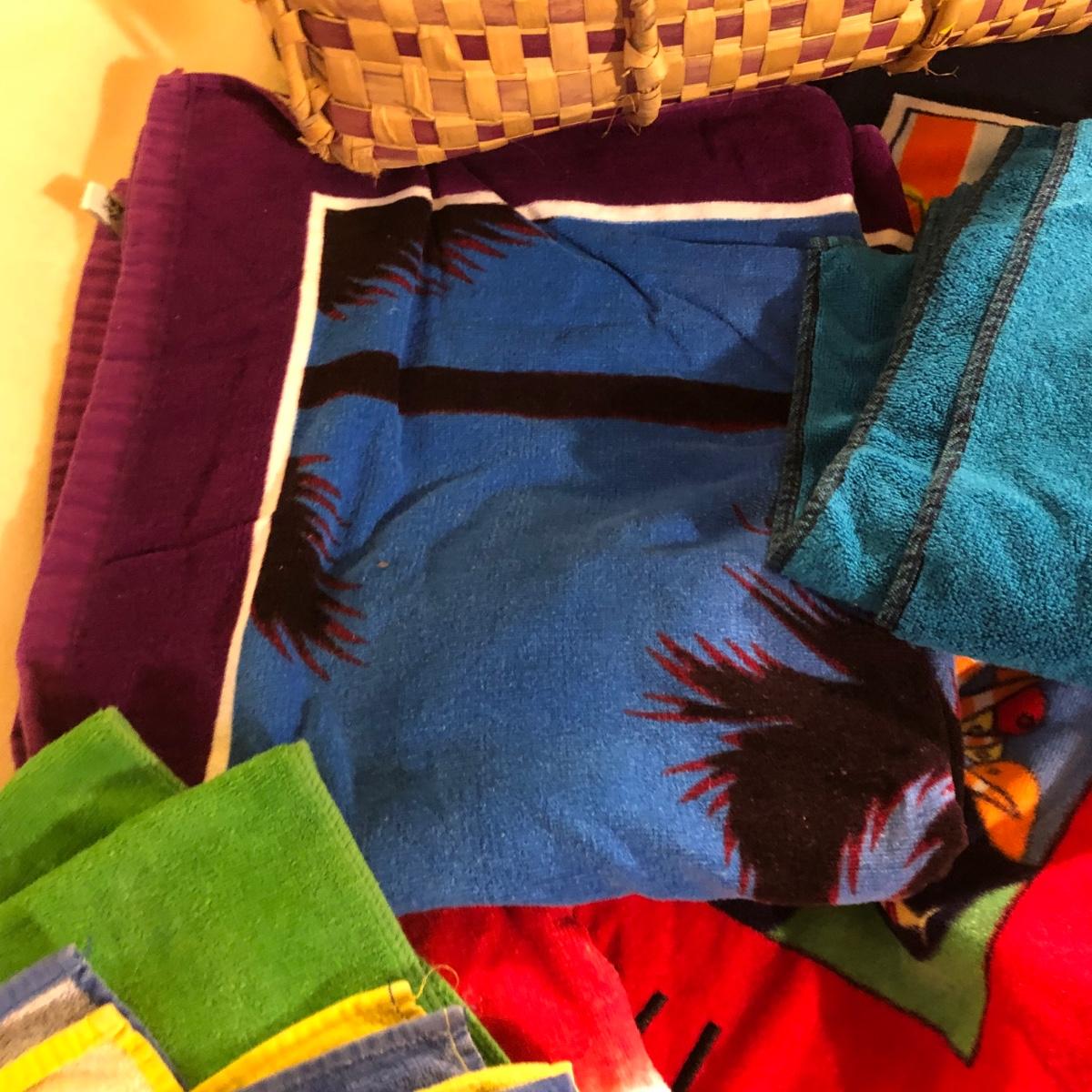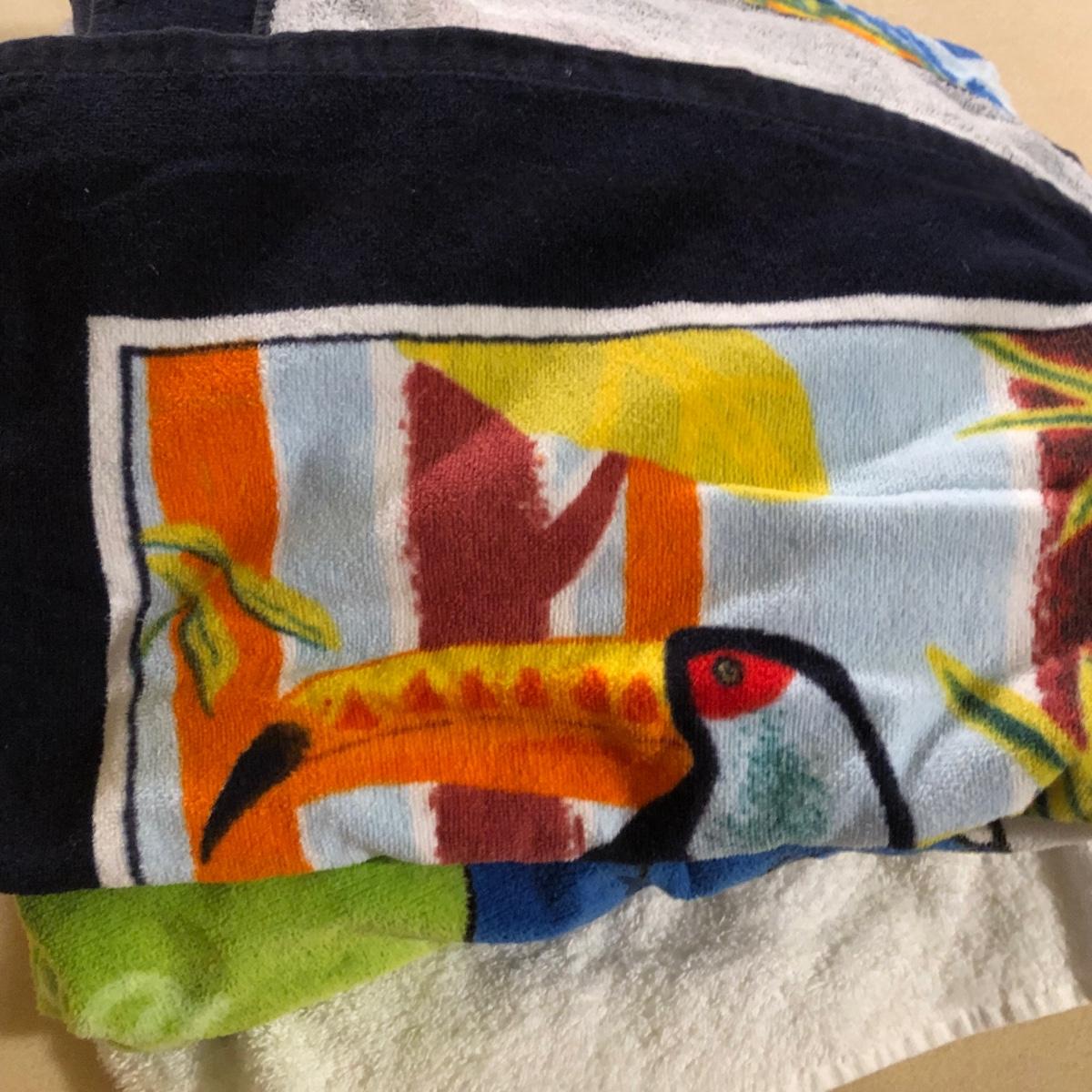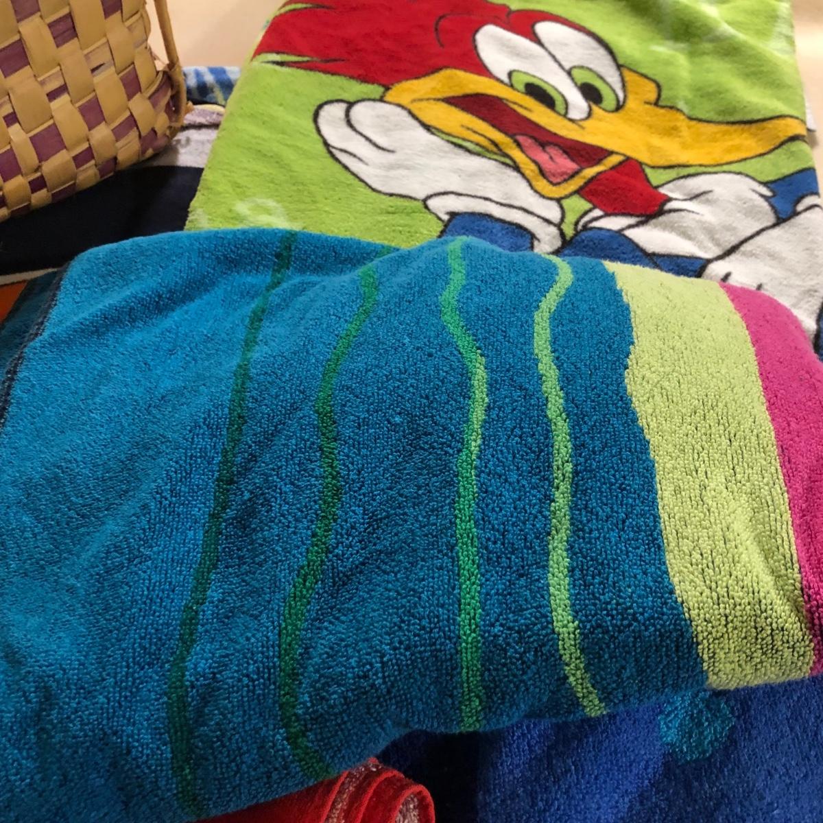 LOT 108M: Beach Towel Assortment w/ Straw Bag - Mickey Mouse, Woody Woodpecker, Toucan & More