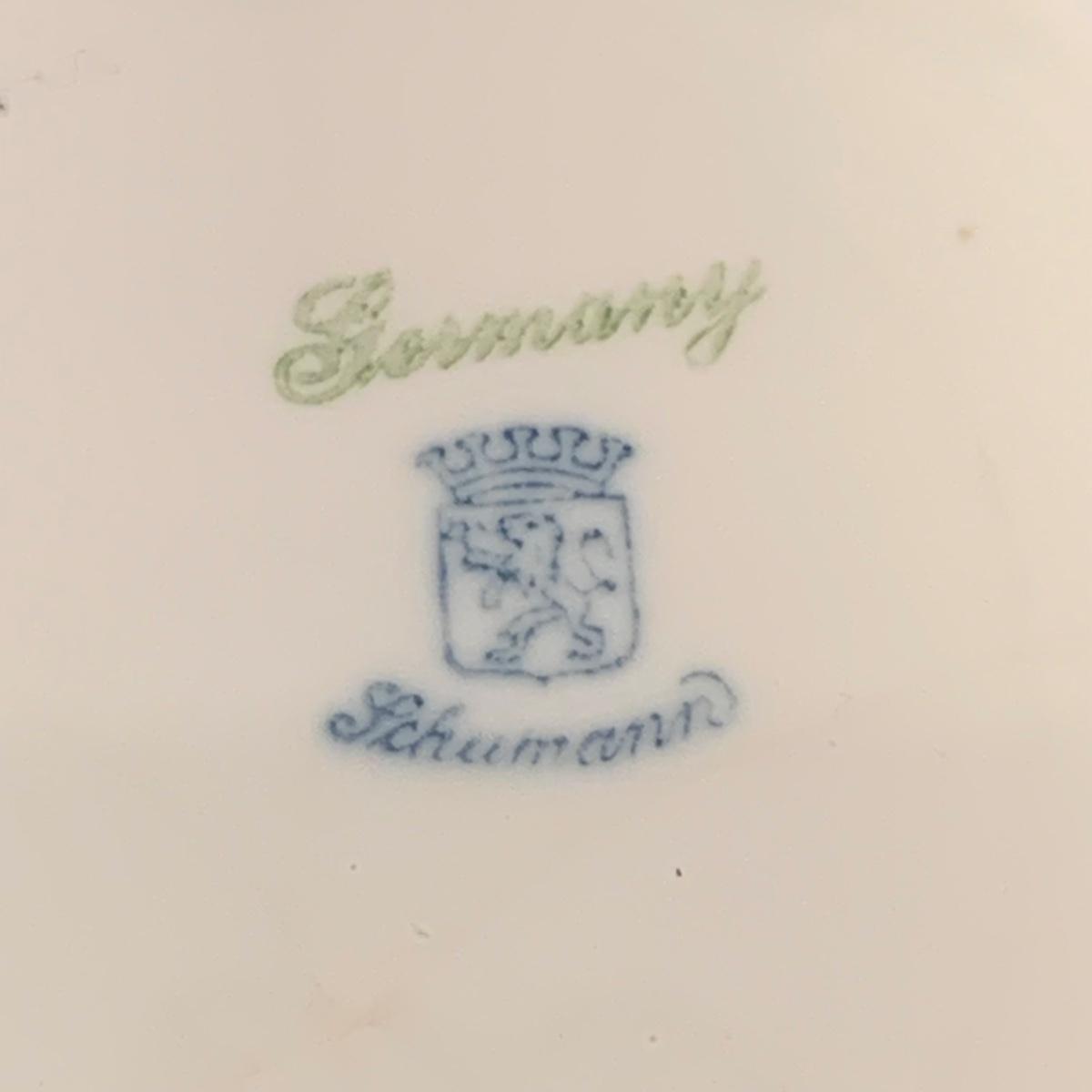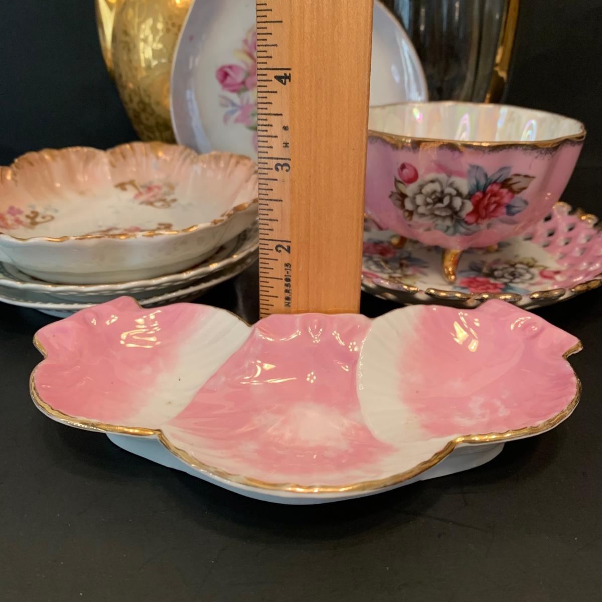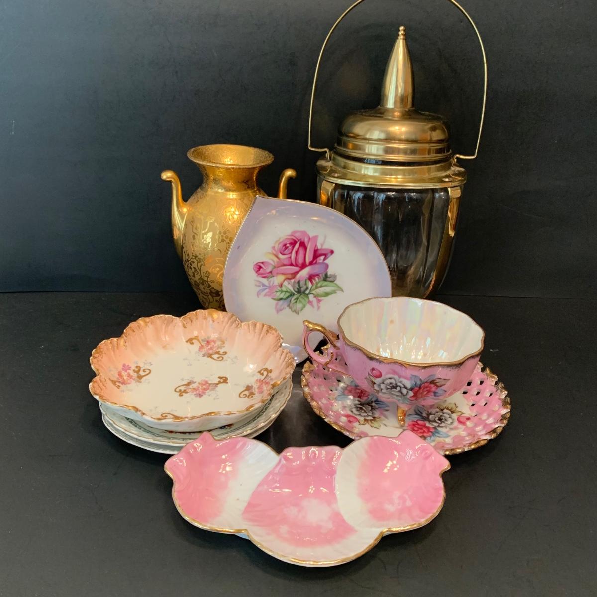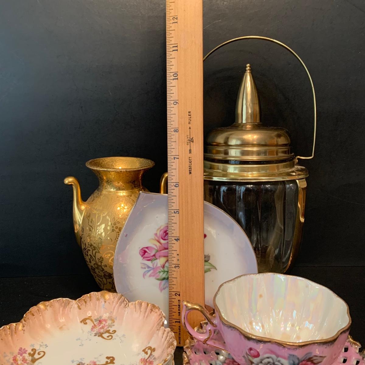 LOT 111R: Vintage Limoges, Schumann Hand Painted Leaf Shaped Dish, Musical Biscuit Jar, Stouffer China Bavaria Gold Vase