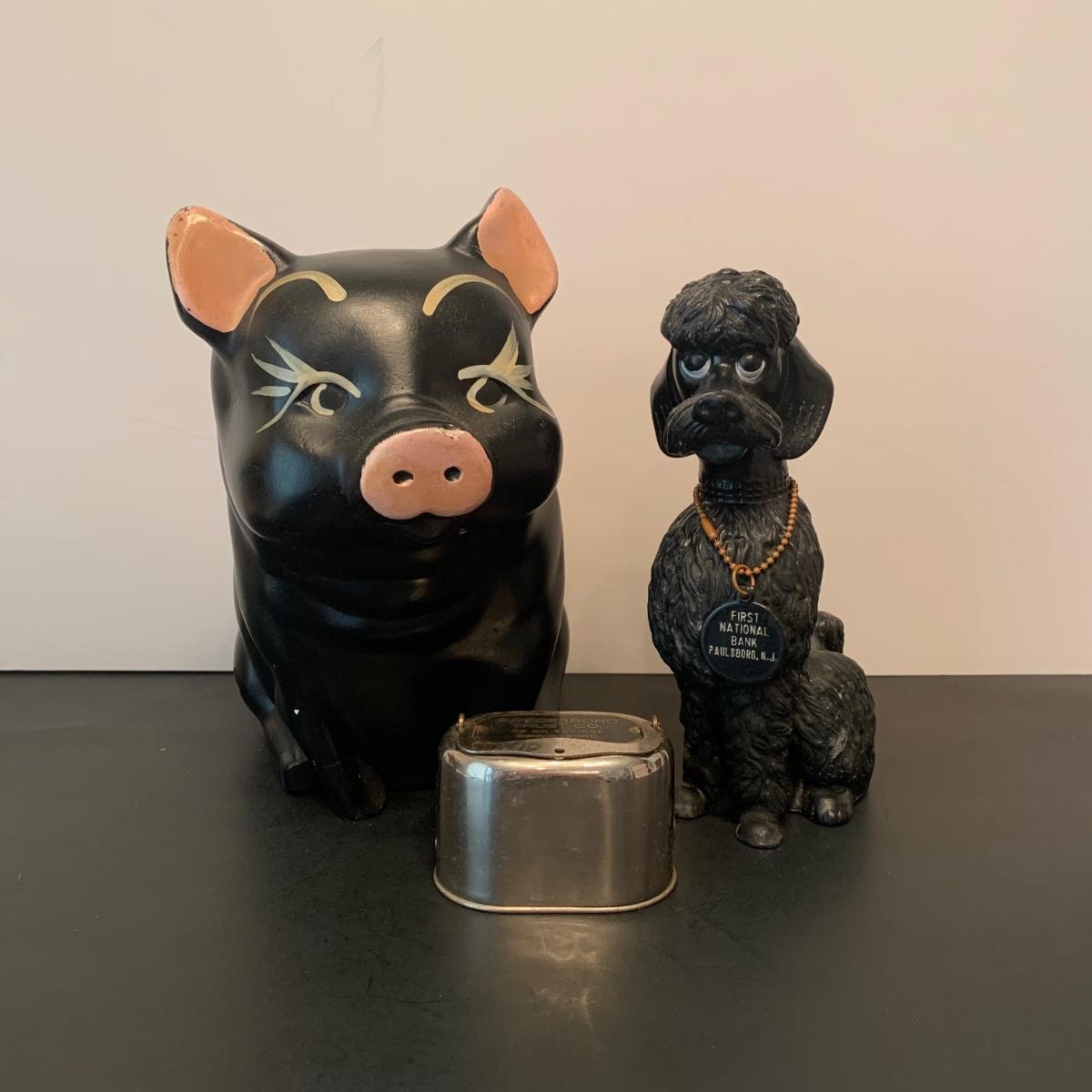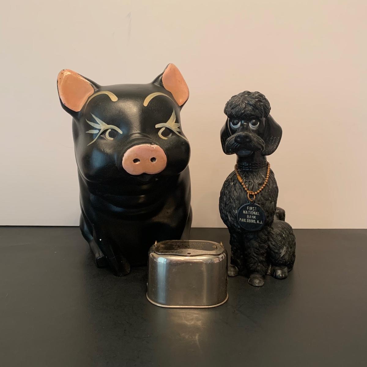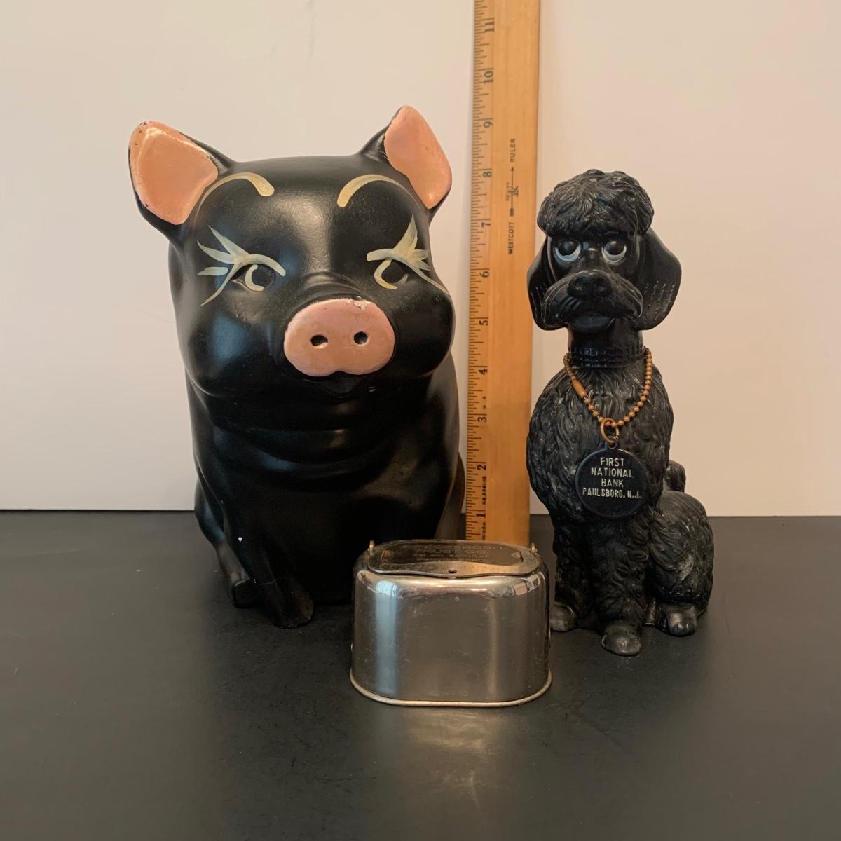 LOT 118R: Vintage Ceramic Piggy Bank, Vintage Plastic Poodle Bank & Swedesboro Trust Co. Bank