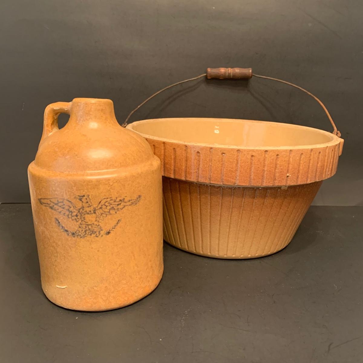 LOT 123R: Vintage Brown Glaze Pottery Mixing Bowl & Vintage Jug w/Eagle