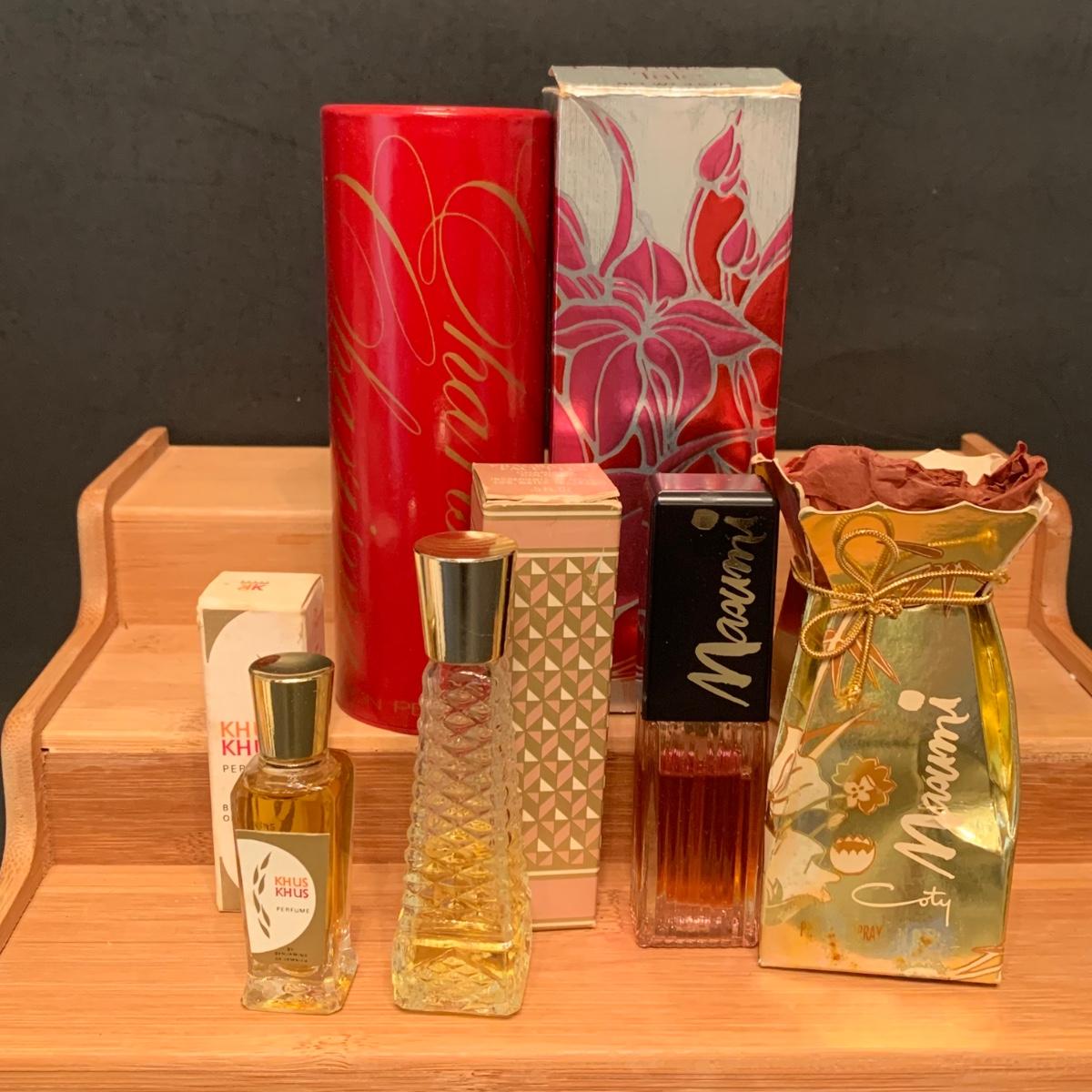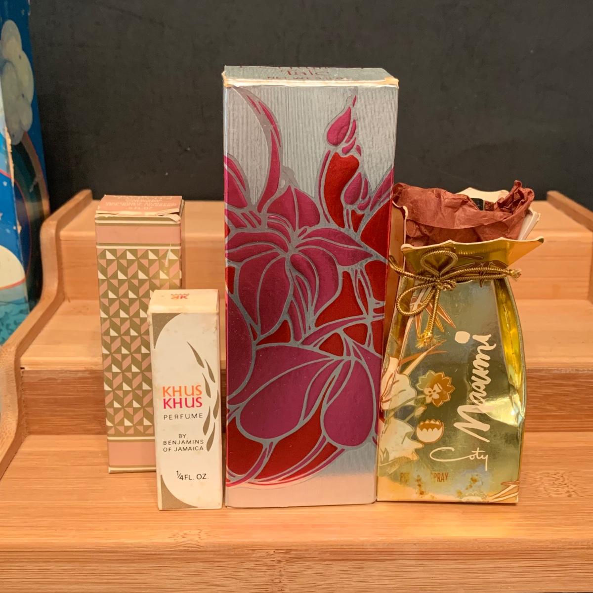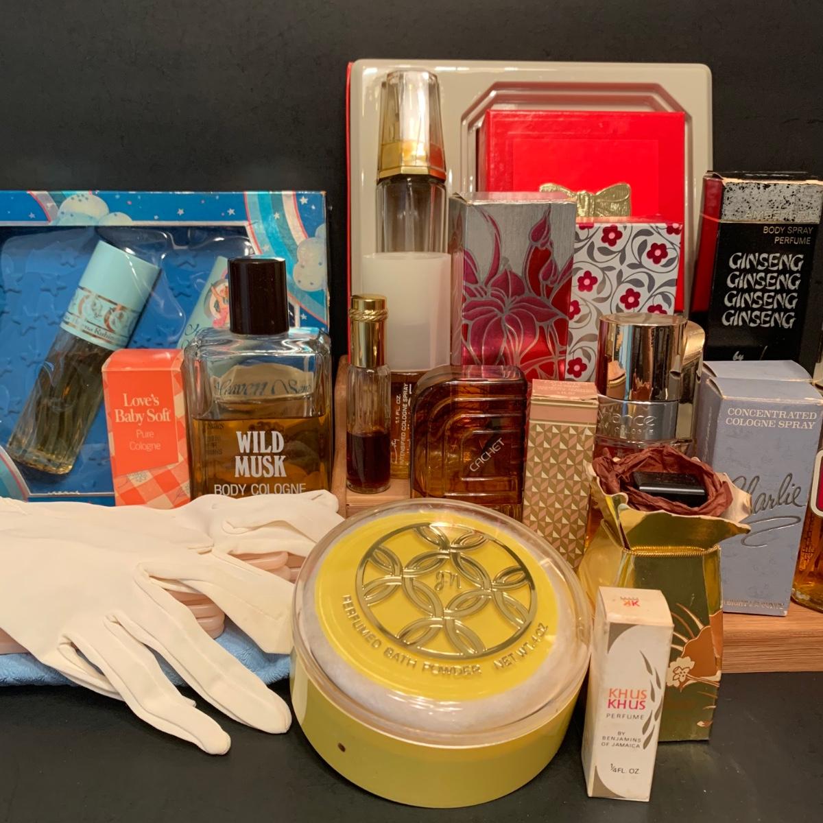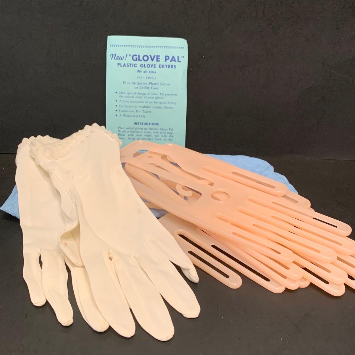 LOT 126R: Vintage Perfumes, Ladies Dress Gloves & "Glove Pals" Plastic Glove Dryers