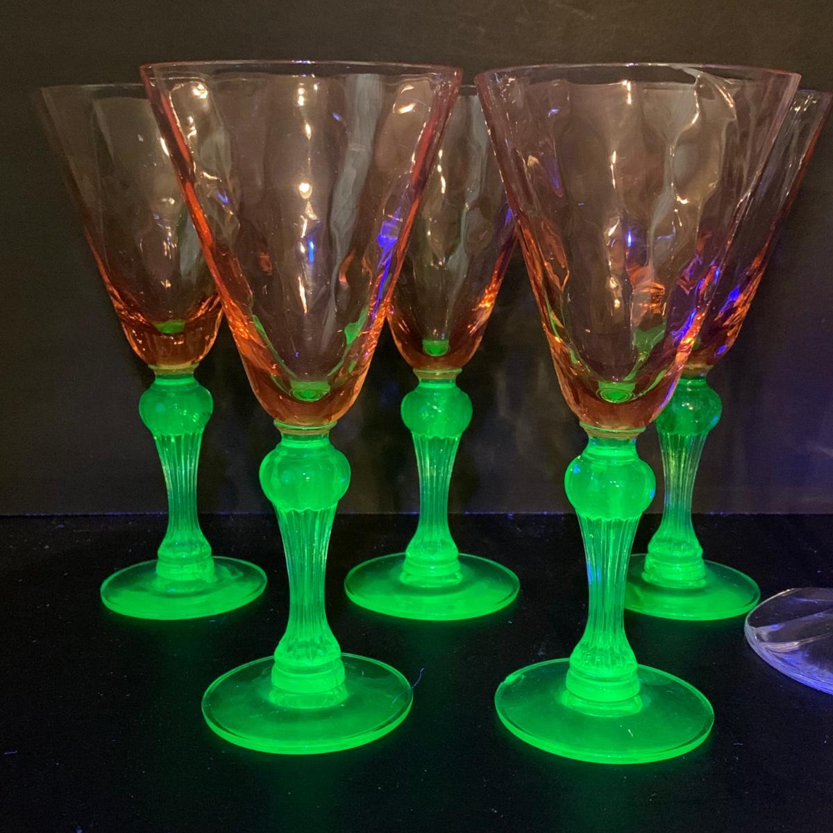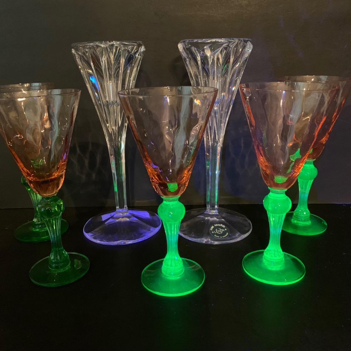 LOT 127R: Vintage Tiffin Depression Glass Watermelon Pink w/Uranium Glass Stems and Lenox Candle Holders,Germany