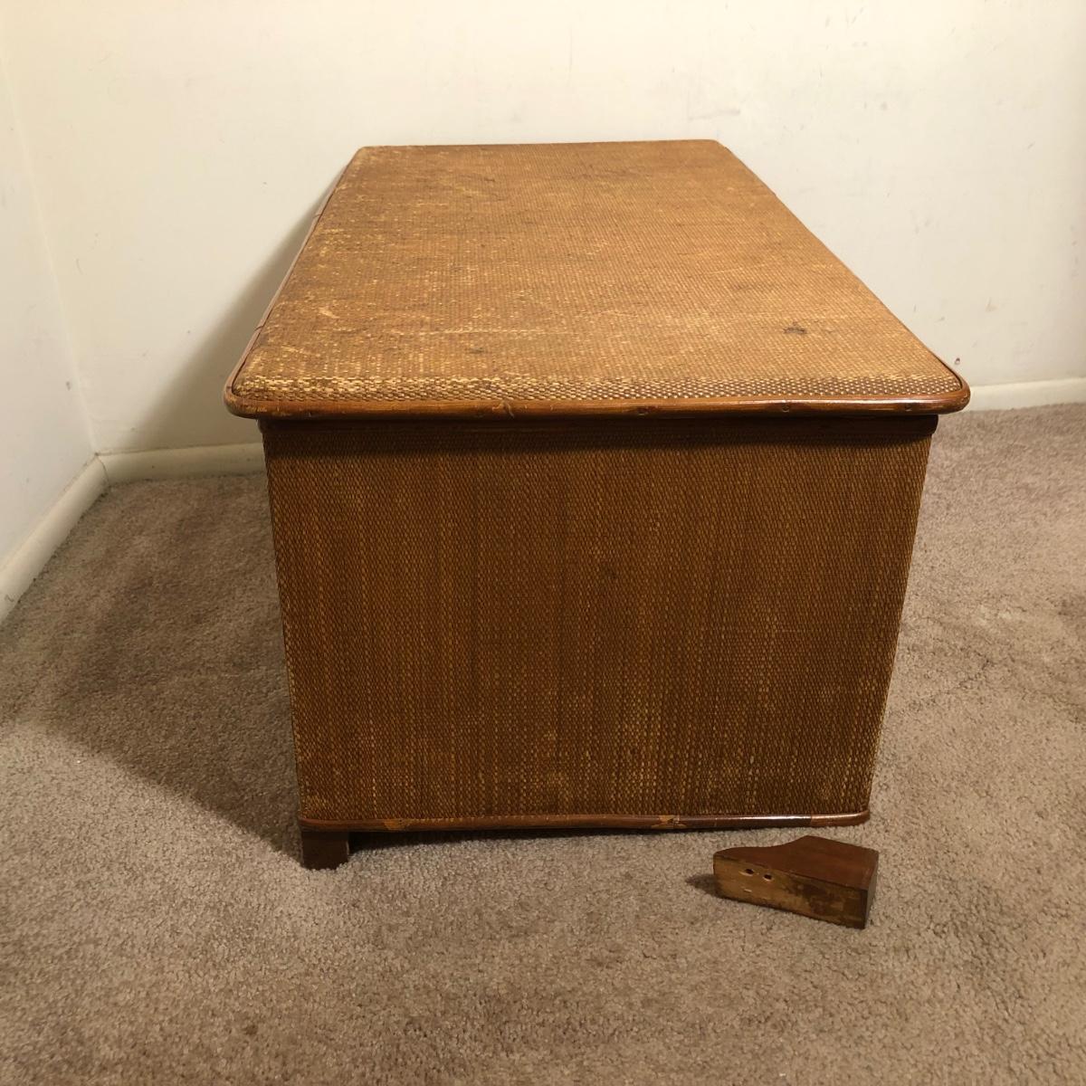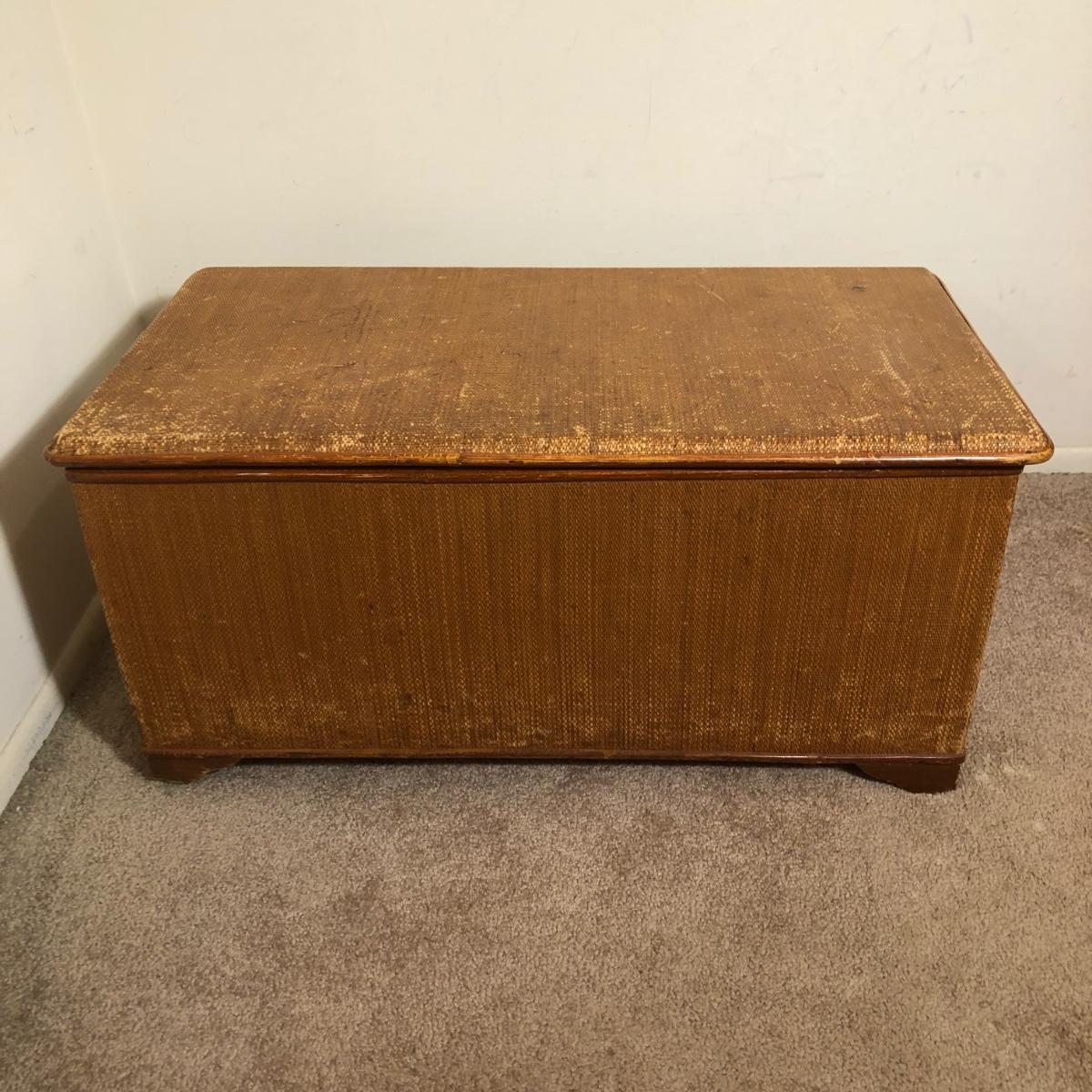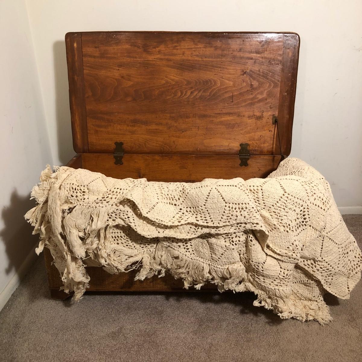 LOT 138M: Vintage Cane & Wood Chest w/ Lace Blanket