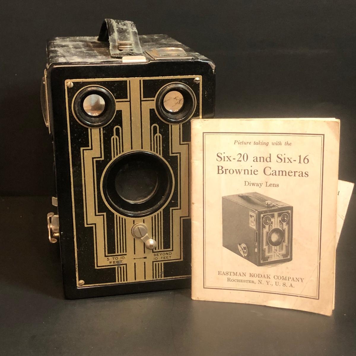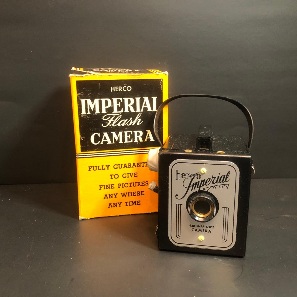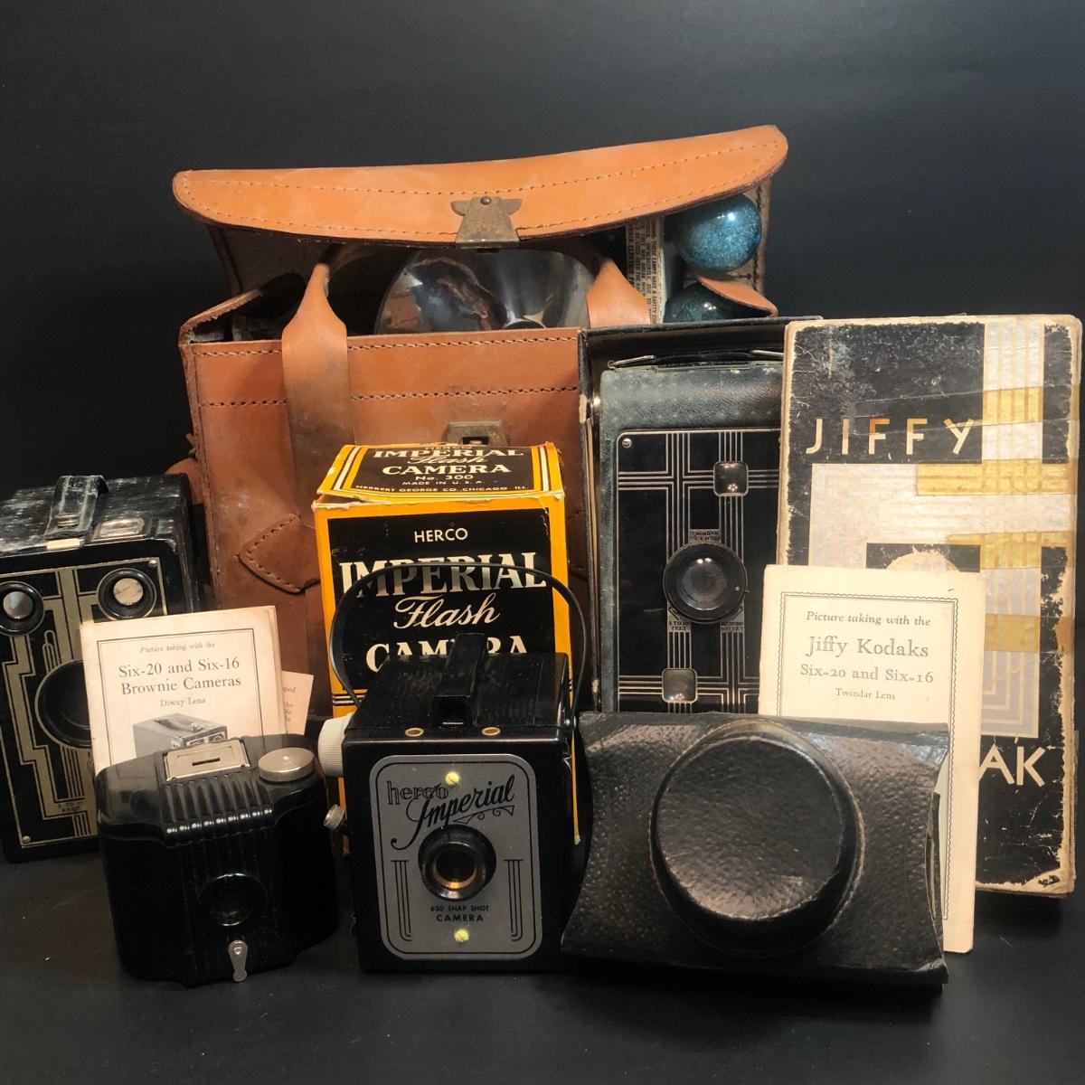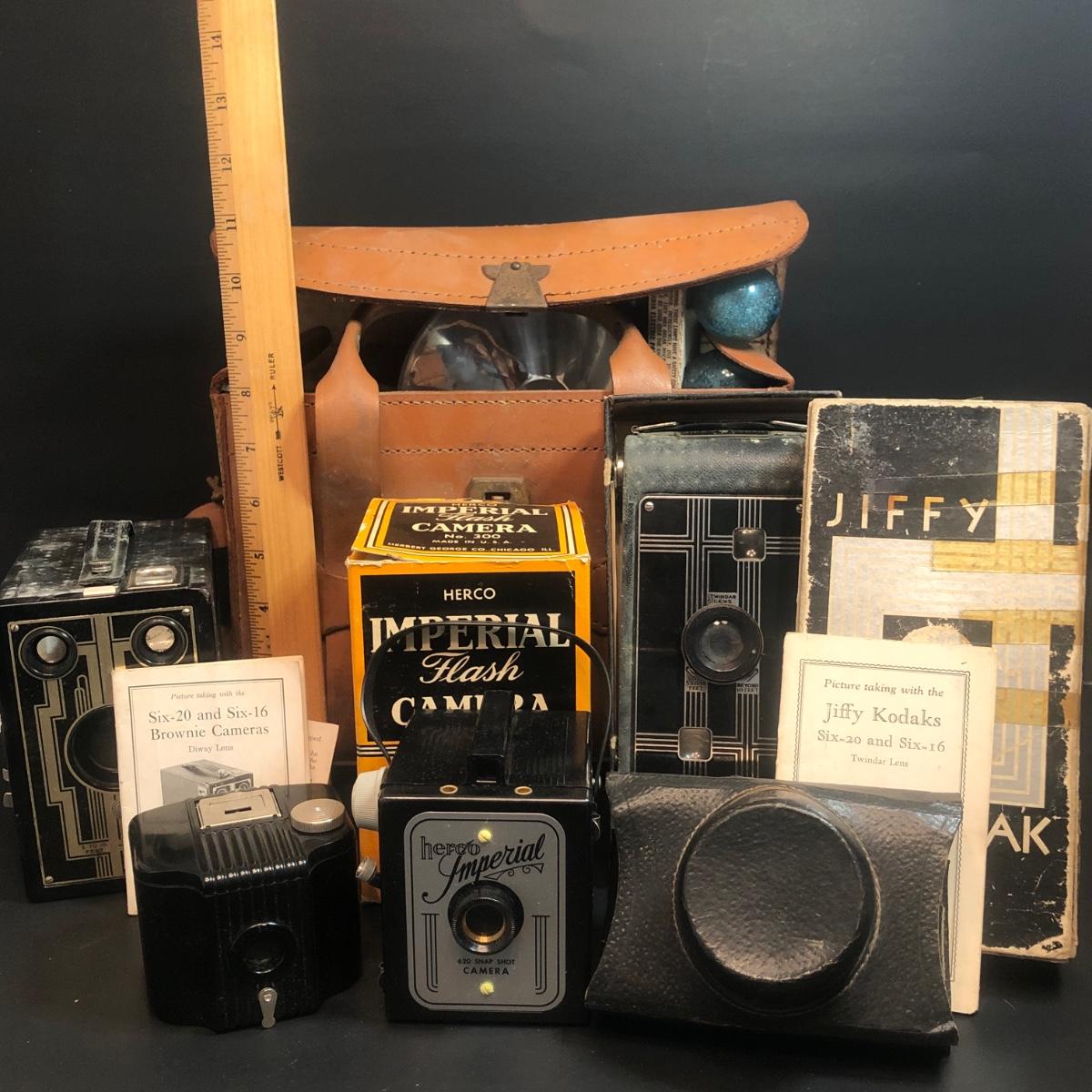 LOT 152M: Vintage Cameras w/ Leather Camera Bag & Argus Flash - Jiffy Kodak Six-16 (w/box & Manual), Herco Imperial 620 SnapShot (w/ Box), Kodak Baby Brownie, Falcon Mini Cam JR, Kodak Six-16 Brownie