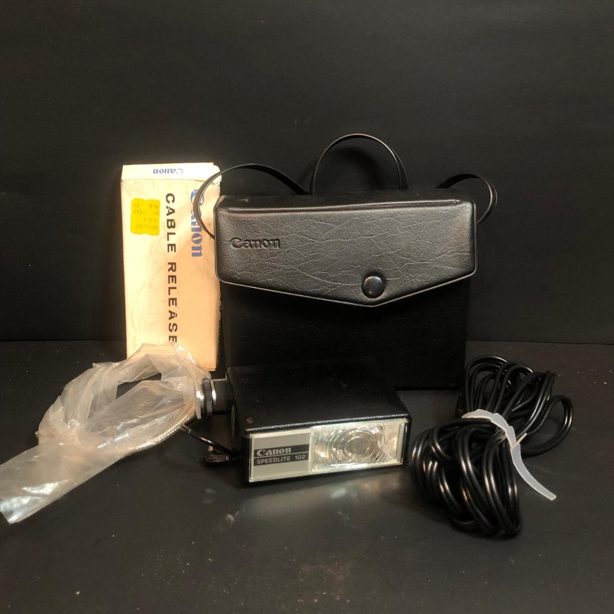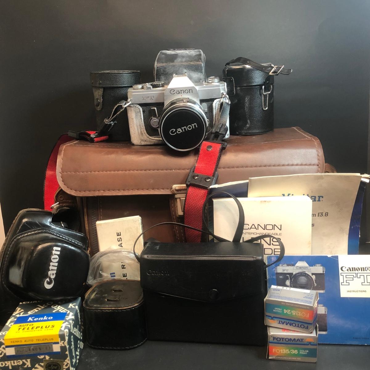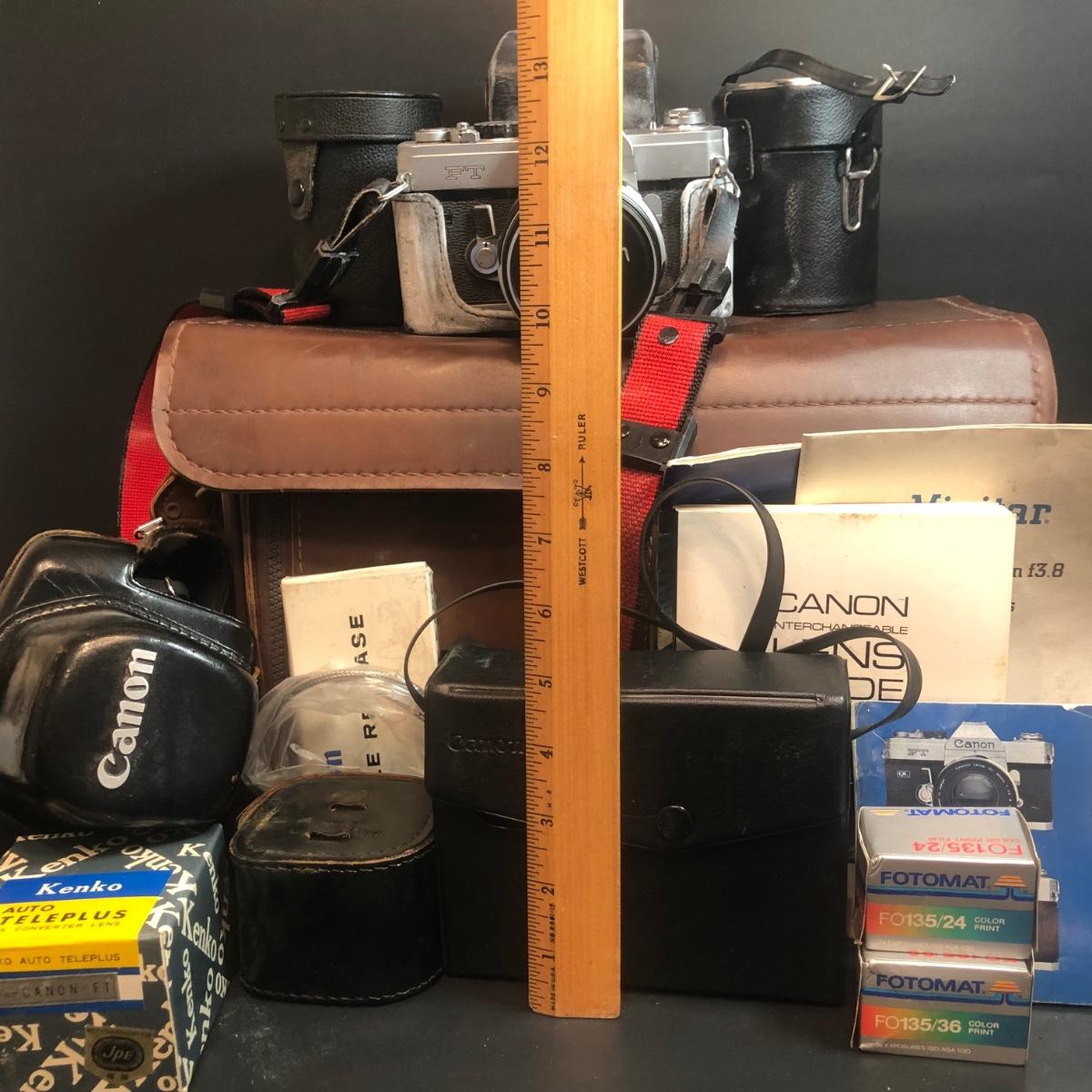 LOT 153M: Canon FT 35mm Camera w/ Canon Speedlite 102, Kenko Fisheye 180 Lens, Vivitar Wide Angle, 2 Packs of 35mm Film & More Camera Ccessories