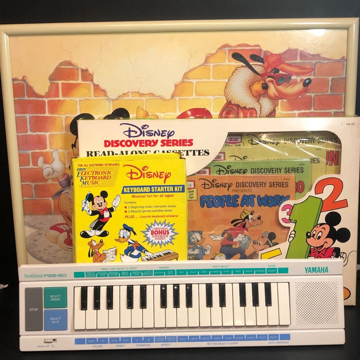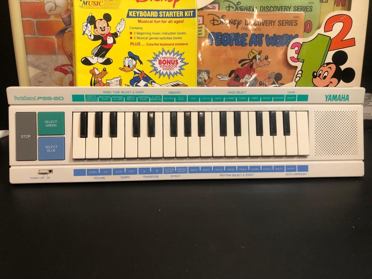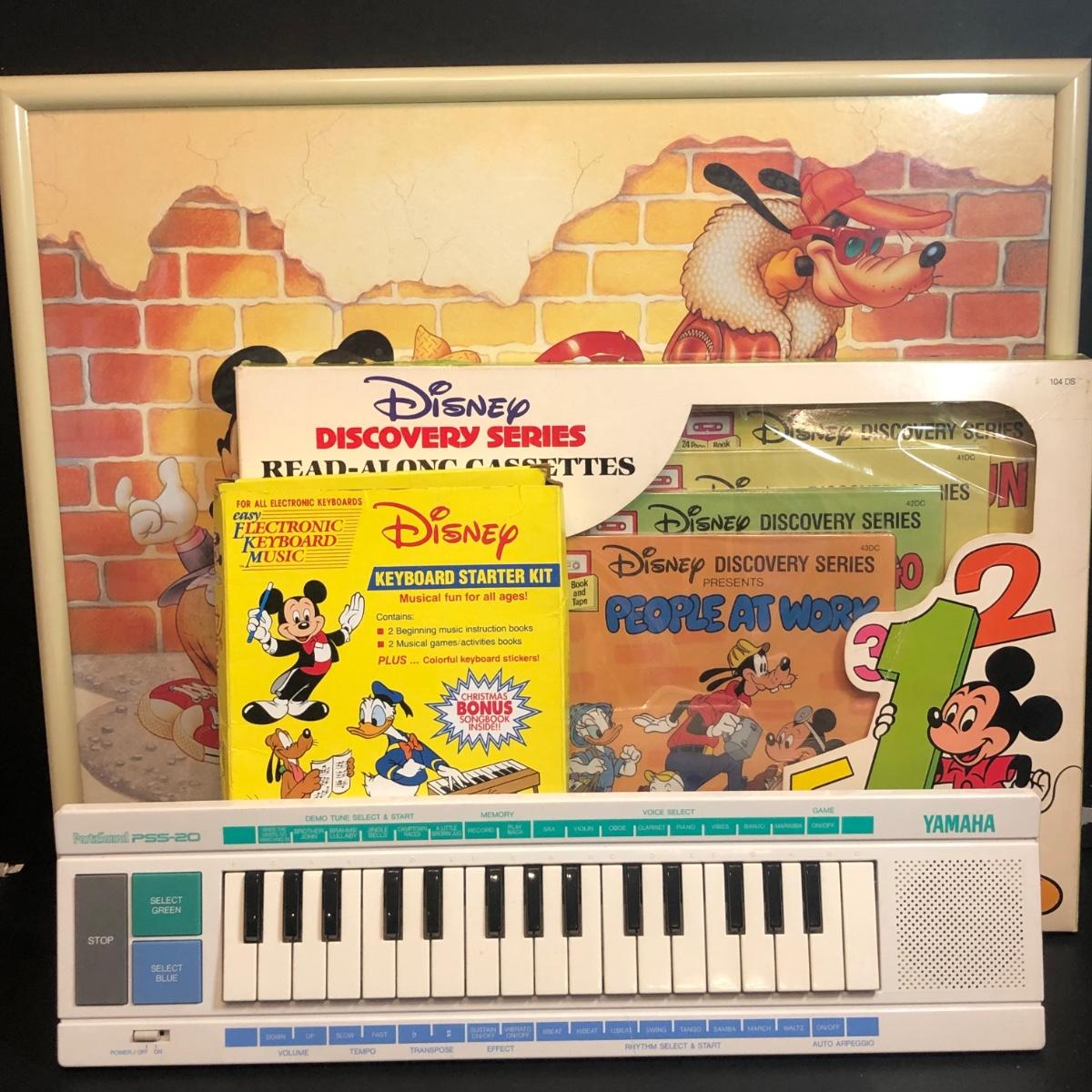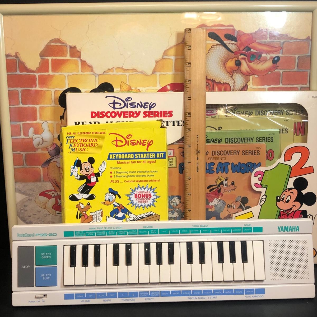 LOT 158M: Yamaha PortaSound PSS-20 Keyboard w/ Vintage Disney Keyboard Starter Kit, Disney Discovery Series Read Along Cassettes (NIB) & 80s/90s Framed Mickey & Friends Poster