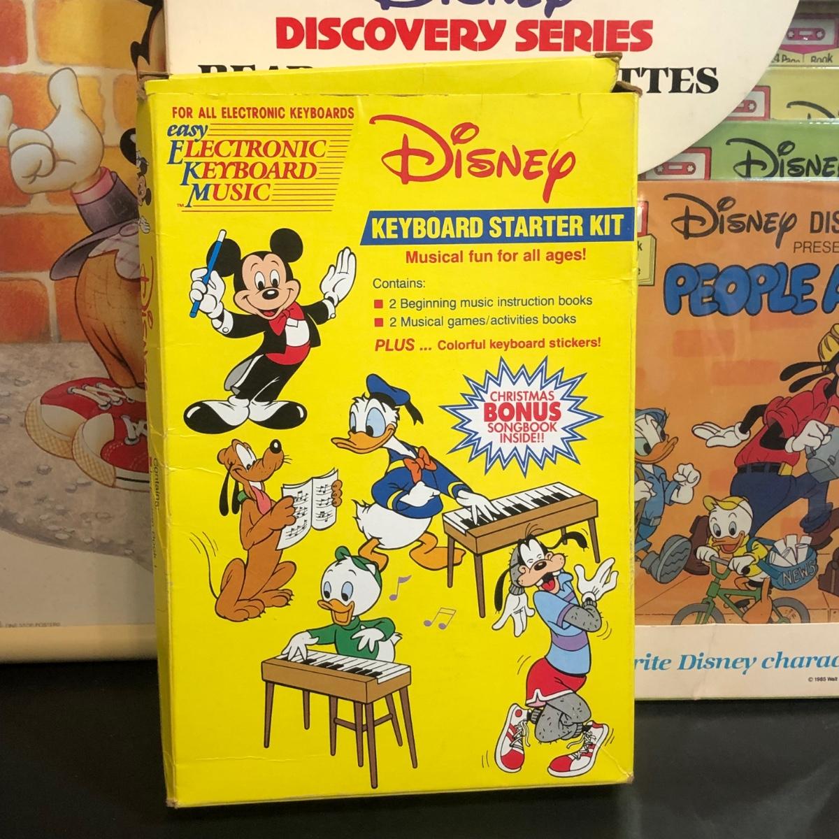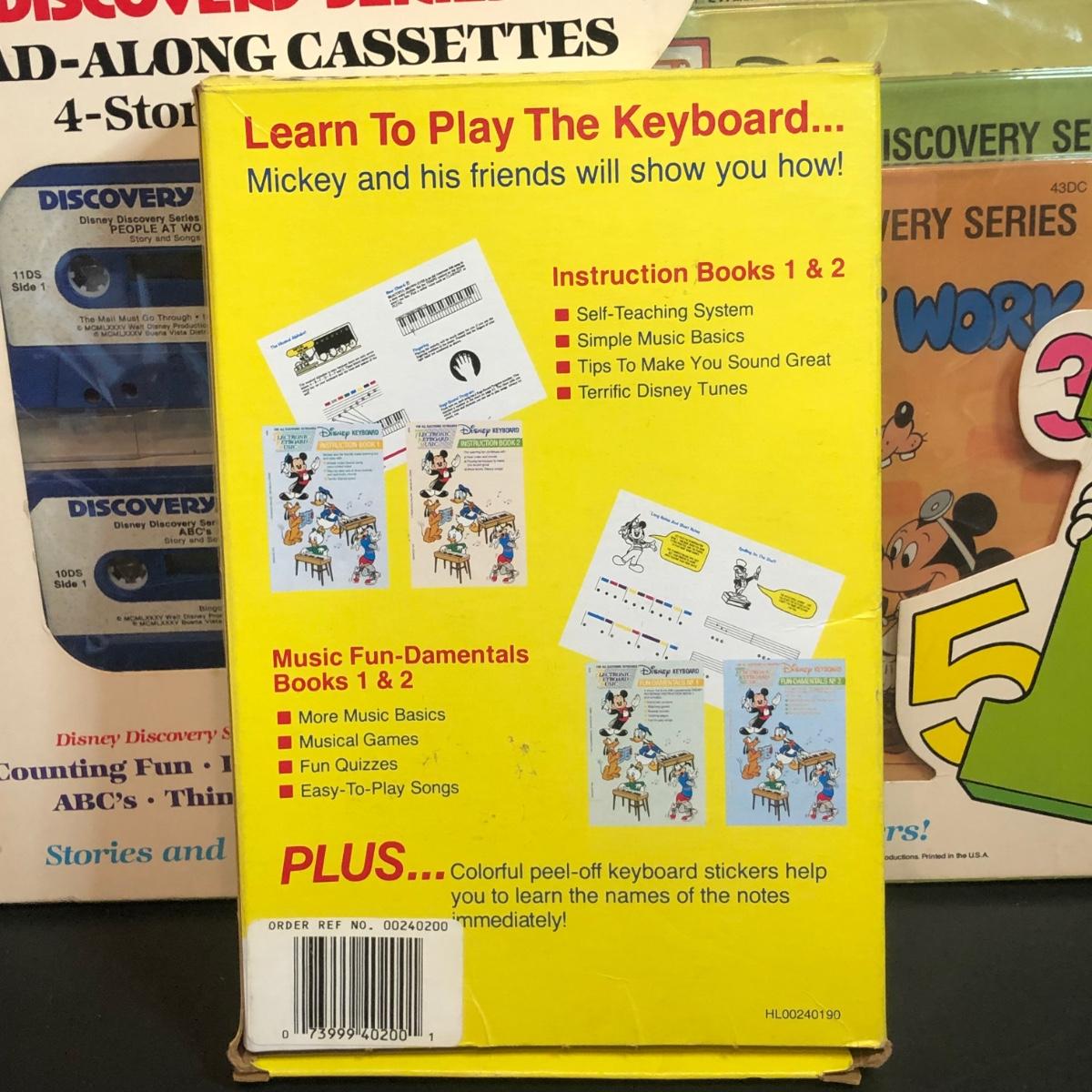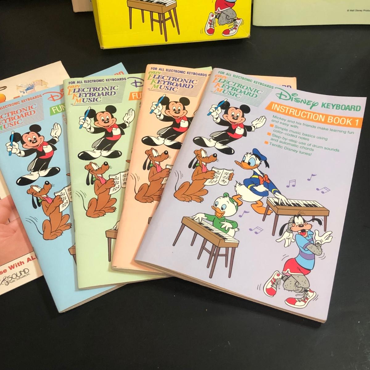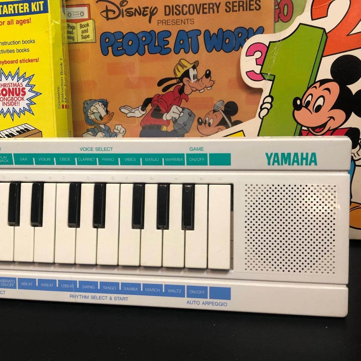 LOT 158M: Yamaha PortaSound PSS-20 Keyboard w/ Vintage Disney Keyboard Starter Kit, Disney Discovery Series Read Along Cassettes (NIB) & 80s/90s Framed Mickey & Friends Poster