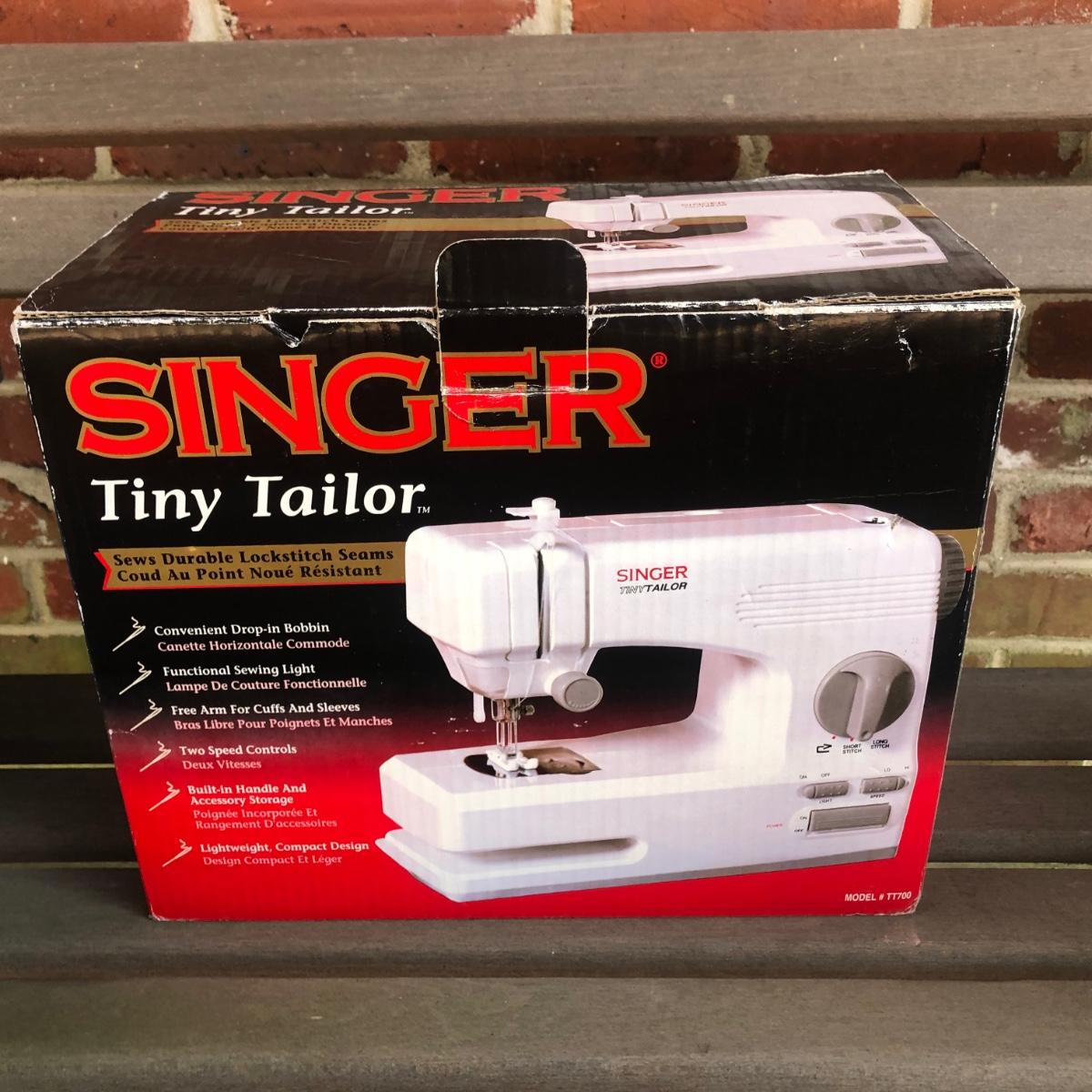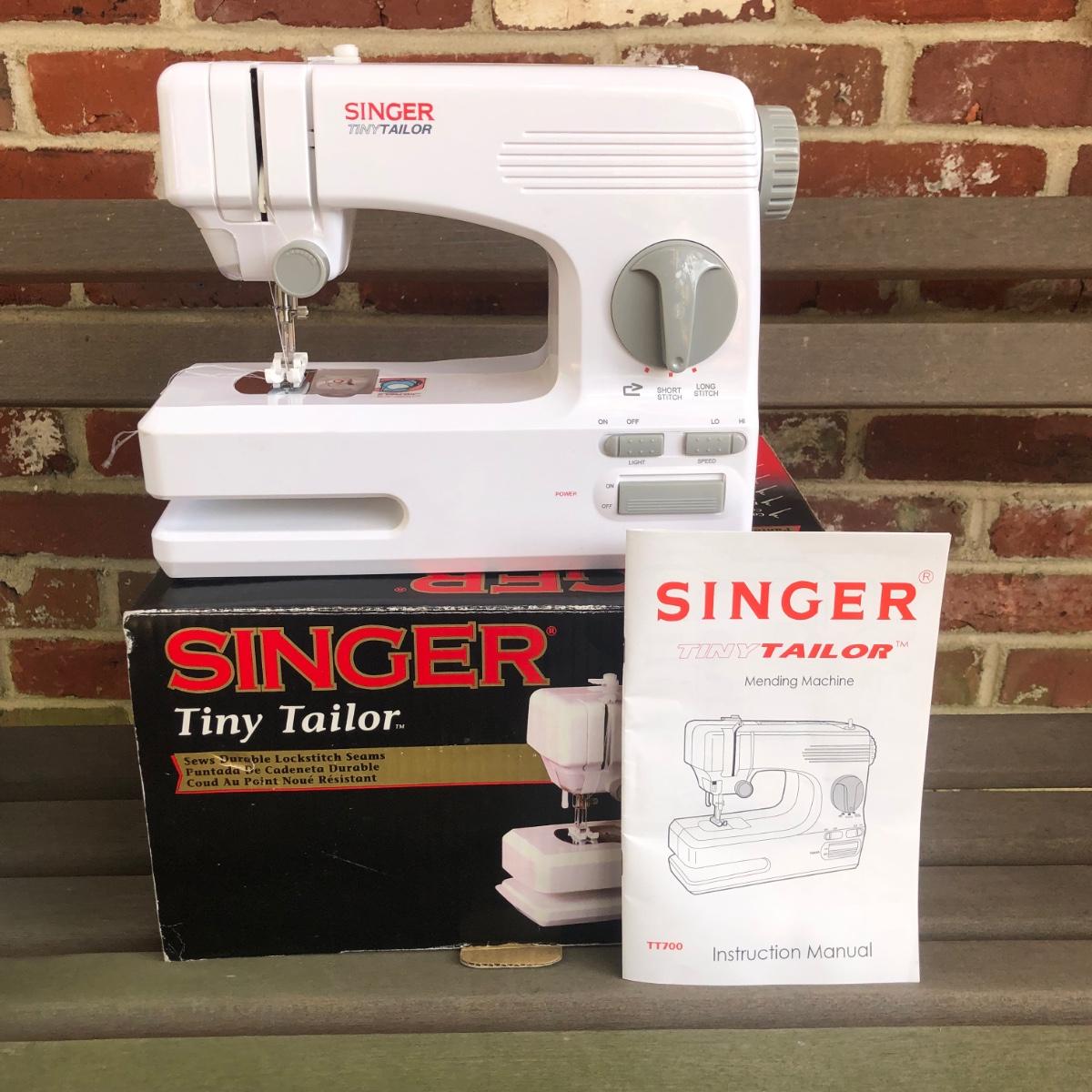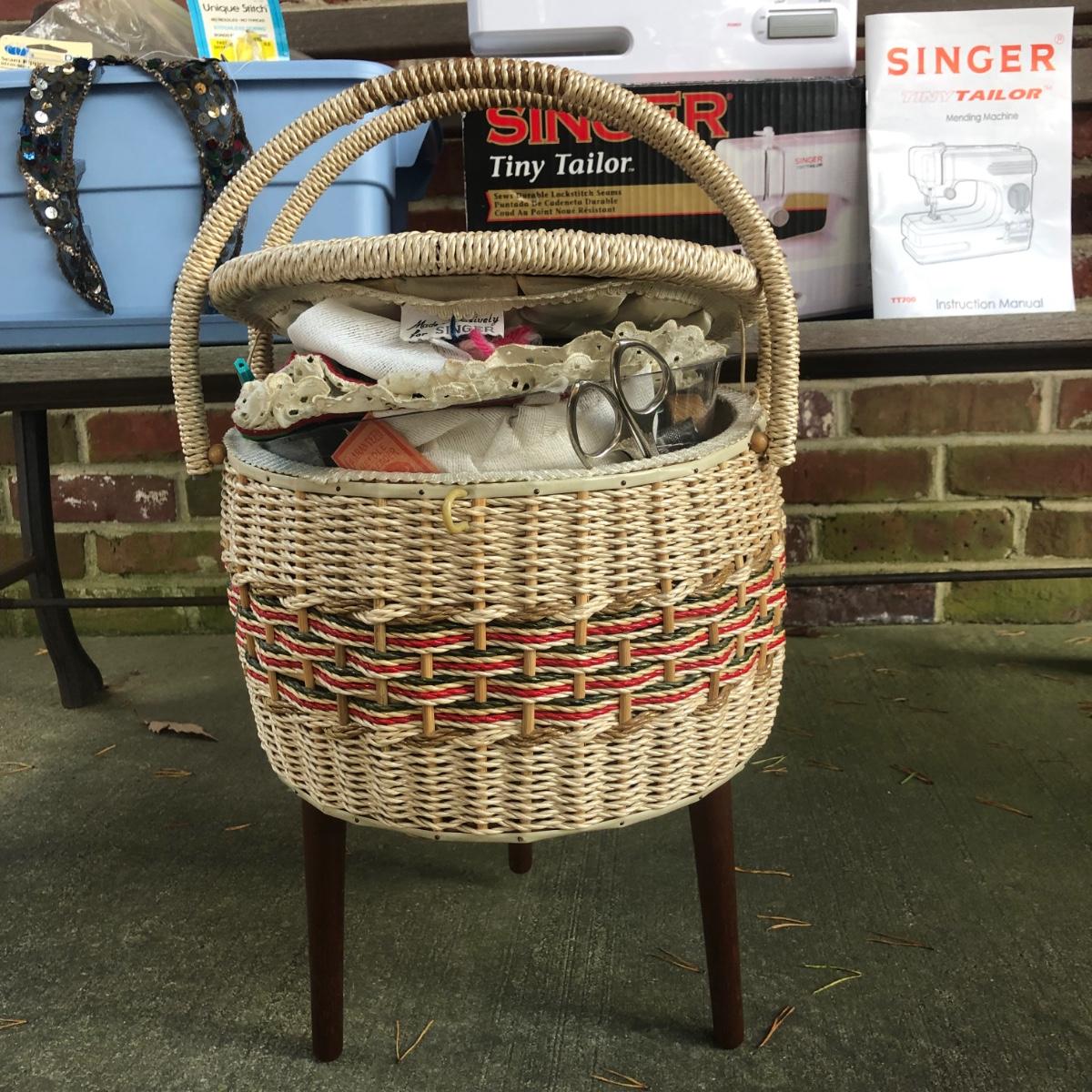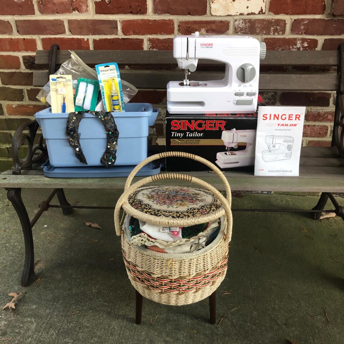 LOT 160M: Singer Tiny Tailor Mending Machine TT700 w/ Box & Manual & A Plethora of Sewing Supplies & Singer Sewing Basket Stand