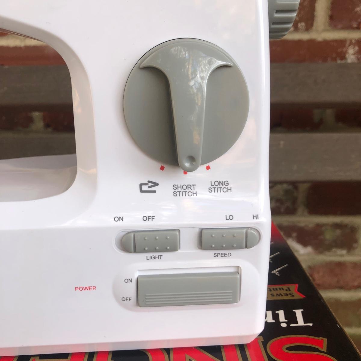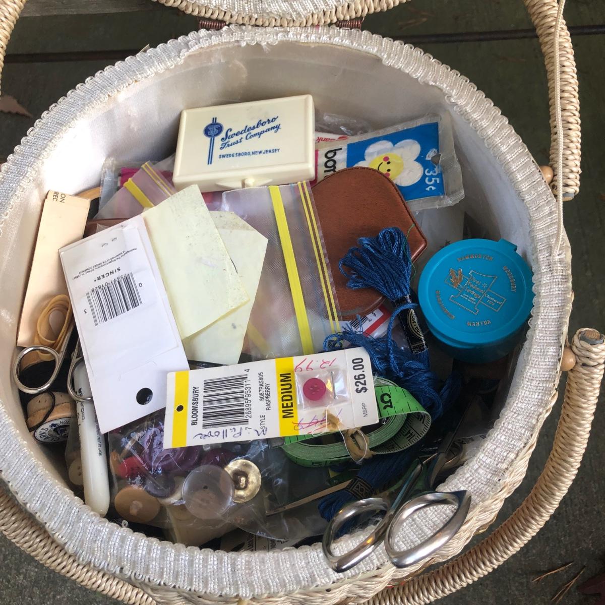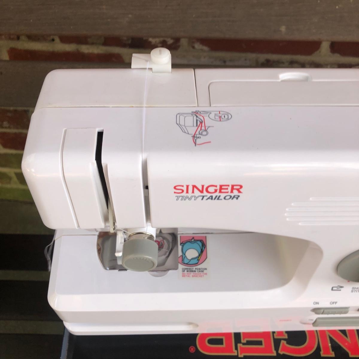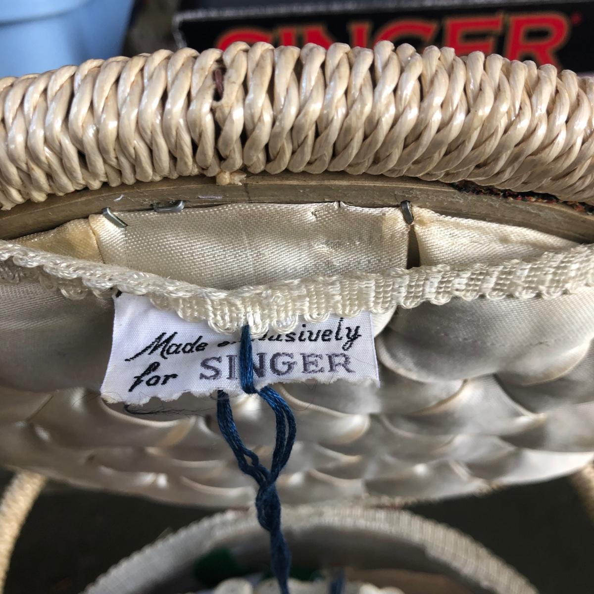 LOT 160M: Singer Tiny Tailor Mending Machine TT700 w/ Box & Manual & A Plethora of Sewing Supplies & Singer Sewing Basket Stand