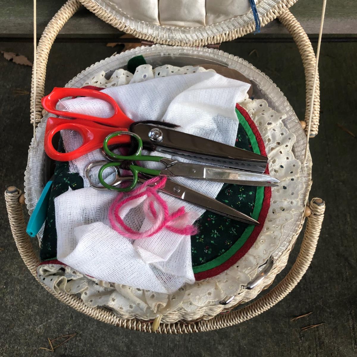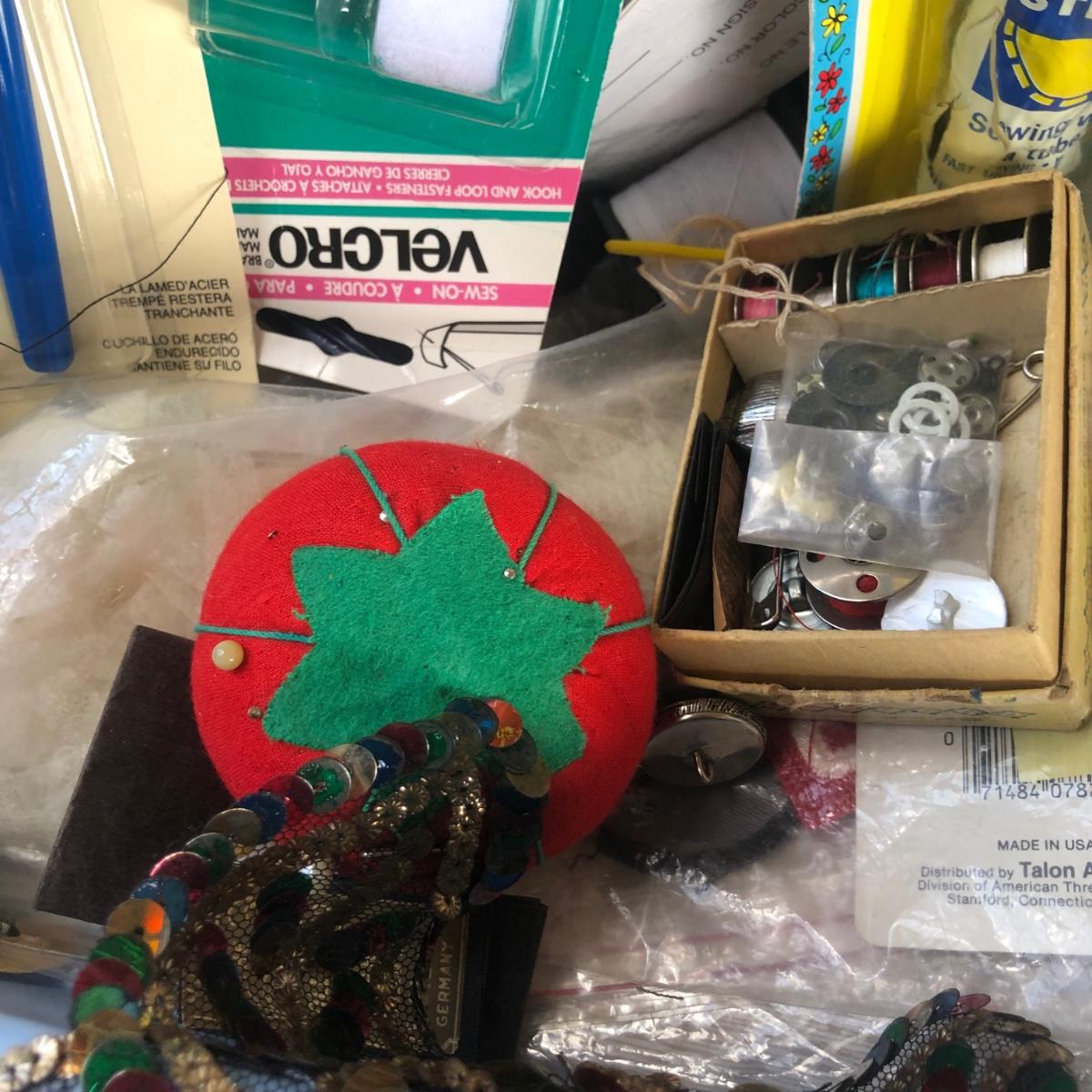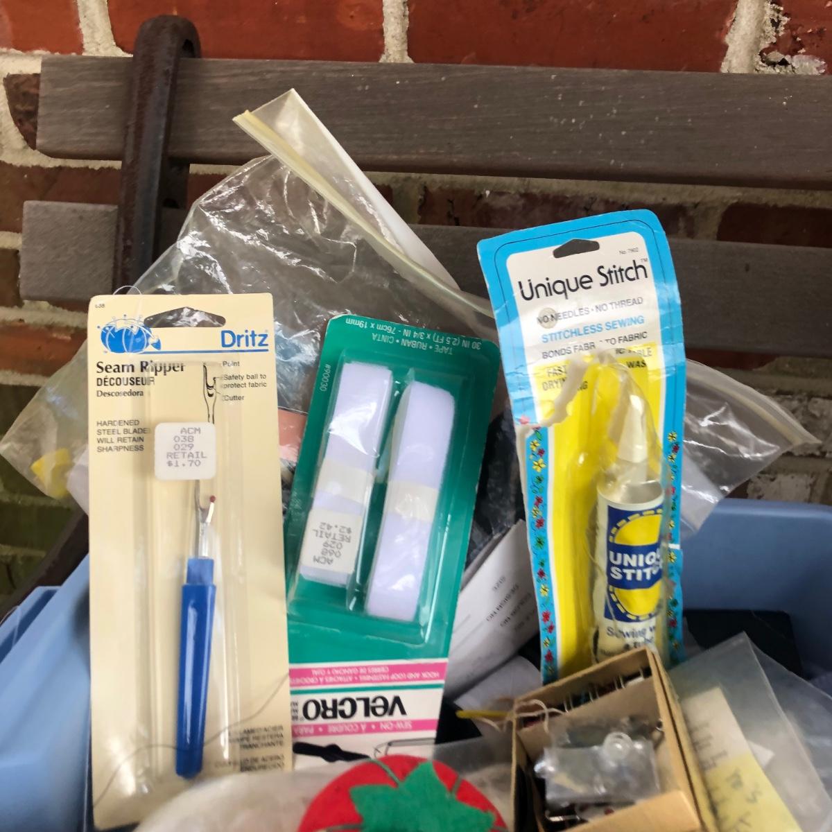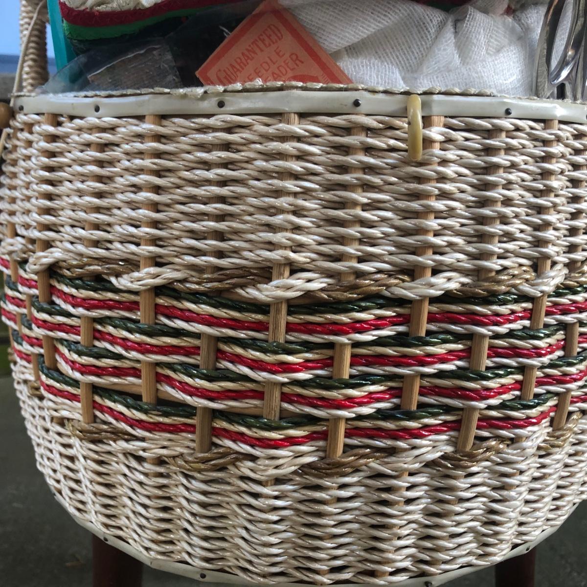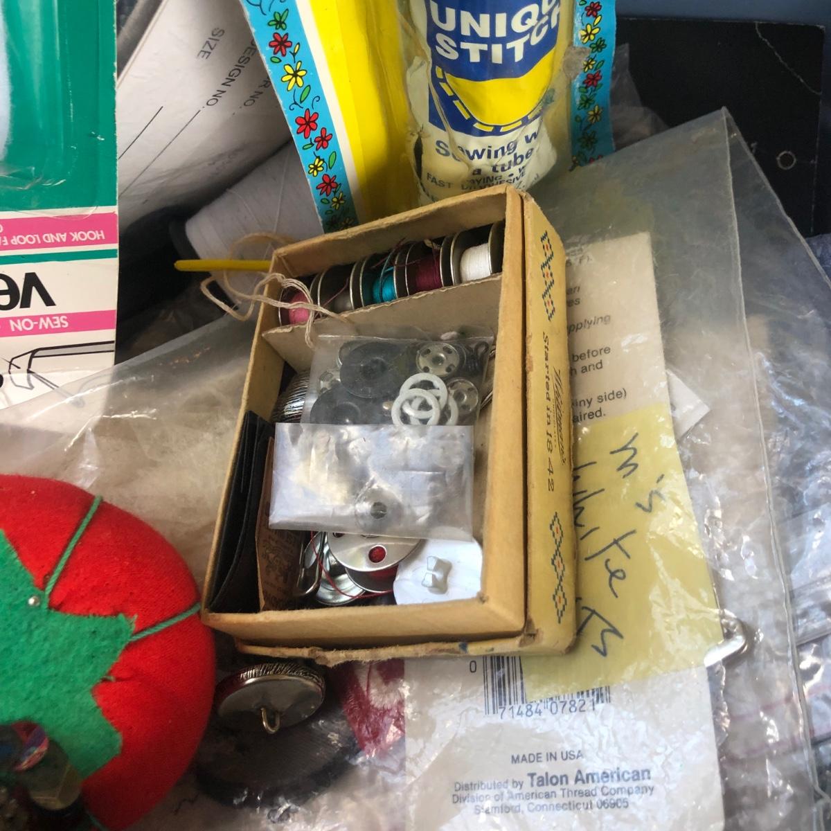 LOT 160M: Singer Tiny Tailor Mending Machine TT700 w/ Box & Manual & A Plethora of Sewing Supplies & Singer Sewing Basket Stand