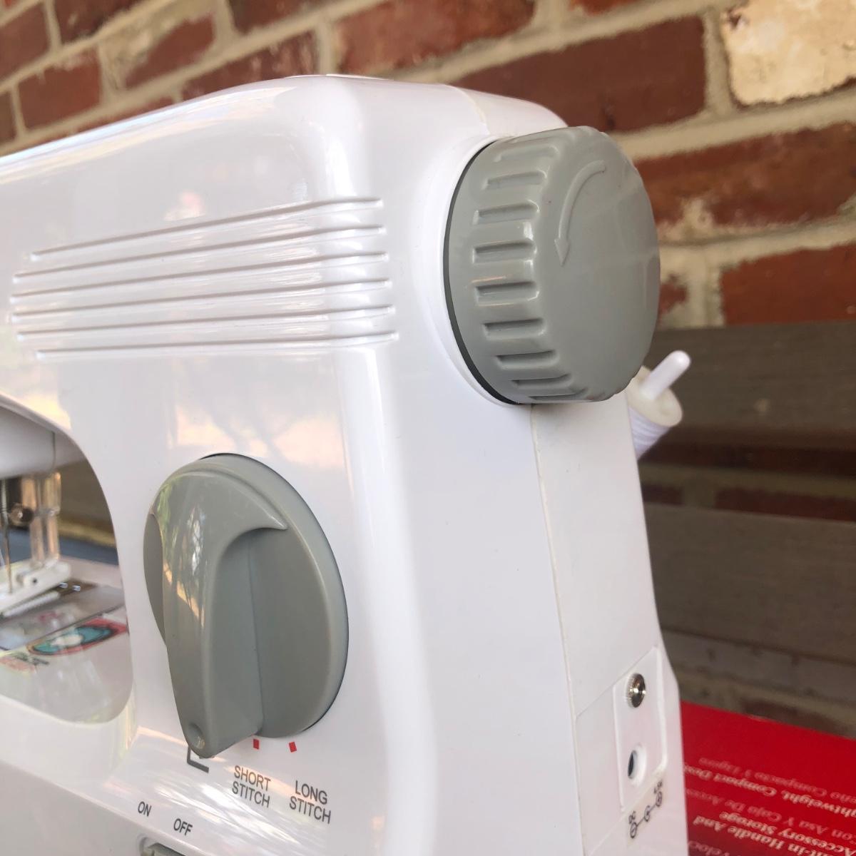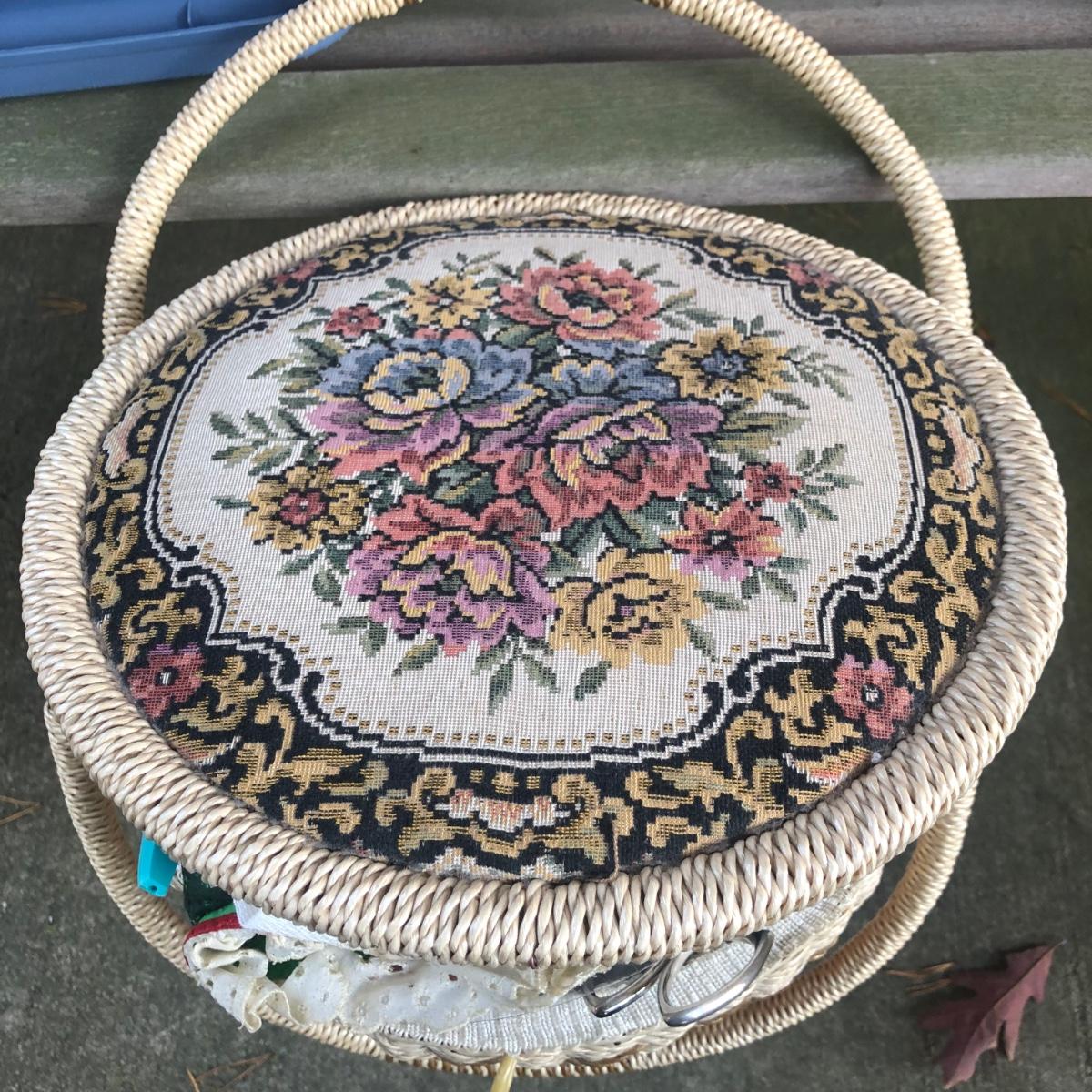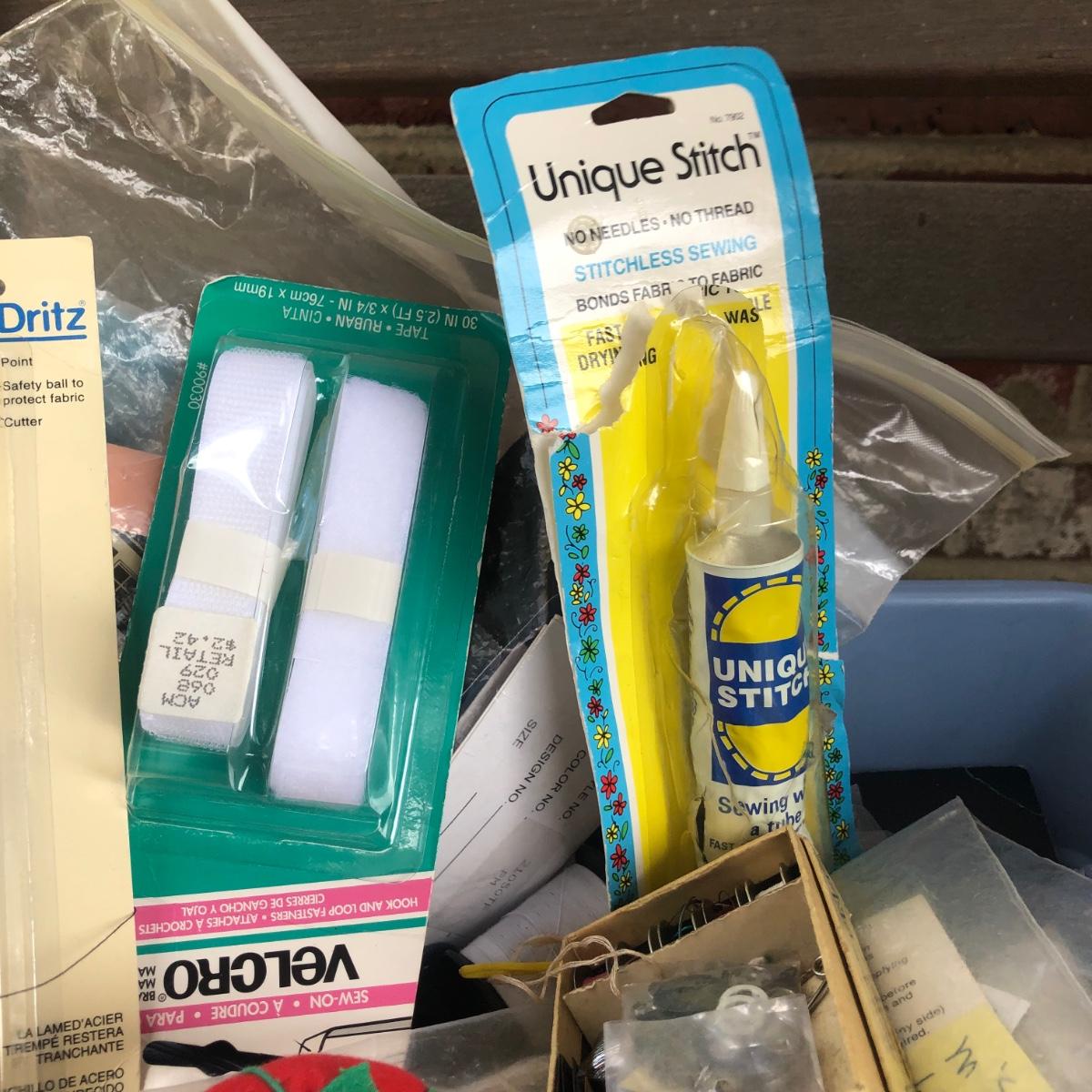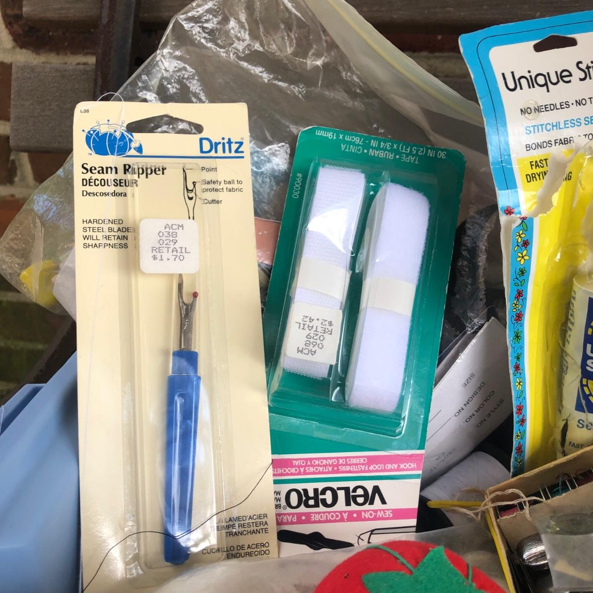 LOT 160M: Singer Tiny Tailor Mending Machine TT700 w/ Box & Manual & A Plethora of Sewing Supplies & Singer Sewing Basket Stand