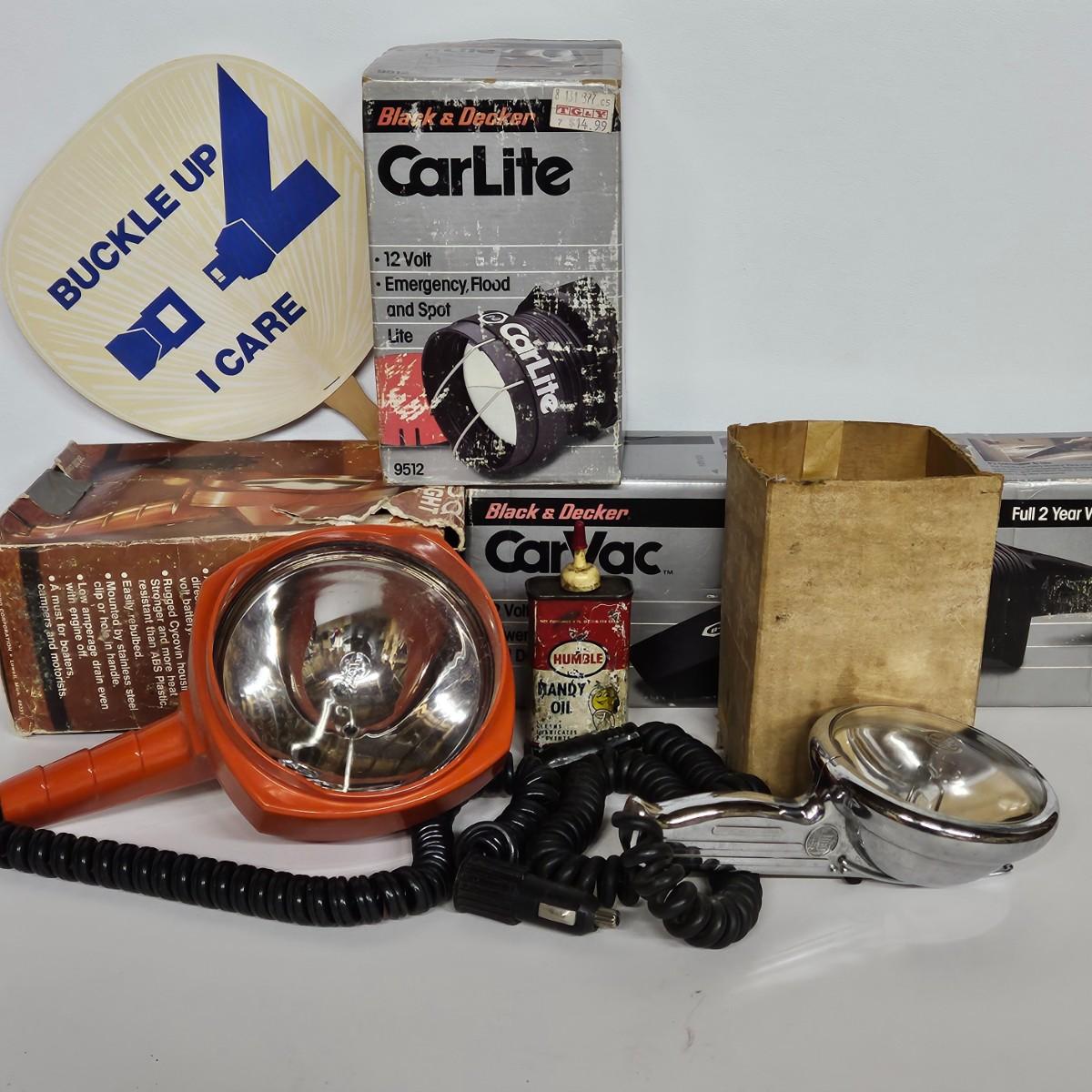 LOT 167S: Car Accessories Collection with Spotlights, Vacuum & PSA Sign