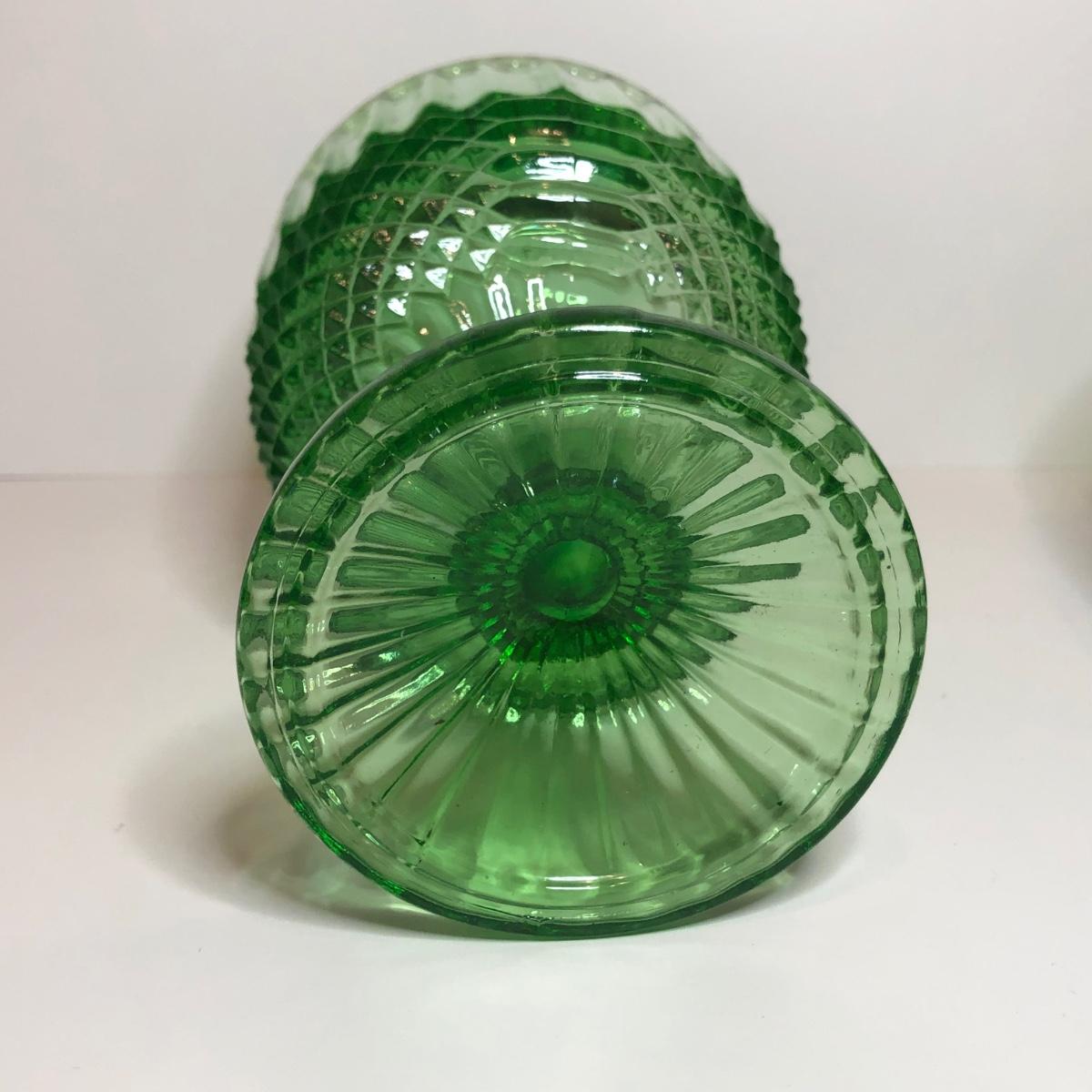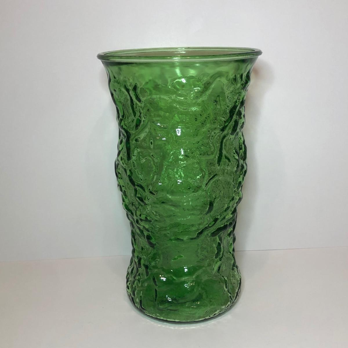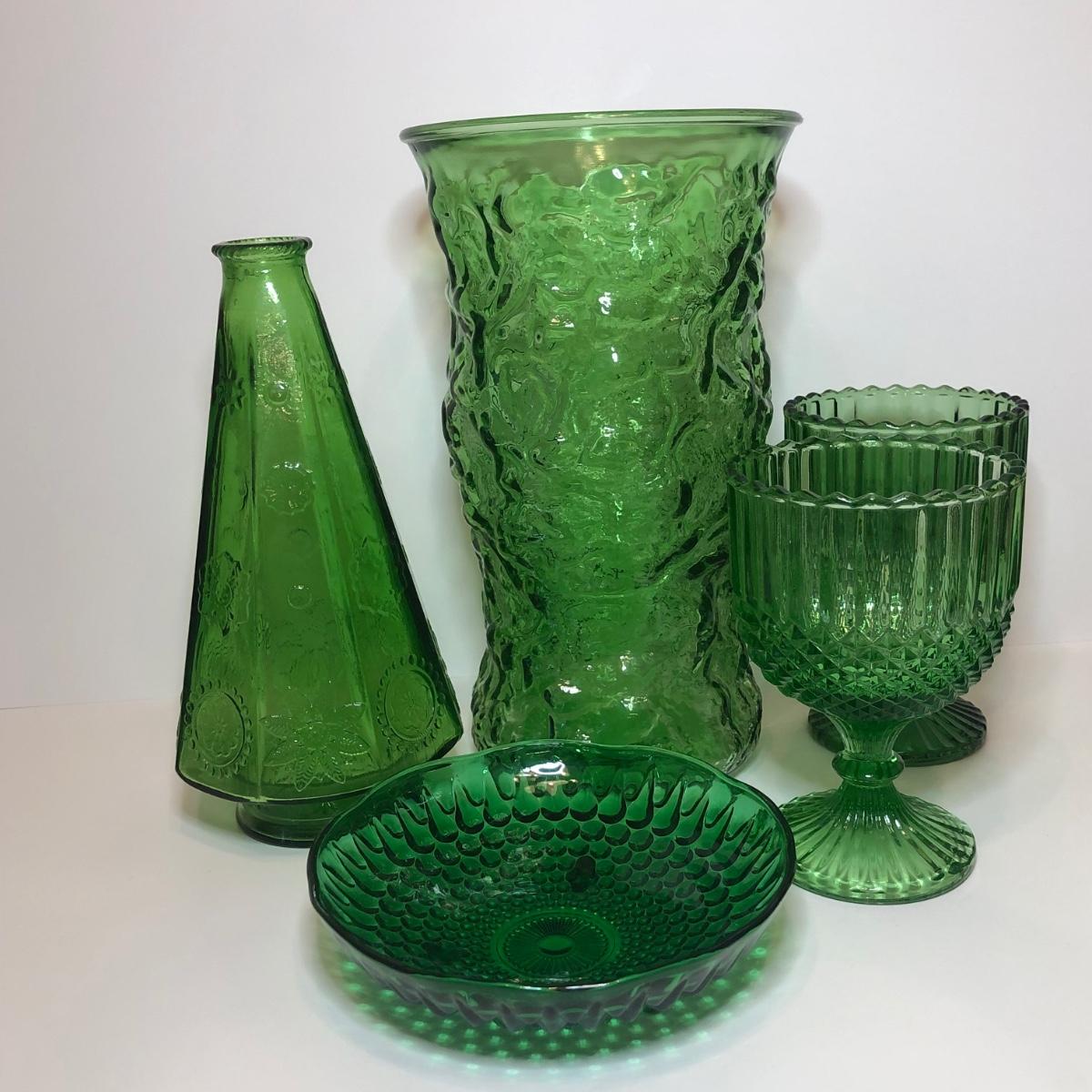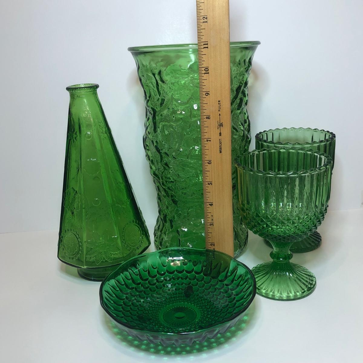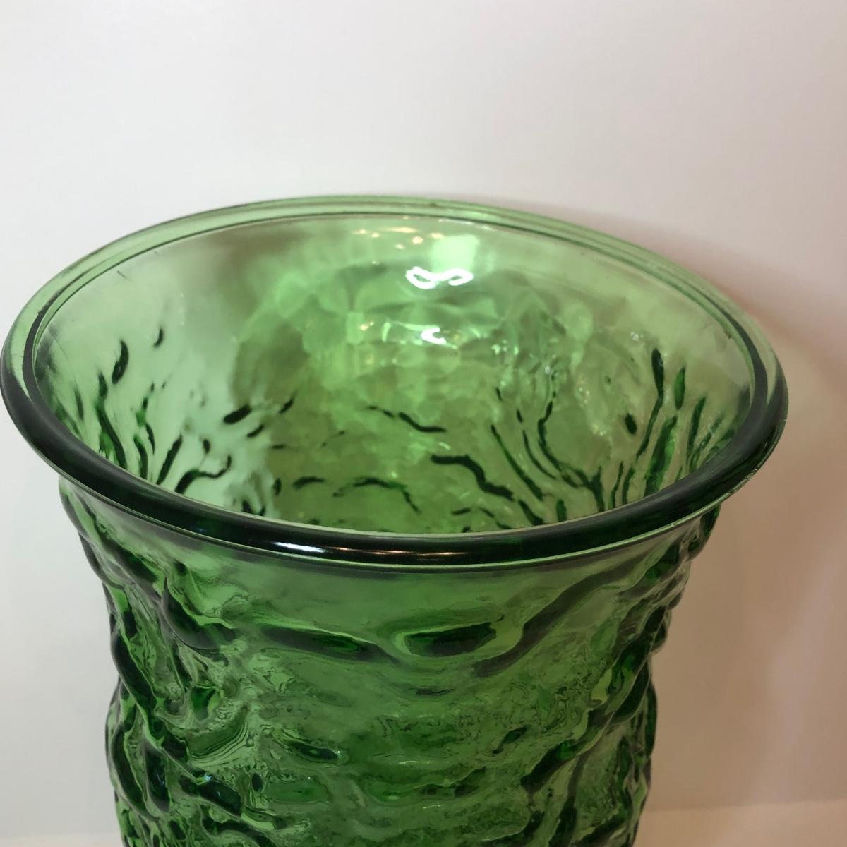 LOT 163M: Large Vintage Avocado Textured Glass Vase, Footed Green Wheaton Pressed Glass Tree Shaped Vase, Hobnail Green Footed Bowl & Vintage Green Glass Goblets