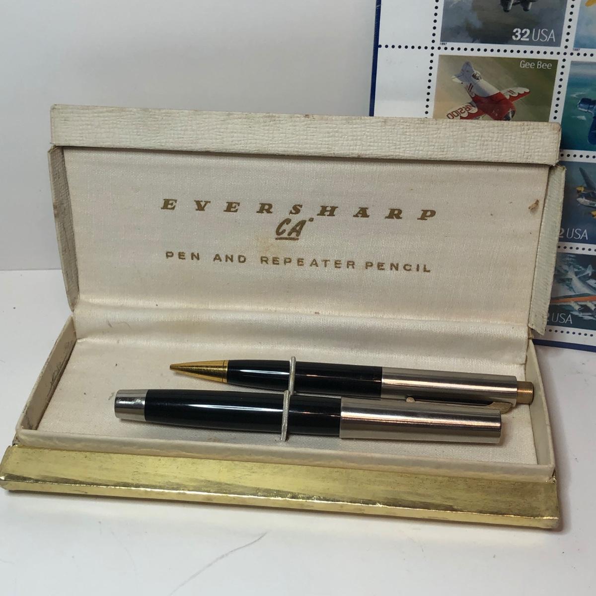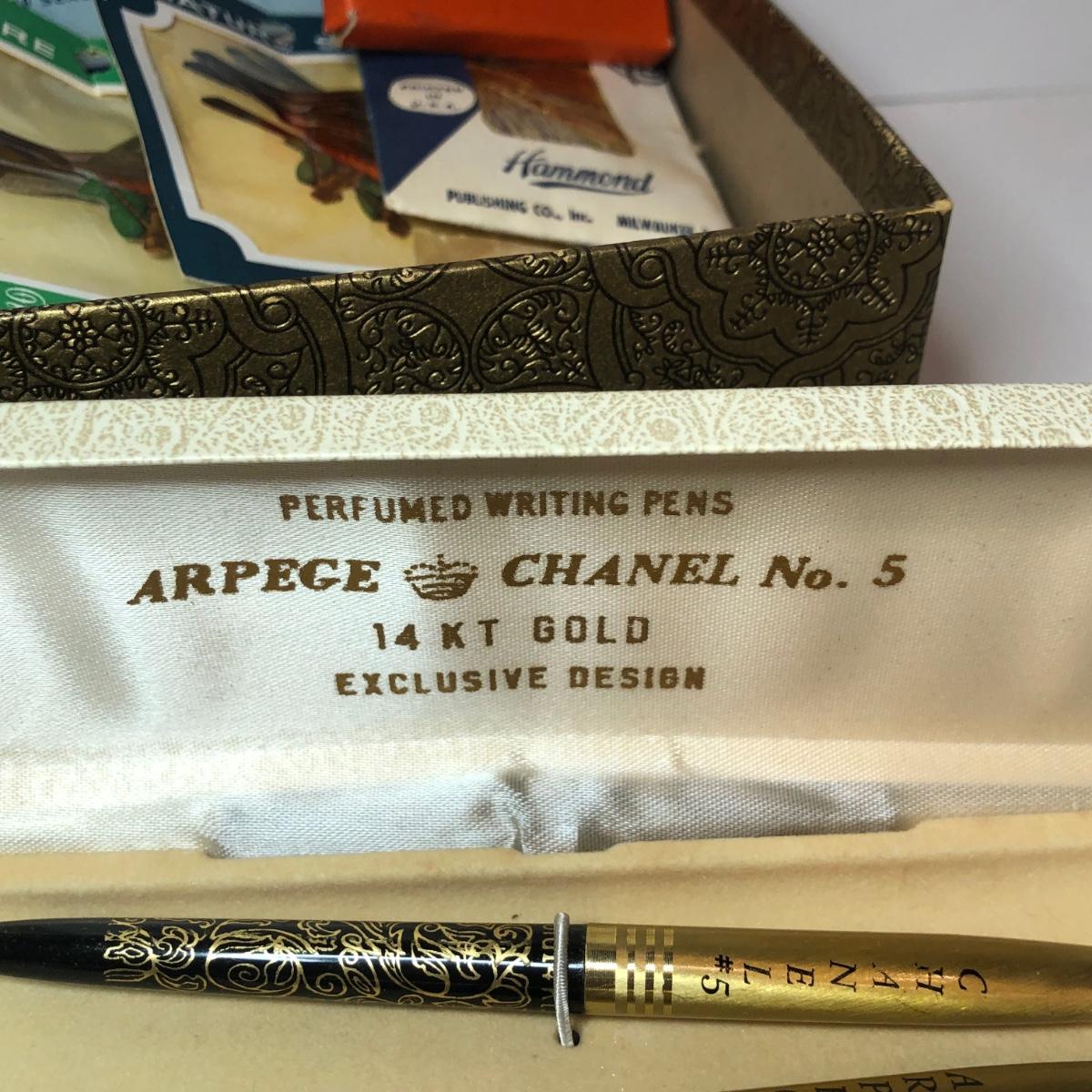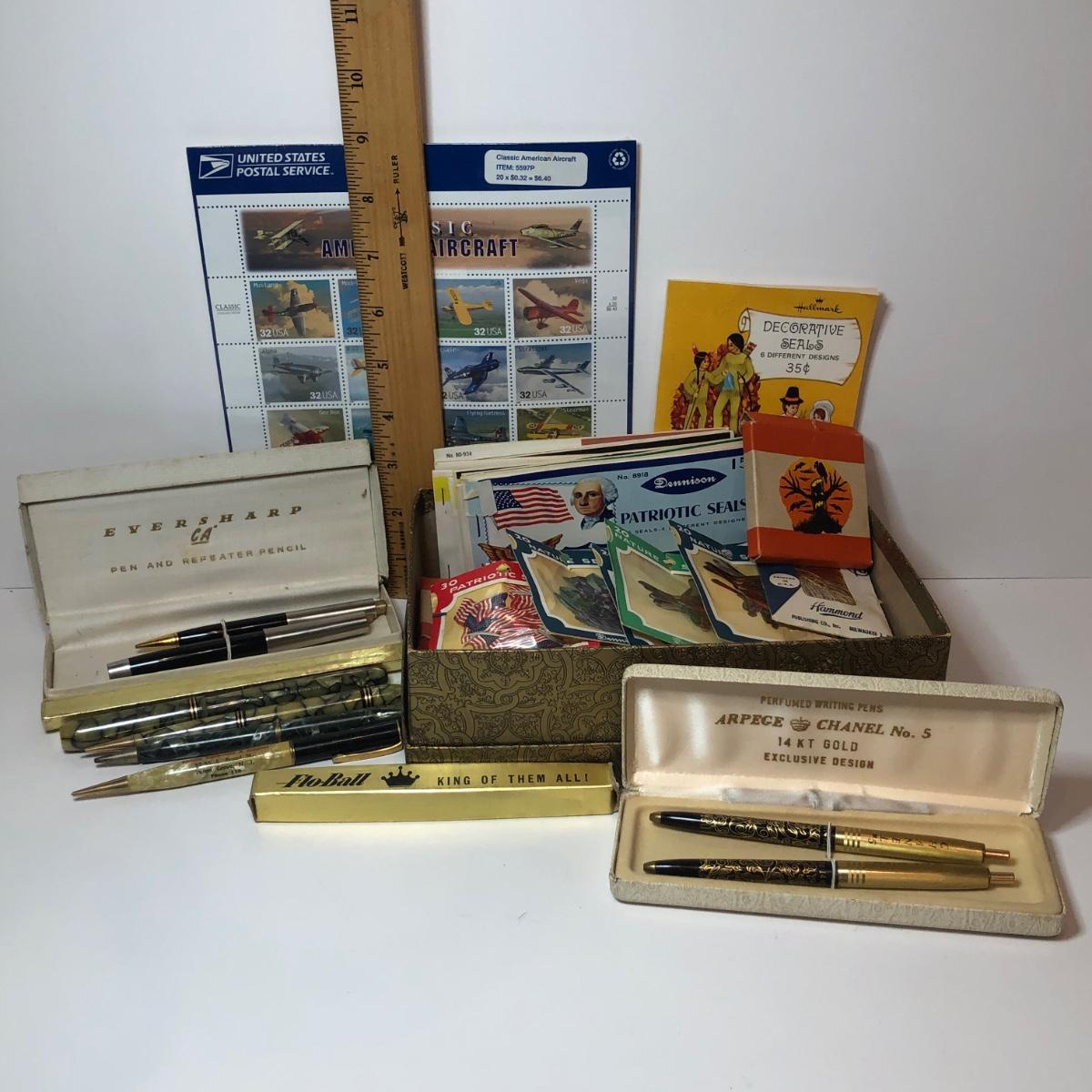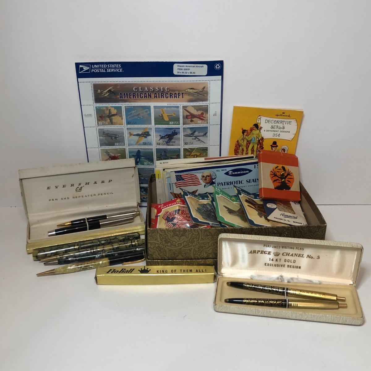 LOT 183M: Arpege Chanel No 5 Perfumed 14kt Gold Pen Set, USPS Classic American Aircraft Stamps, Vintage Decorative Seals & More