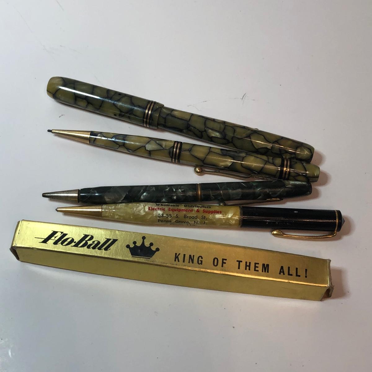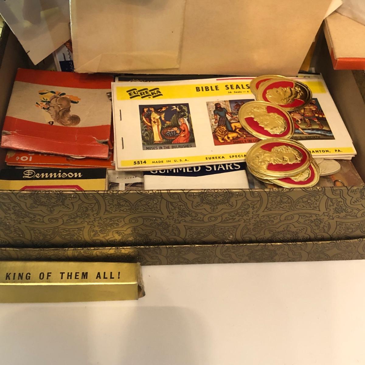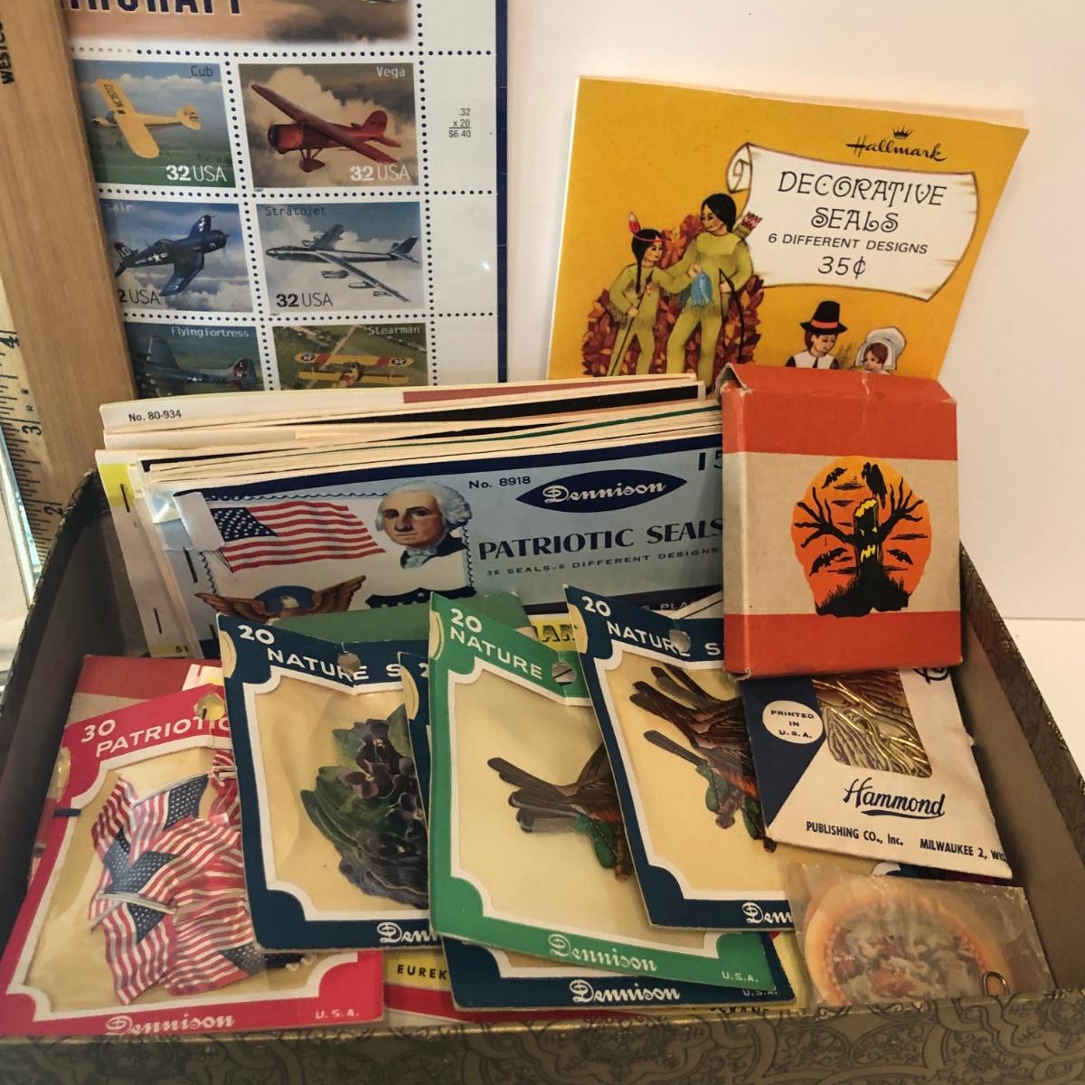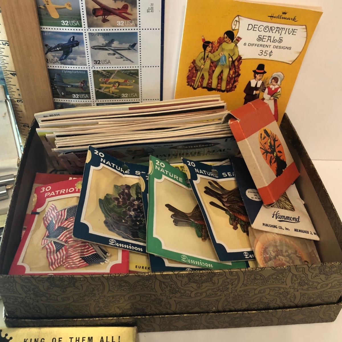 LOT 183M: Arpege Chanel No 5 Perfumed 14kt Gold Pen Set, USPS Classic American Aircraft Stamps, Vintage Decorative Seals & More