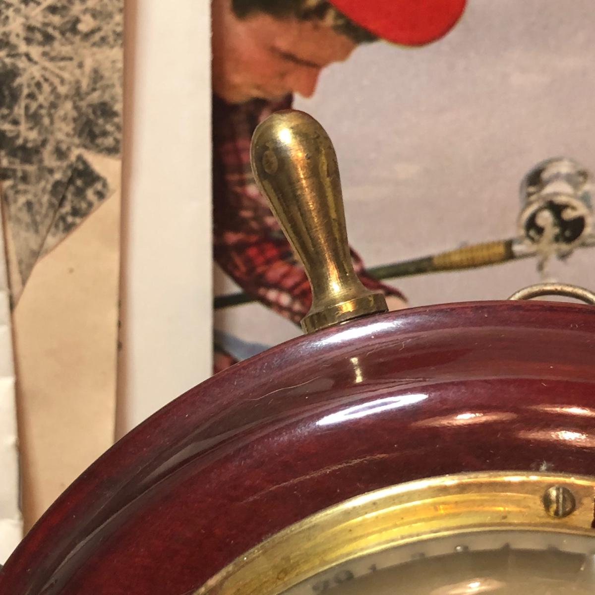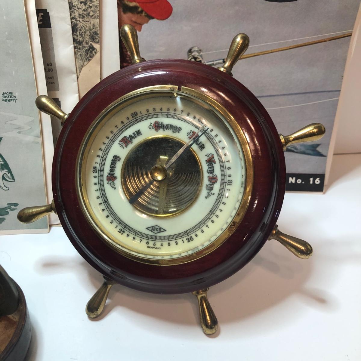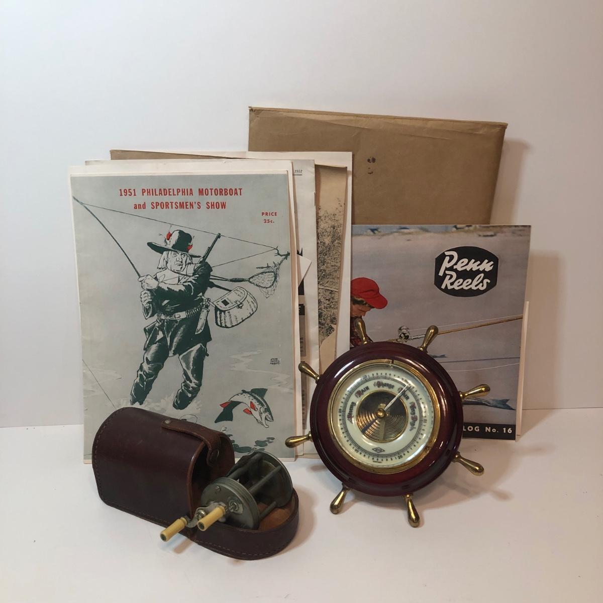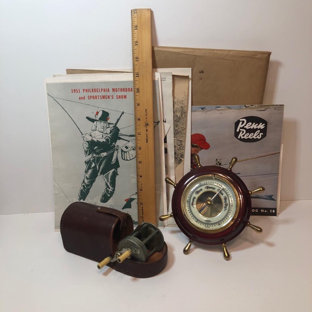 LOT 184M: ATCO German Ships Wheel Nautical Barometer, Vintage James Heddon's Sons 3-35 Fishing Reel in Case & Vintage Fishing/Boat Ephemera