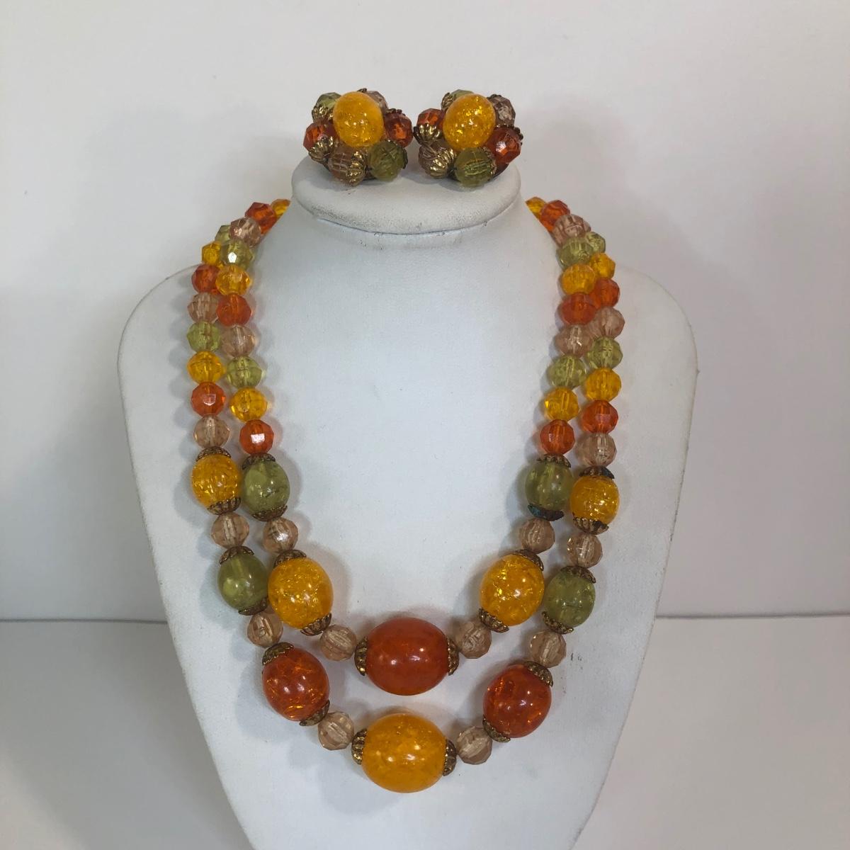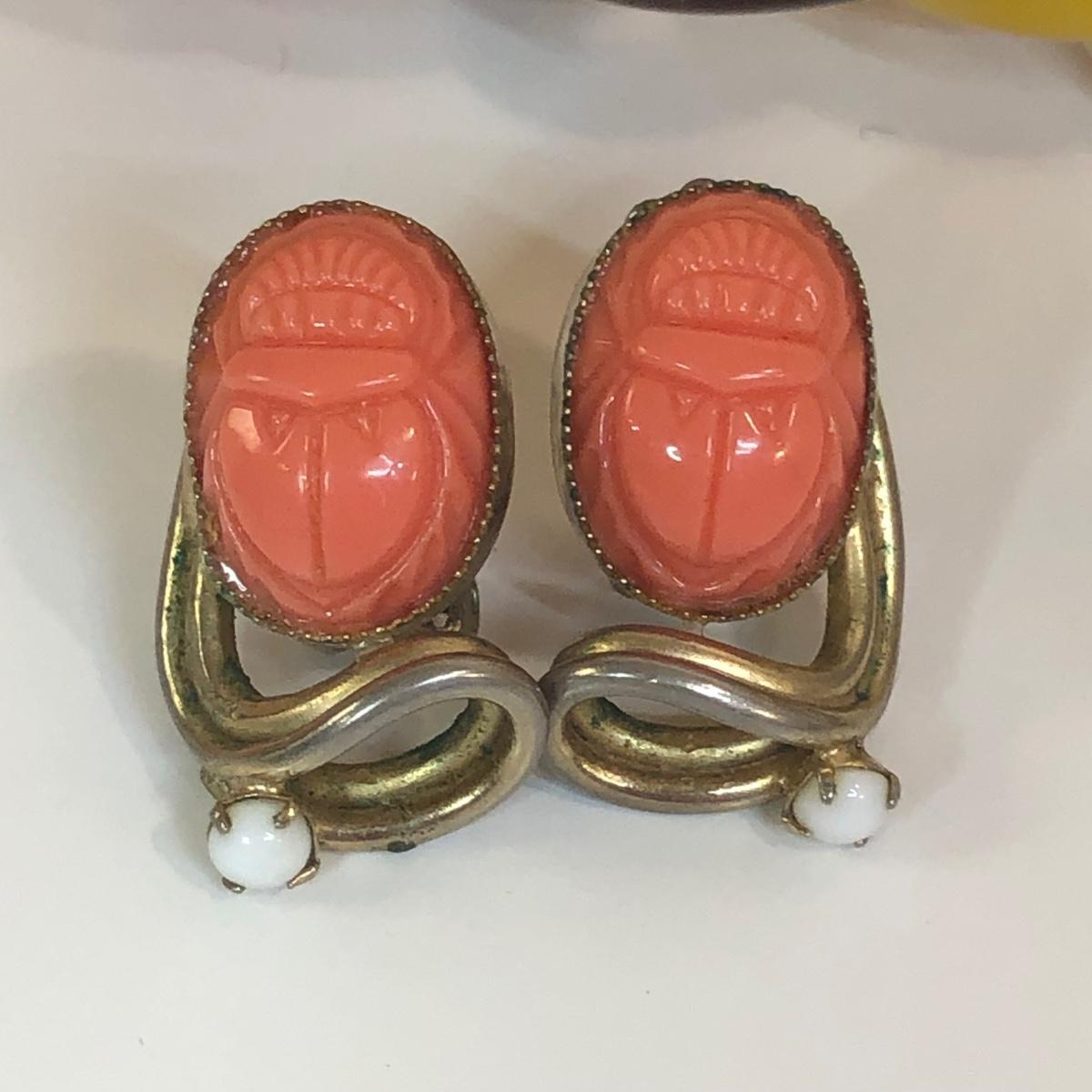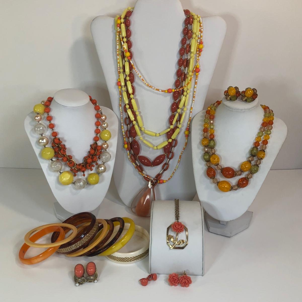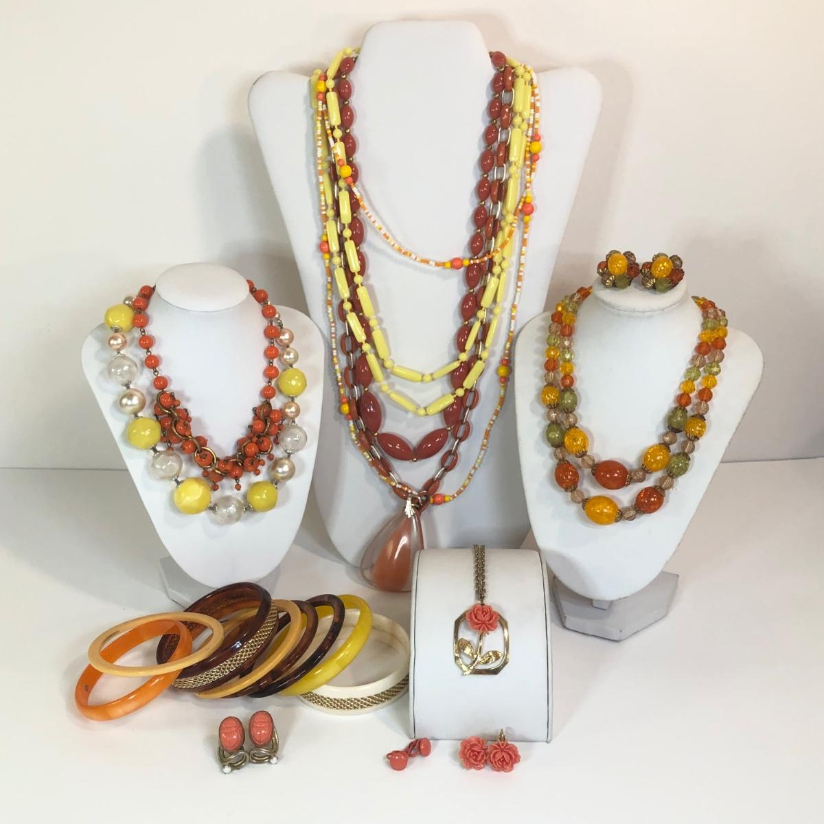 LOT 111M: Warm Color Jewelry Collection - Scarab Earrings, Plastic Bangles, Bead Necklaces & More