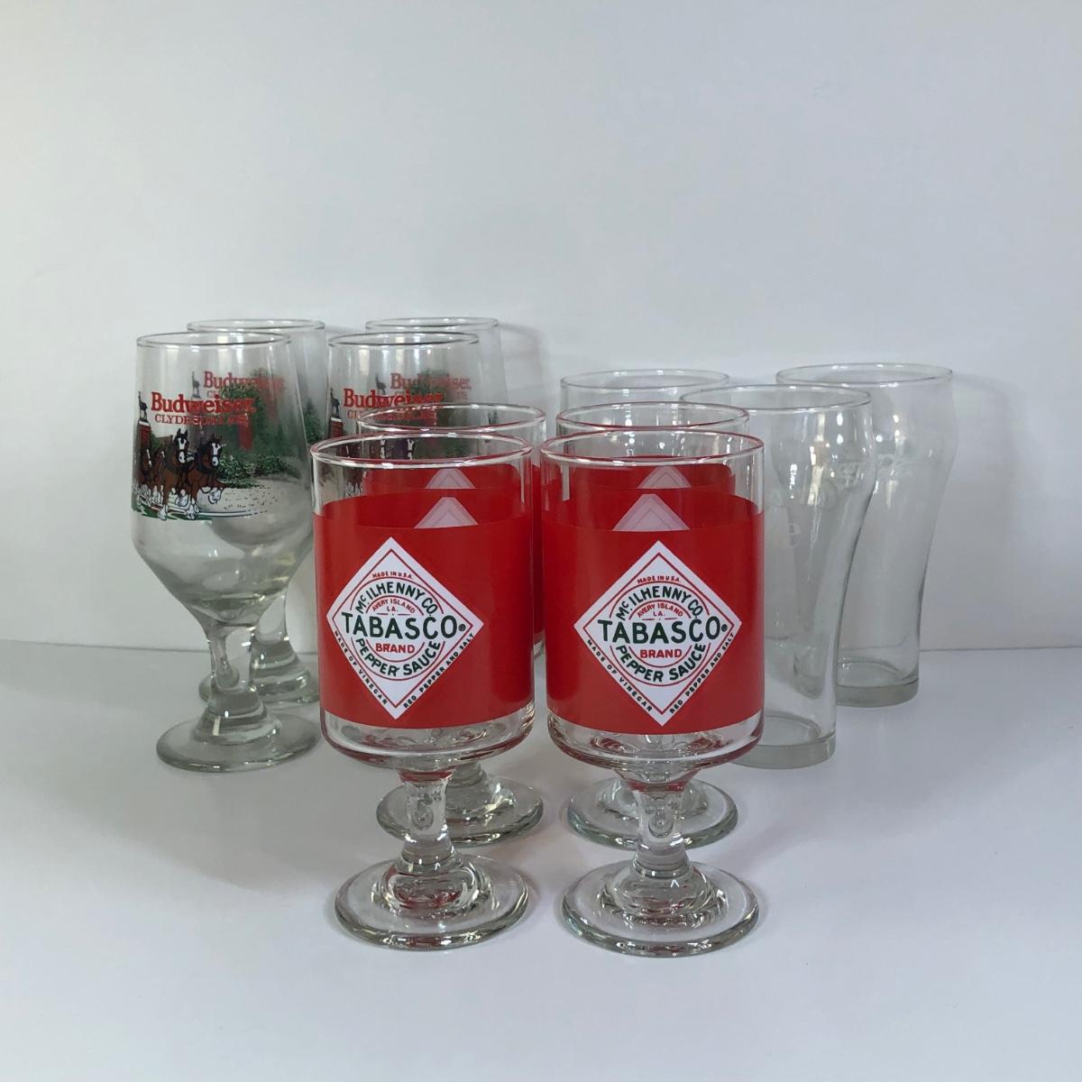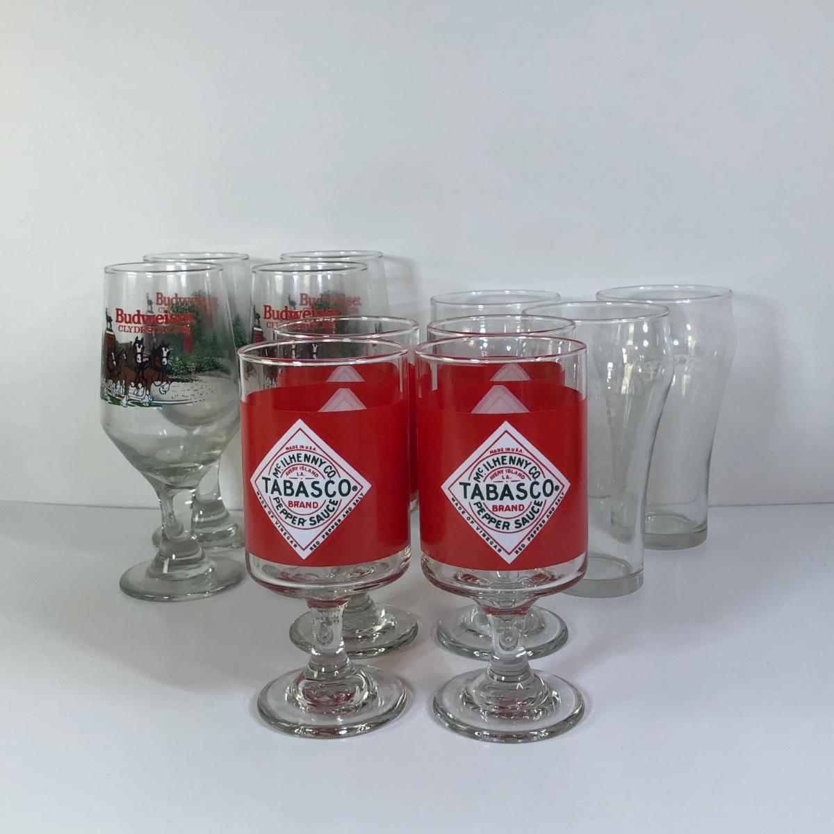 LOT 115M: Tabasco Stemmed Glasses (4), 1991 Budweiser Stemmed Glasses (4) & Coca-Cola Glasses (3)