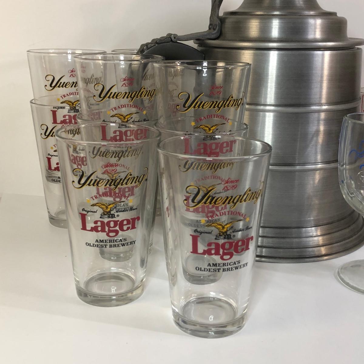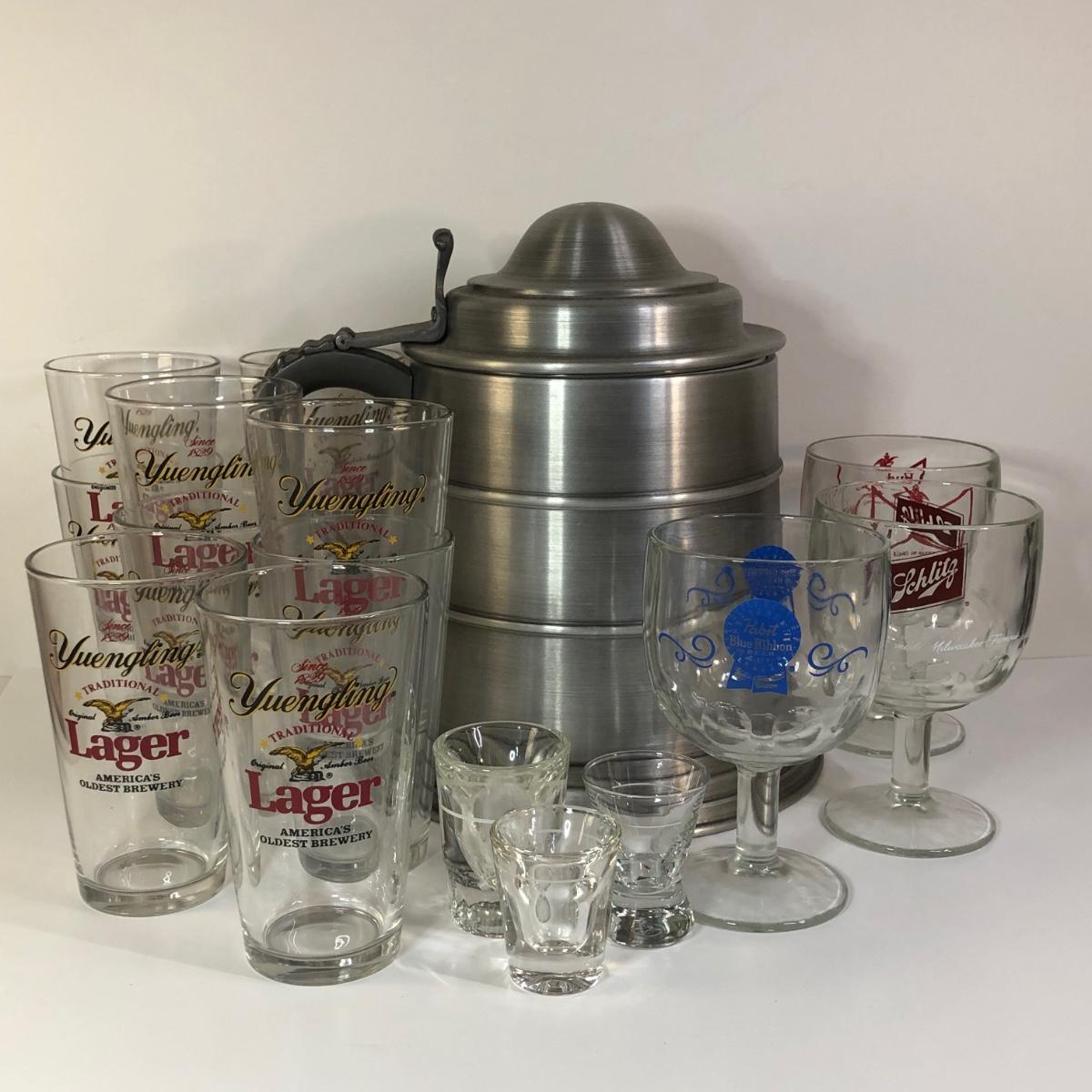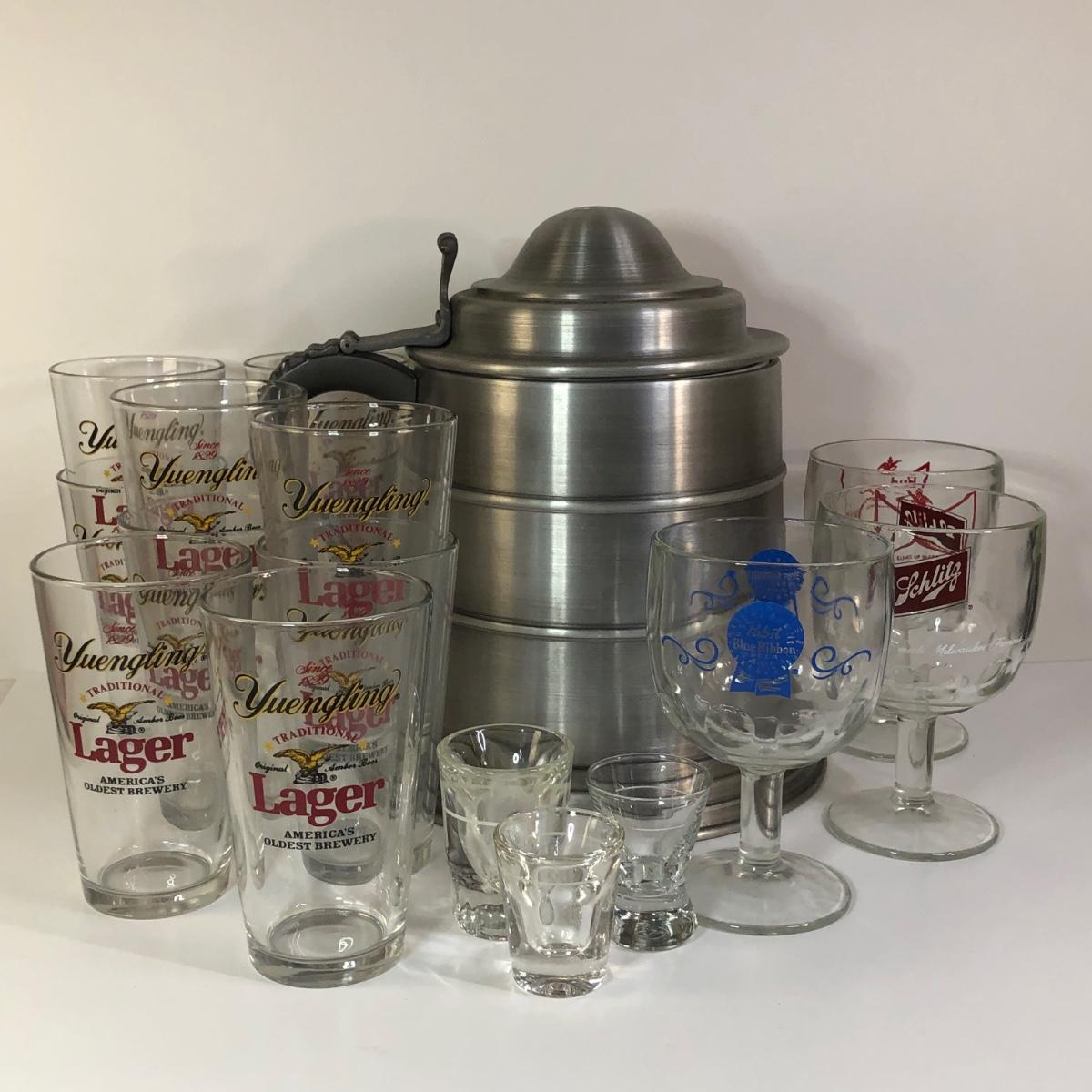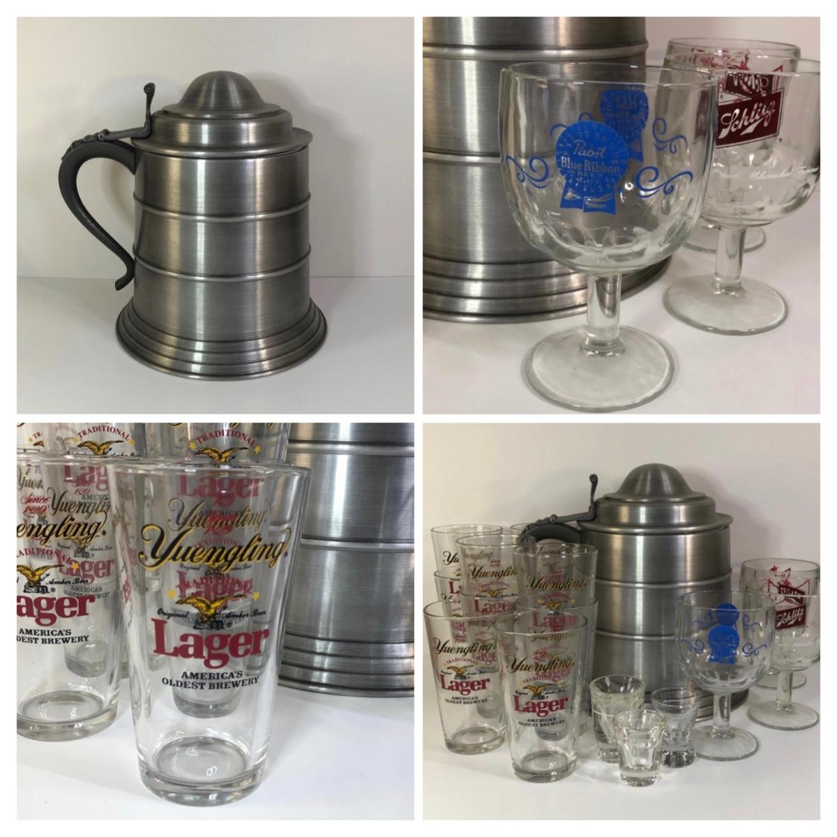 LOT 116M: Seymour Mann Imports Pewtertone Olde Tankardware Stein Ice Bucket (made in Italy)w/ Yuengling Beer Glasses & Stemmed Glasses - Pabst Blue Ribbon, Schlitz & Budweiser