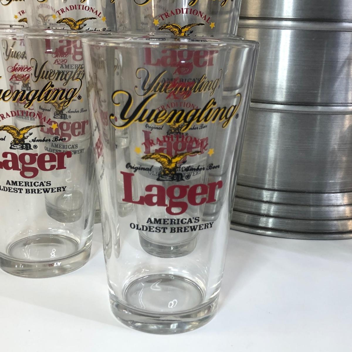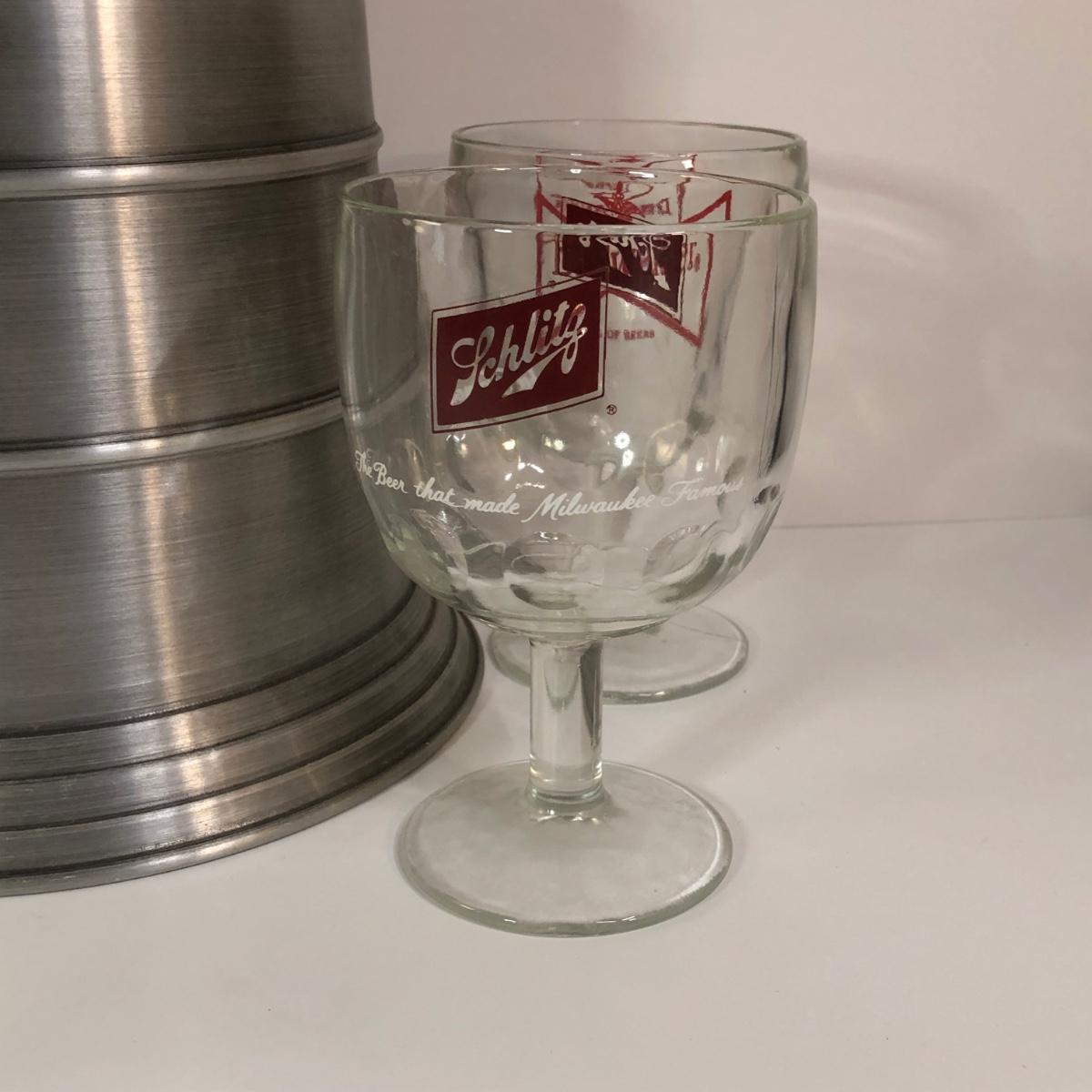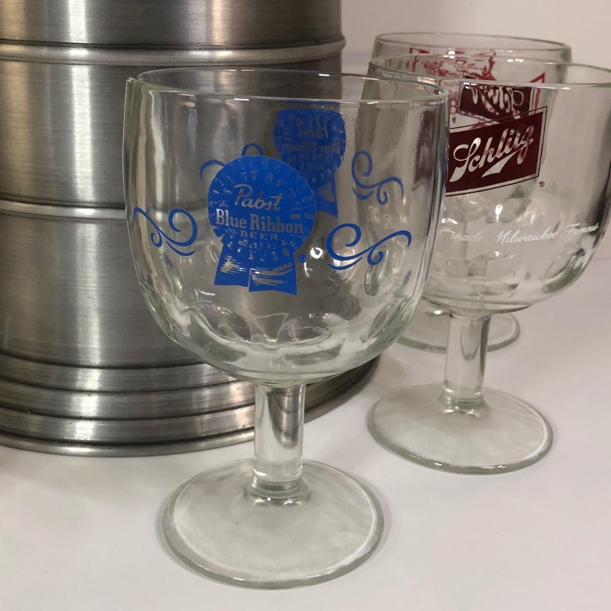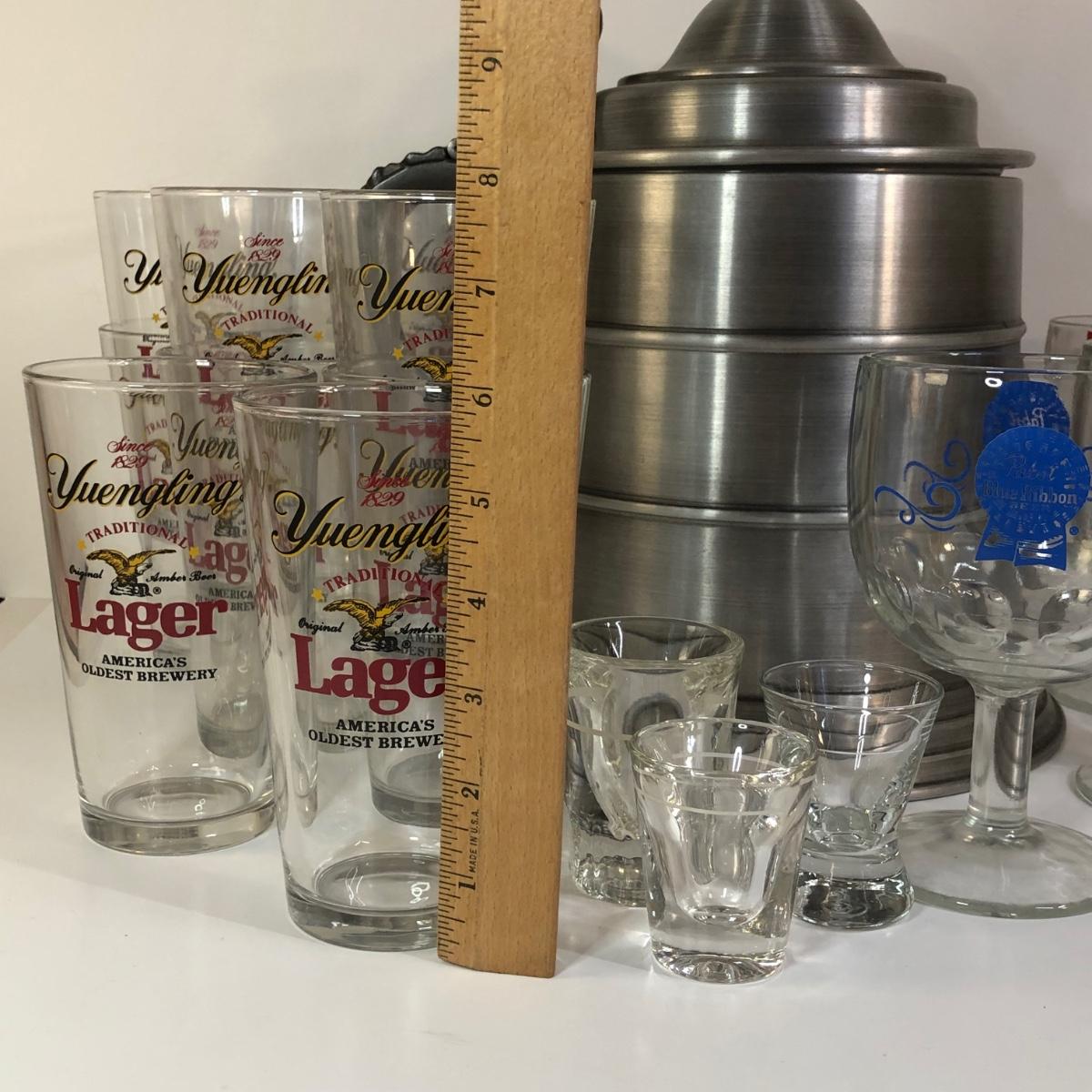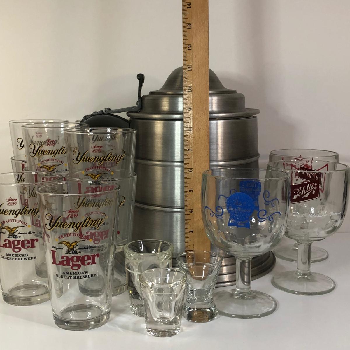LOT 116M: Seymour Mann Imports Pewtertone Olde Tankardware Stein Ice Bucket (made in Italy)w/ Yuengling Beer Glasses & Stemmed Glasses - Pabst Blue Ribbon, Schlitz & Budweiser