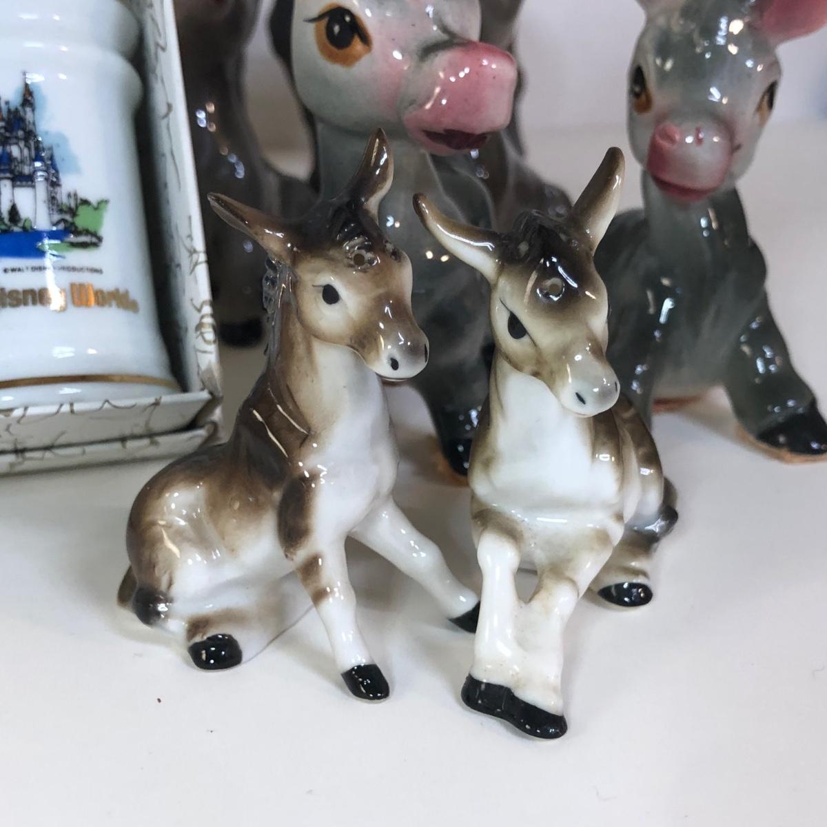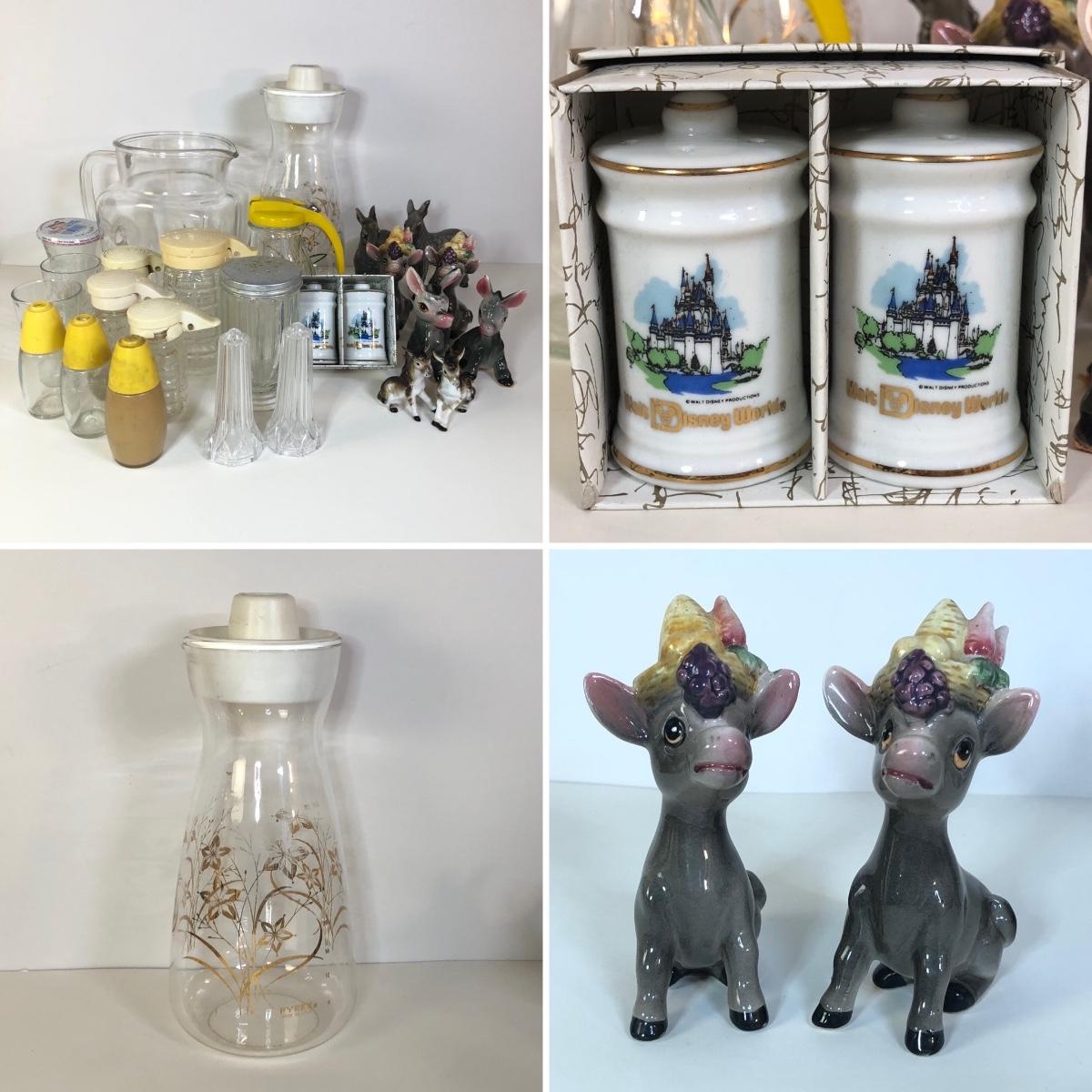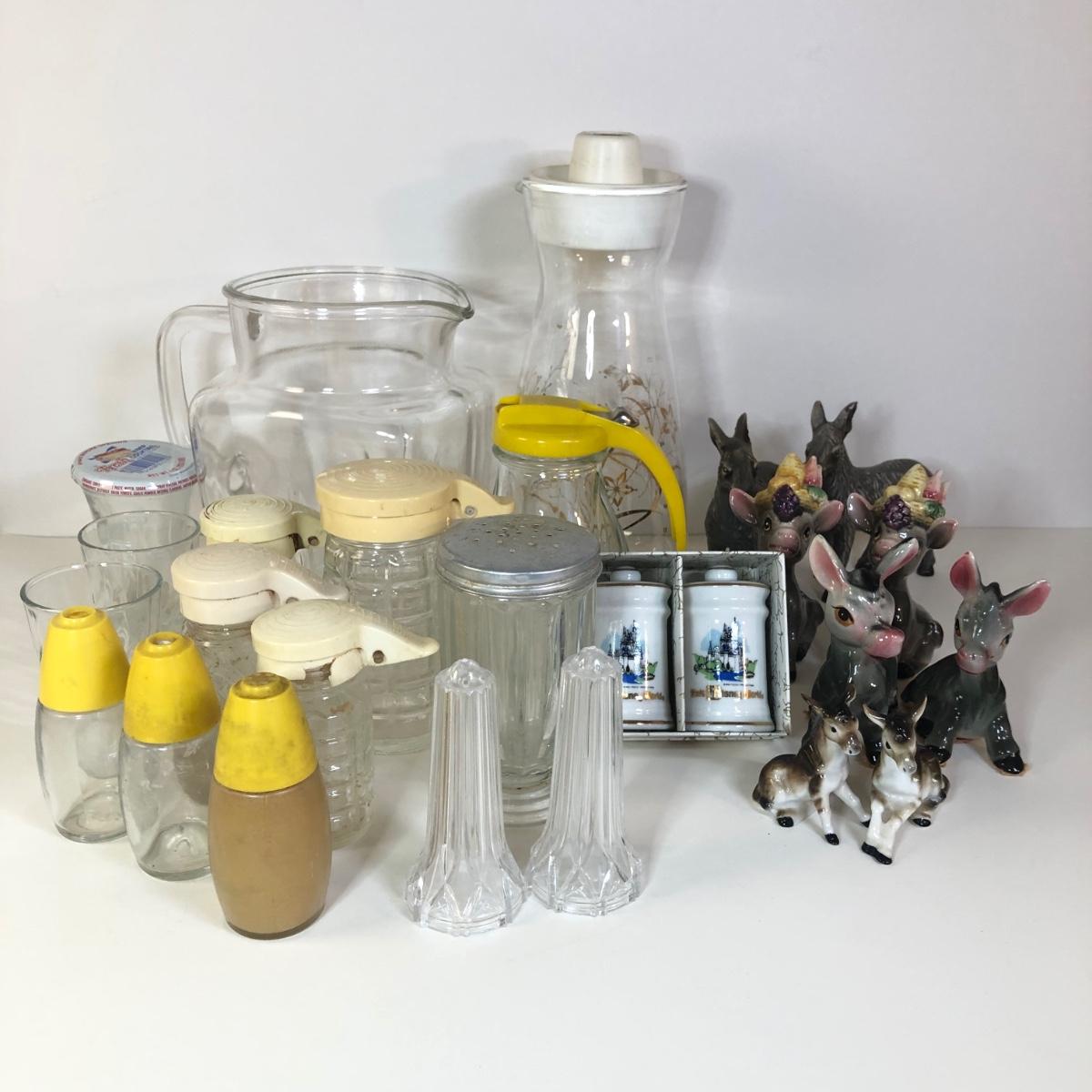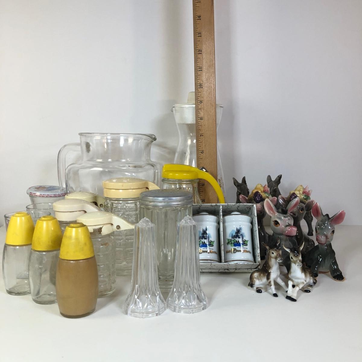 LOT 118M: Vintage Floral Pyrex Pitcher, Glass Juice Pitcher, Disney World Souvenir S&P Shakers, Donkey S&P Shakers & More