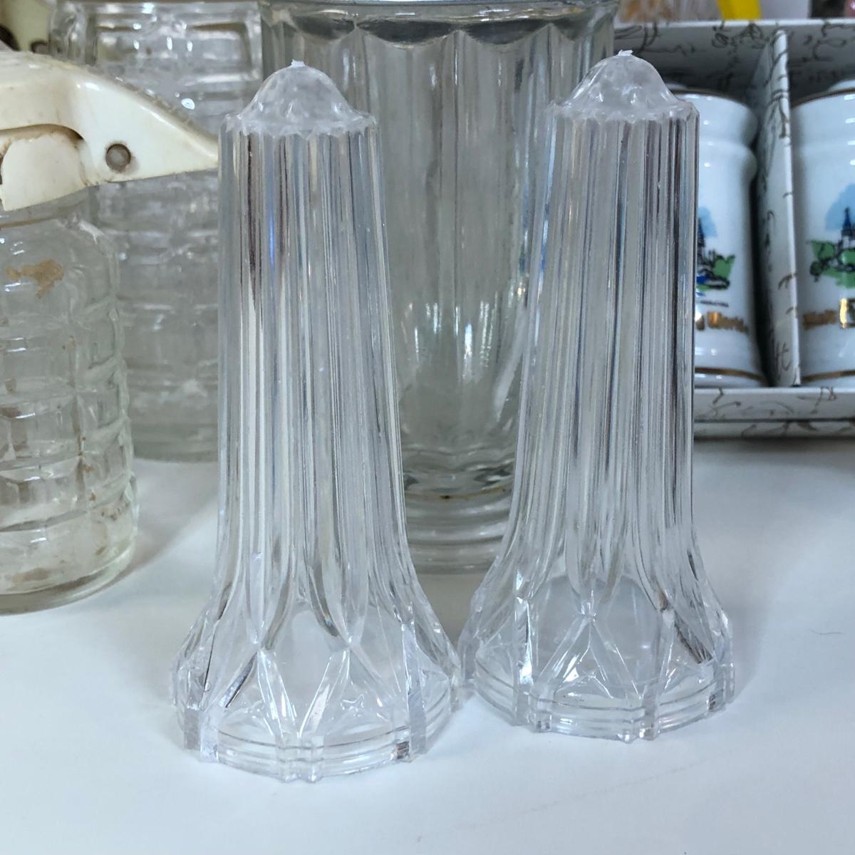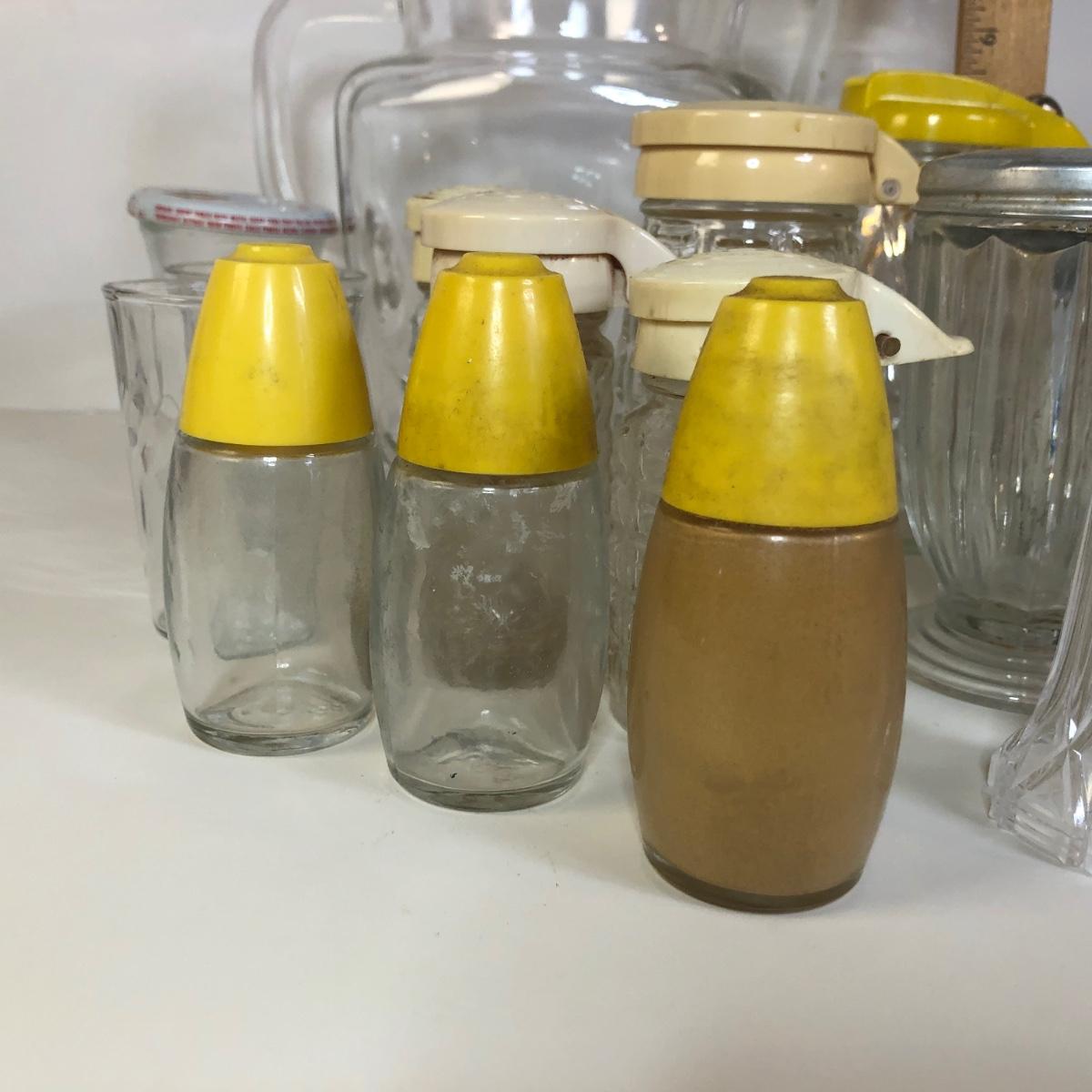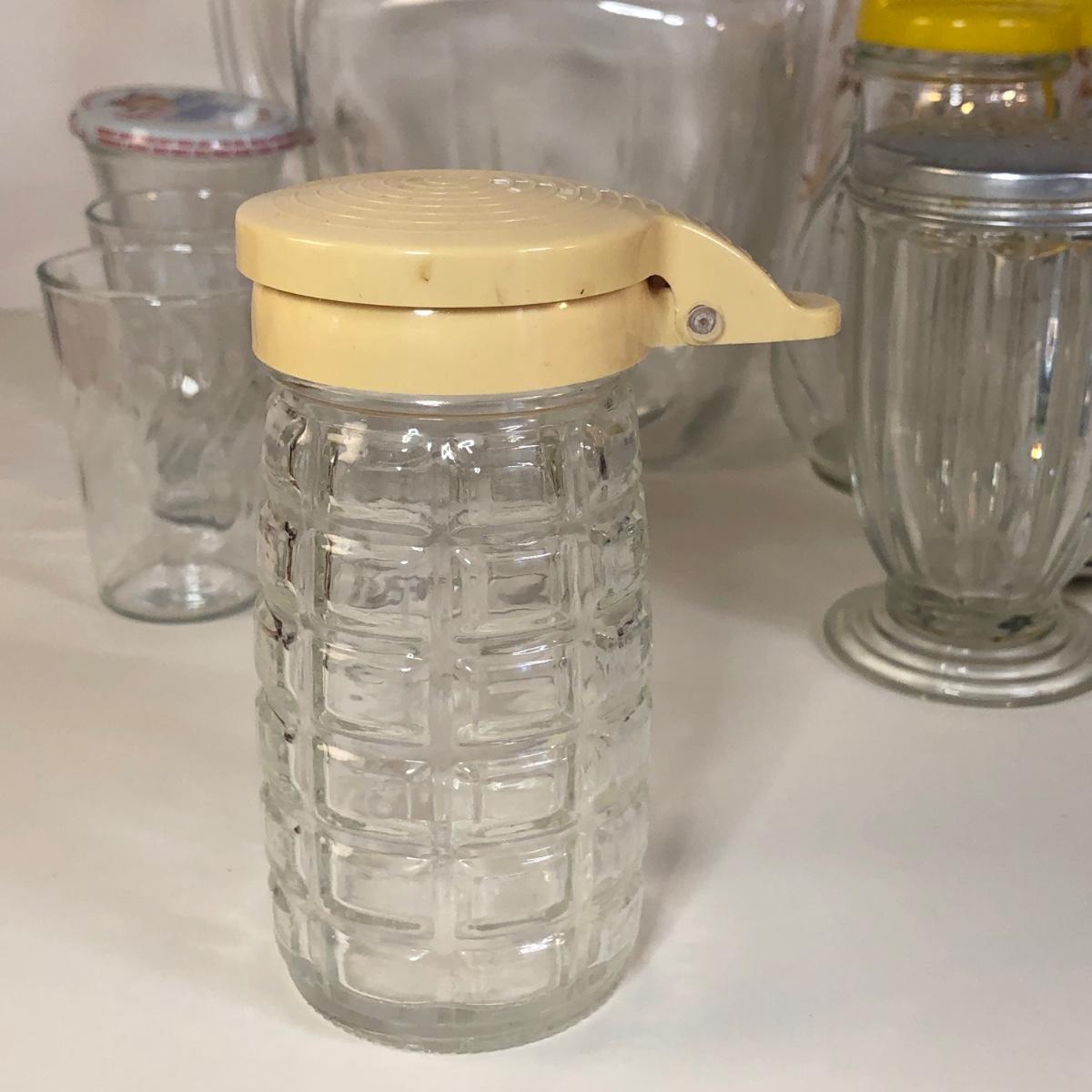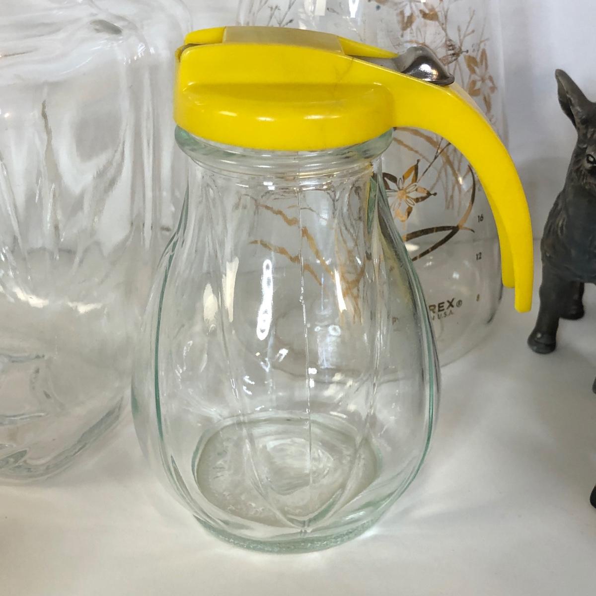 LOT 118M: Vintage Floral Pyrex Pitcher, Glass Juice Pitcher, Disney World Souvenir S&P Shakers, Donkey S&P Shakers & More