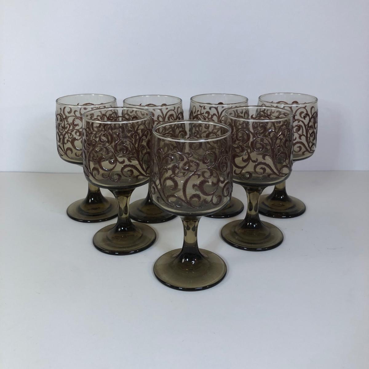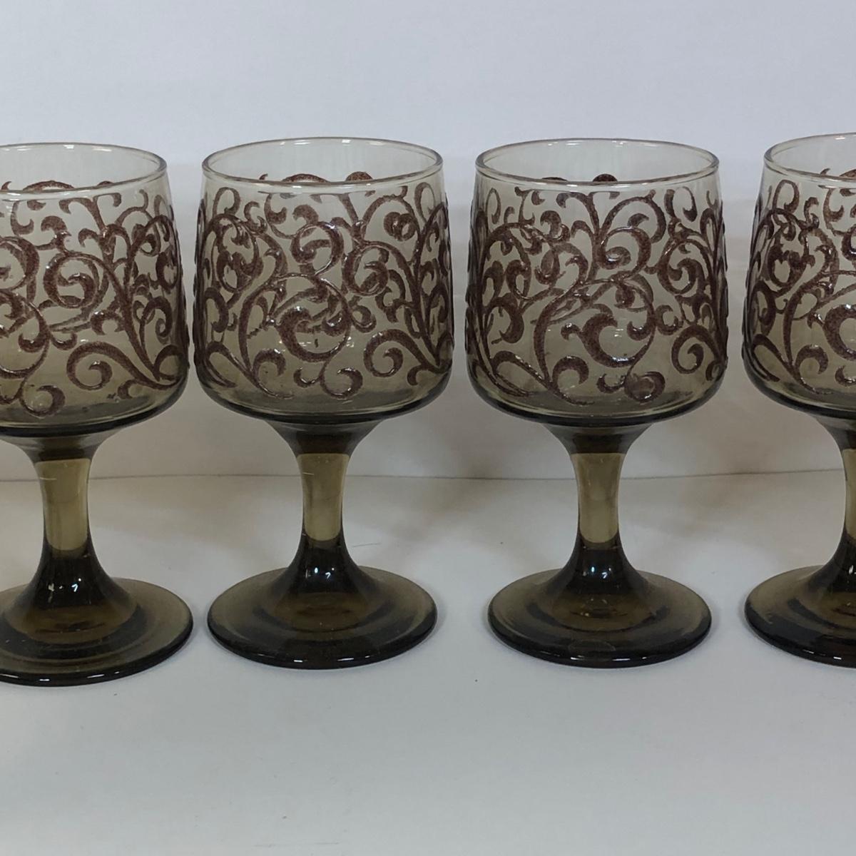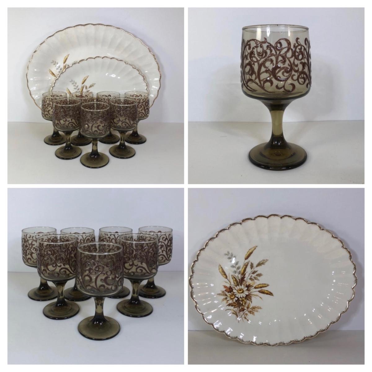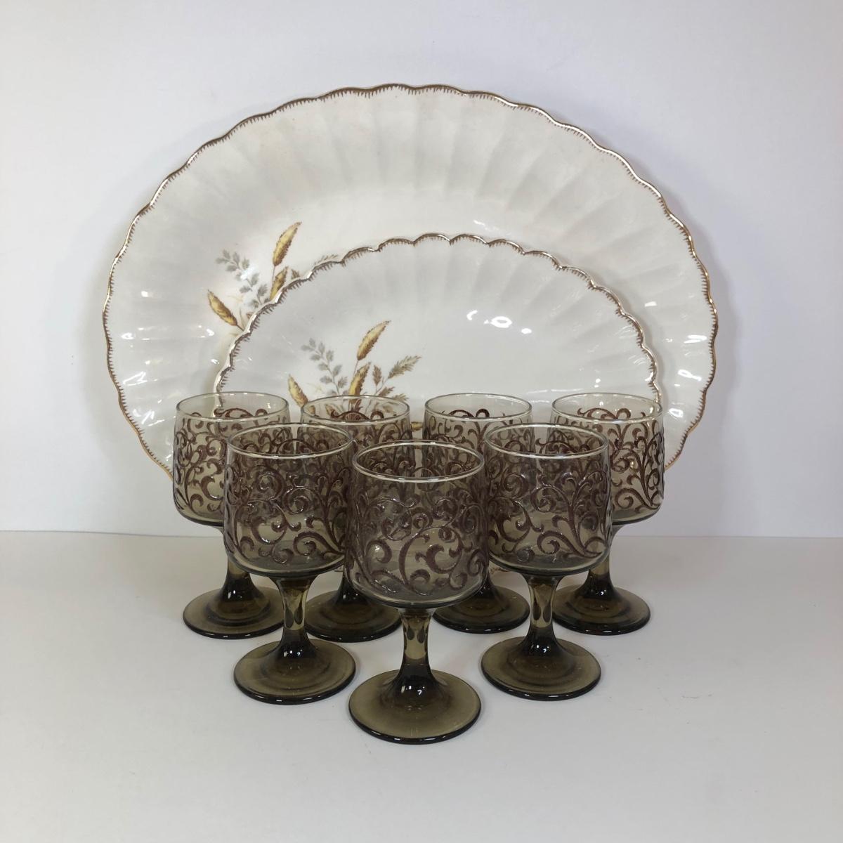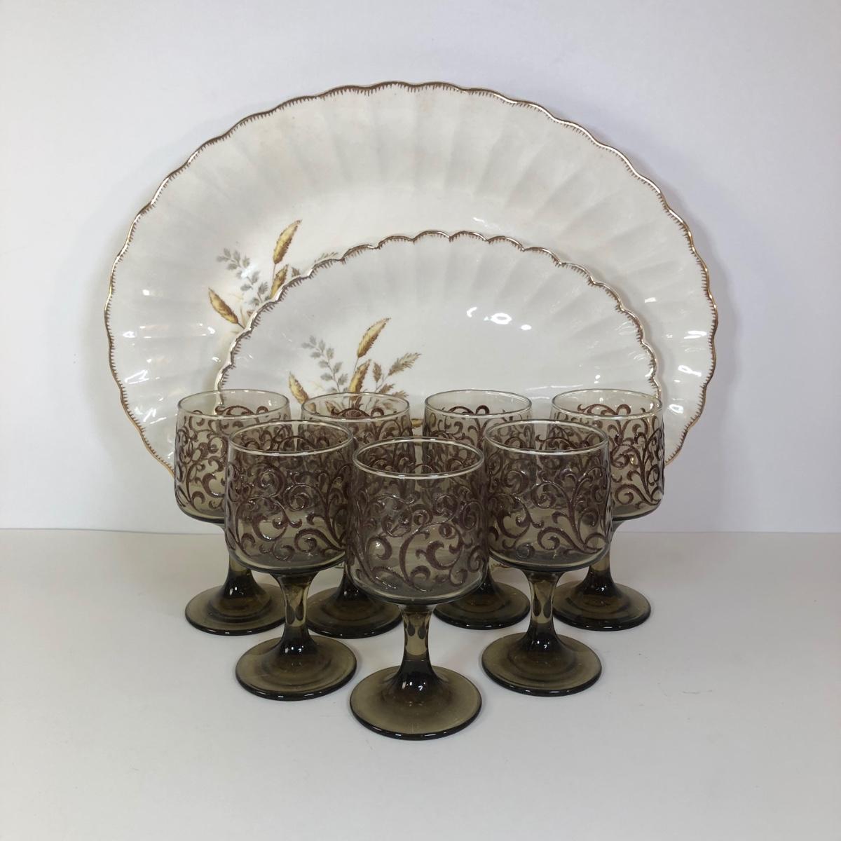 LOT 121M: 1970s Libbey Prado Raised Scroll Smoky Stemmed Glasses & Sebring China Platters