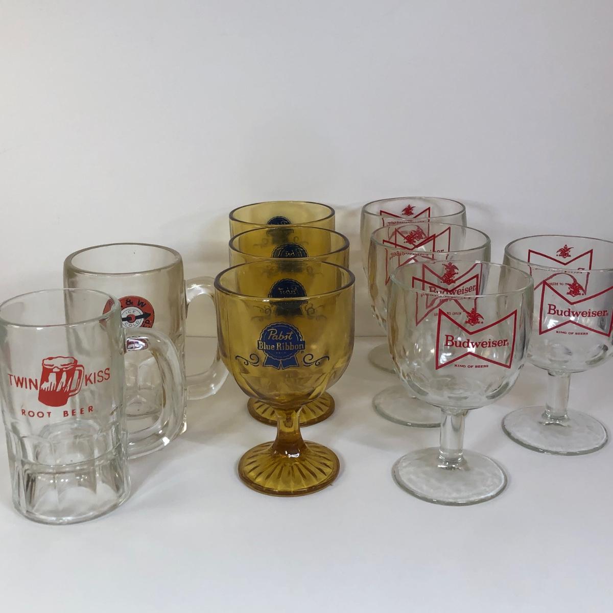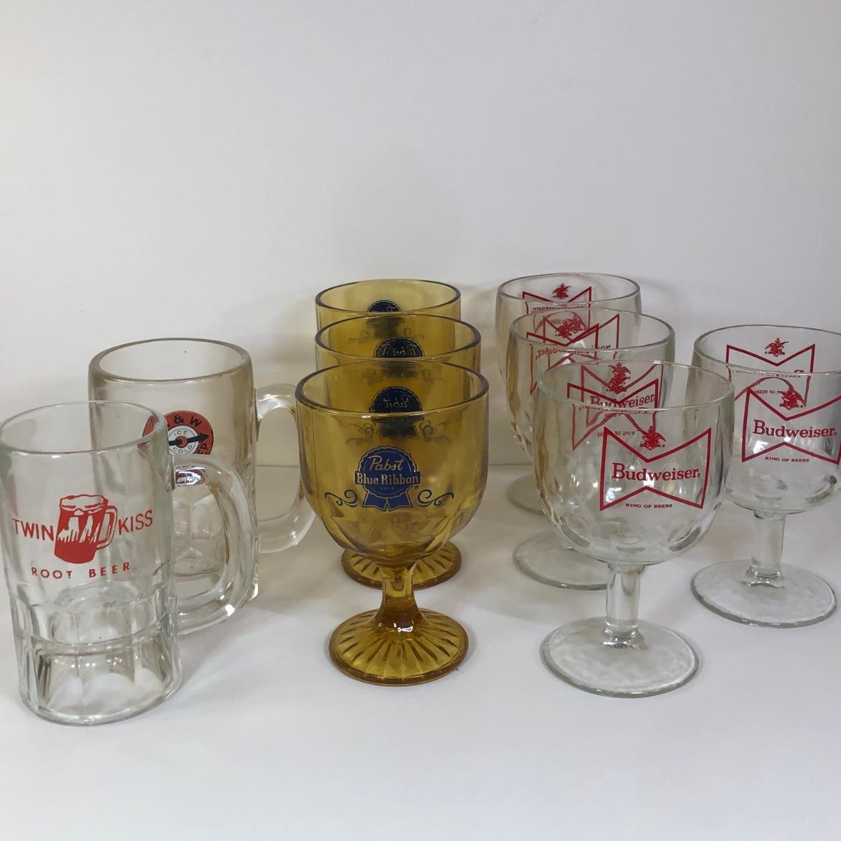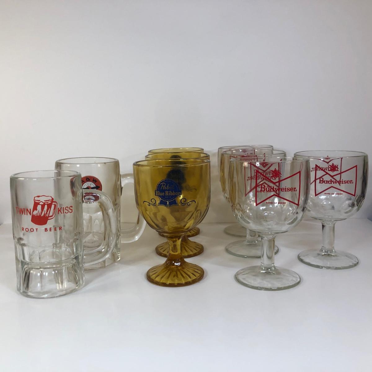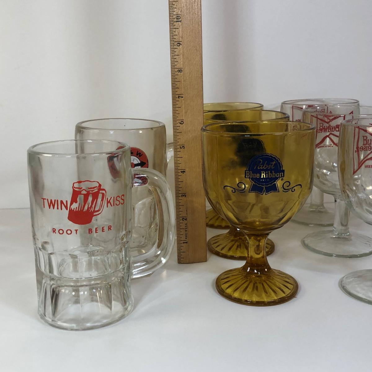 LOT 122M: Amber Colored Stemmed Pabst Blue Ribbon Glasses (3), Stemmed Budweiser Glasses (4), Twin Kiss Root Beer Mug & Vintage A&W Root Beer Mug