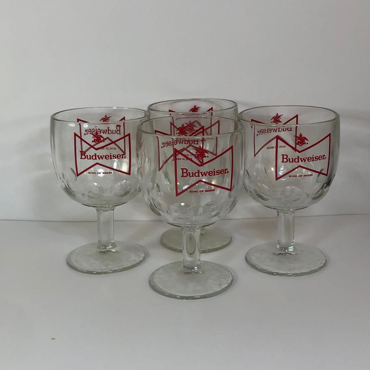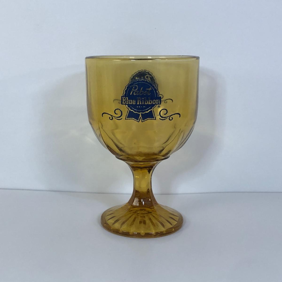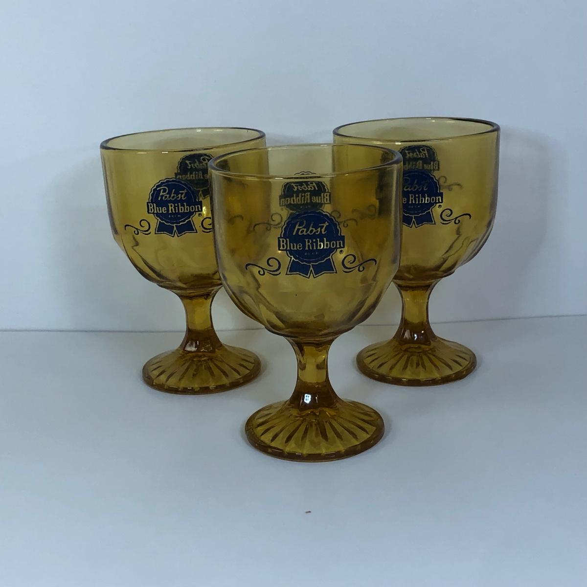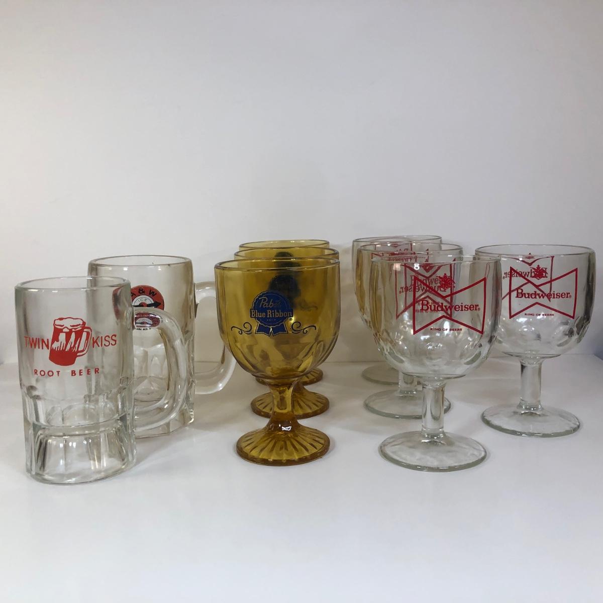 LOT 122M: Amber Colored Stemmed Pabst Blue Ribbon Glasses (3), Stemmed Budweiser Glasses (4), Twin Kiss Root Beer Mug & Vintage A&W Root Beer Mug