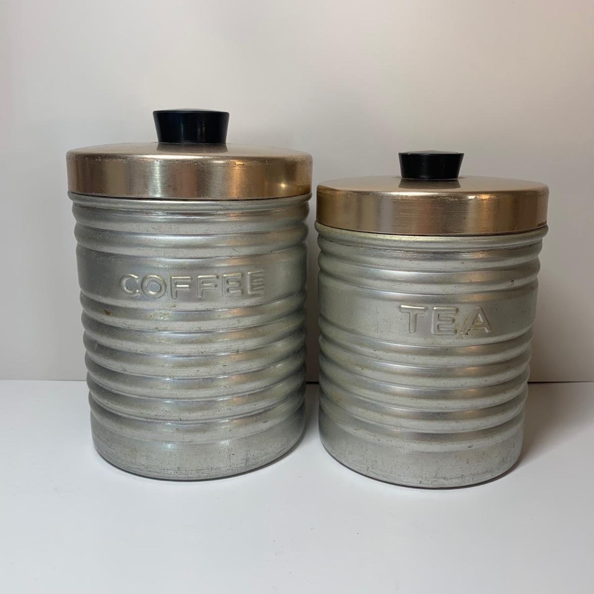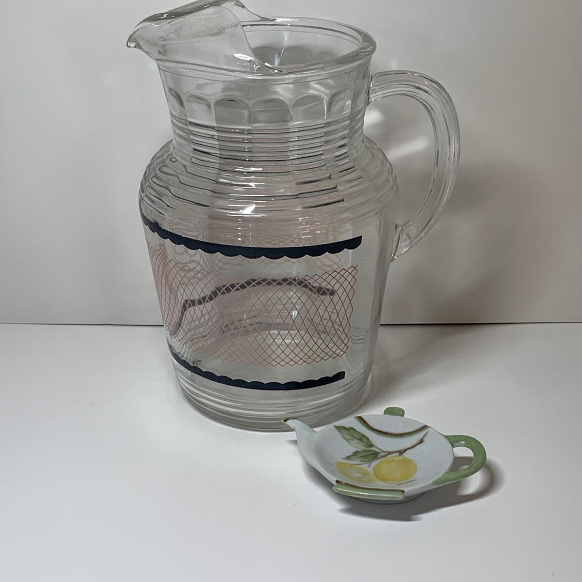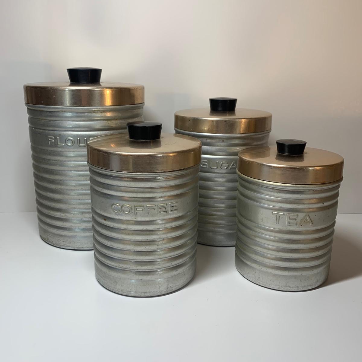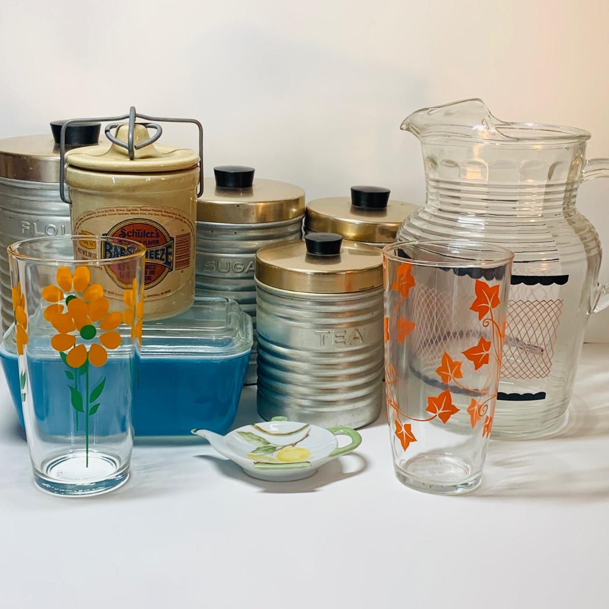 LOT 143R: Vintage Mid-Century Nasco Aluminum Nesting Canisters, Vintage Beverage Glasses, Hand Painted Teabag Holder, Vintage Hazel Atlas Atomic Pitcher, Pyrex Blue Refrigerator Dish