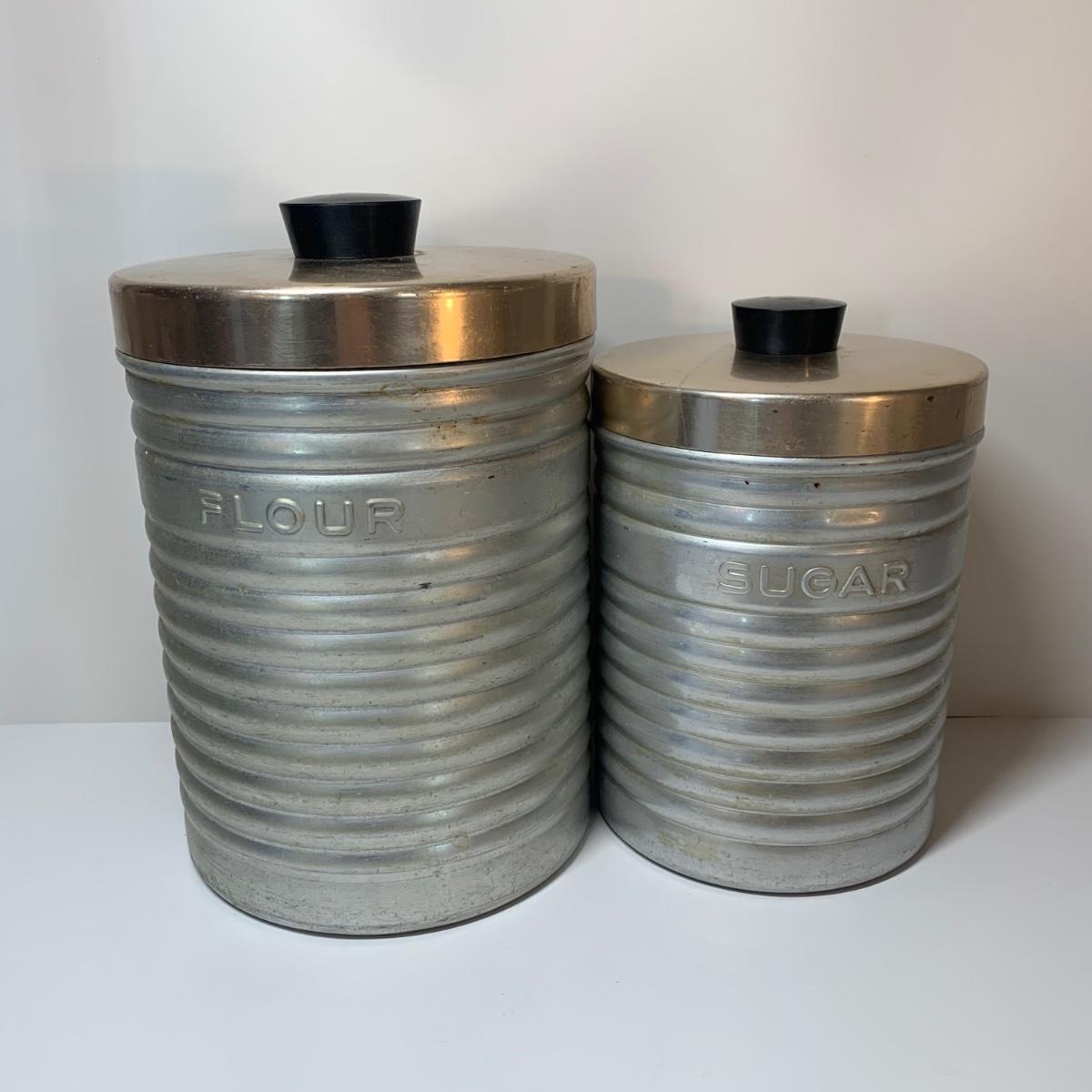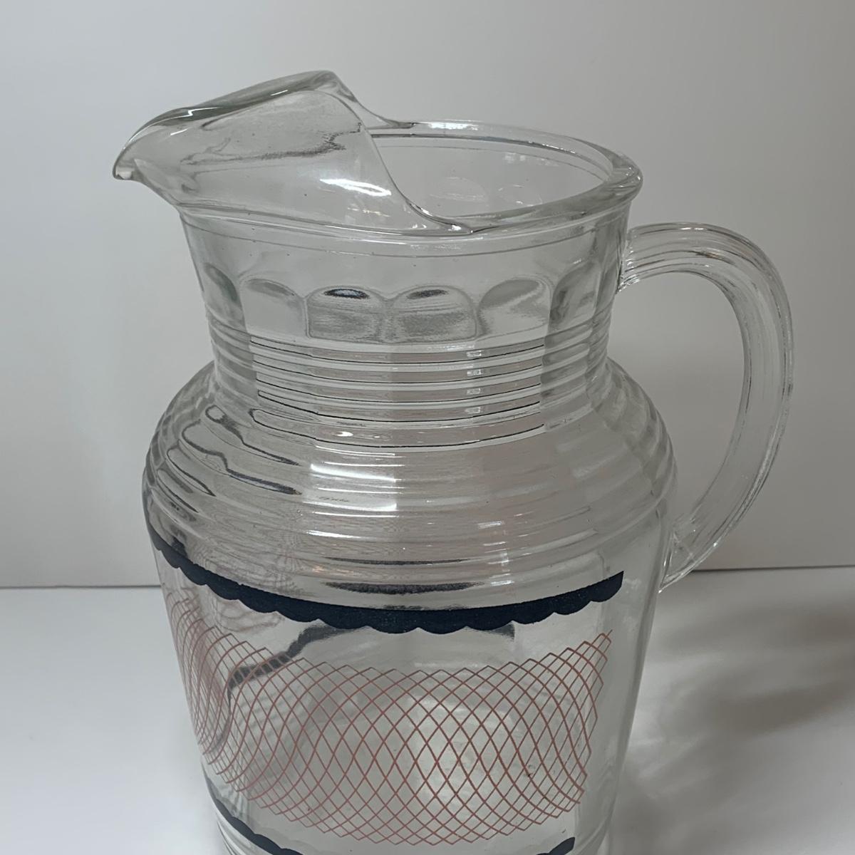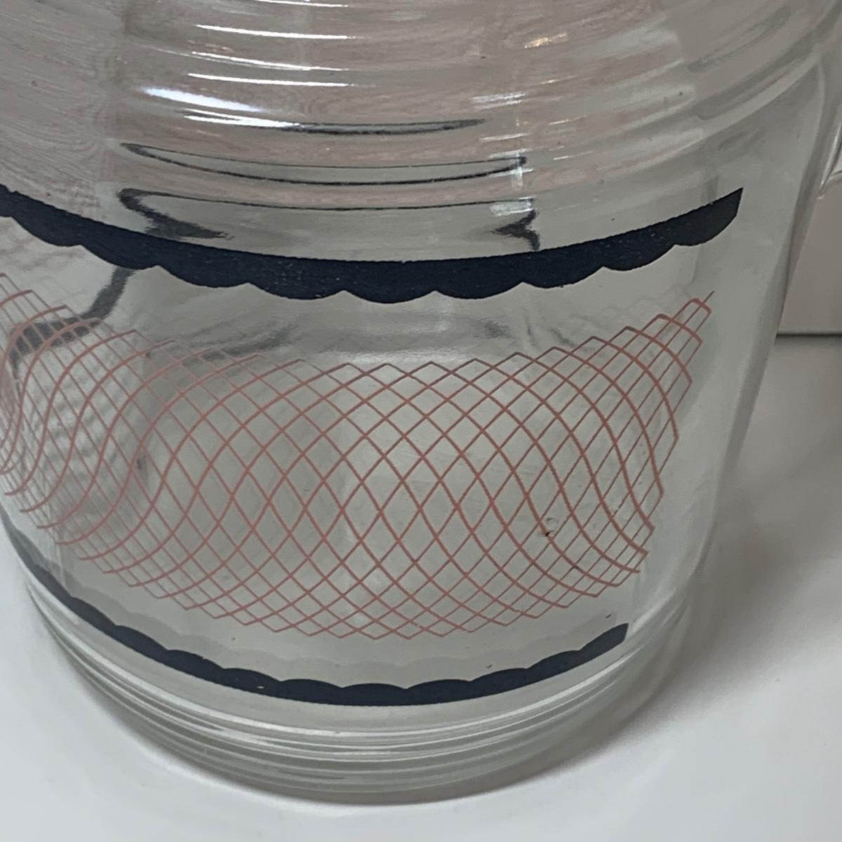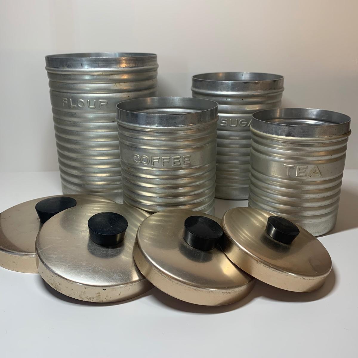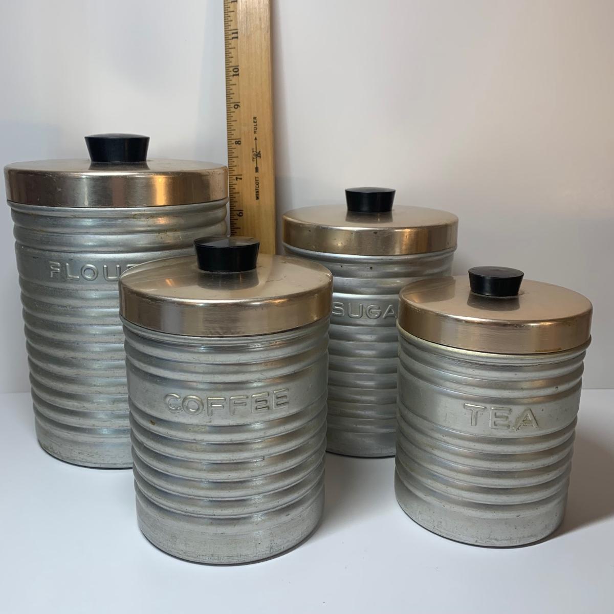 LOT 143R: Vintage Mid-Century Nasco Aluminum Nesting Canisters, Vintage Beverage Glasses, Hand Painted Teabag Holder, Vintage Hazel Atlas Atomic Pitcher, Pyrex Blue Refrigerator Dish