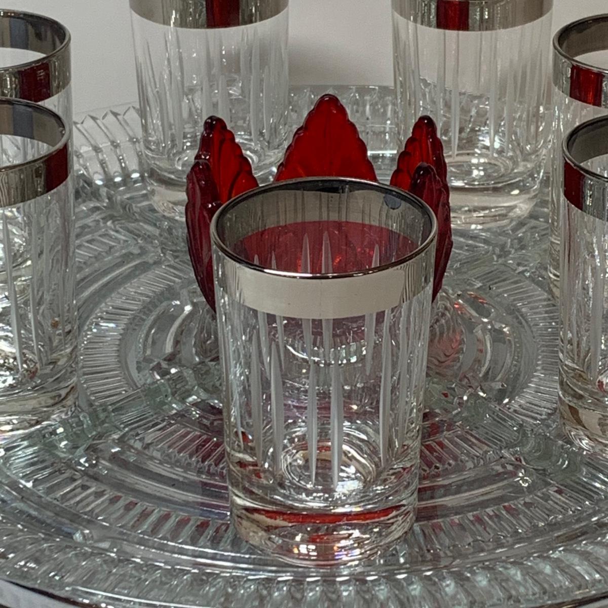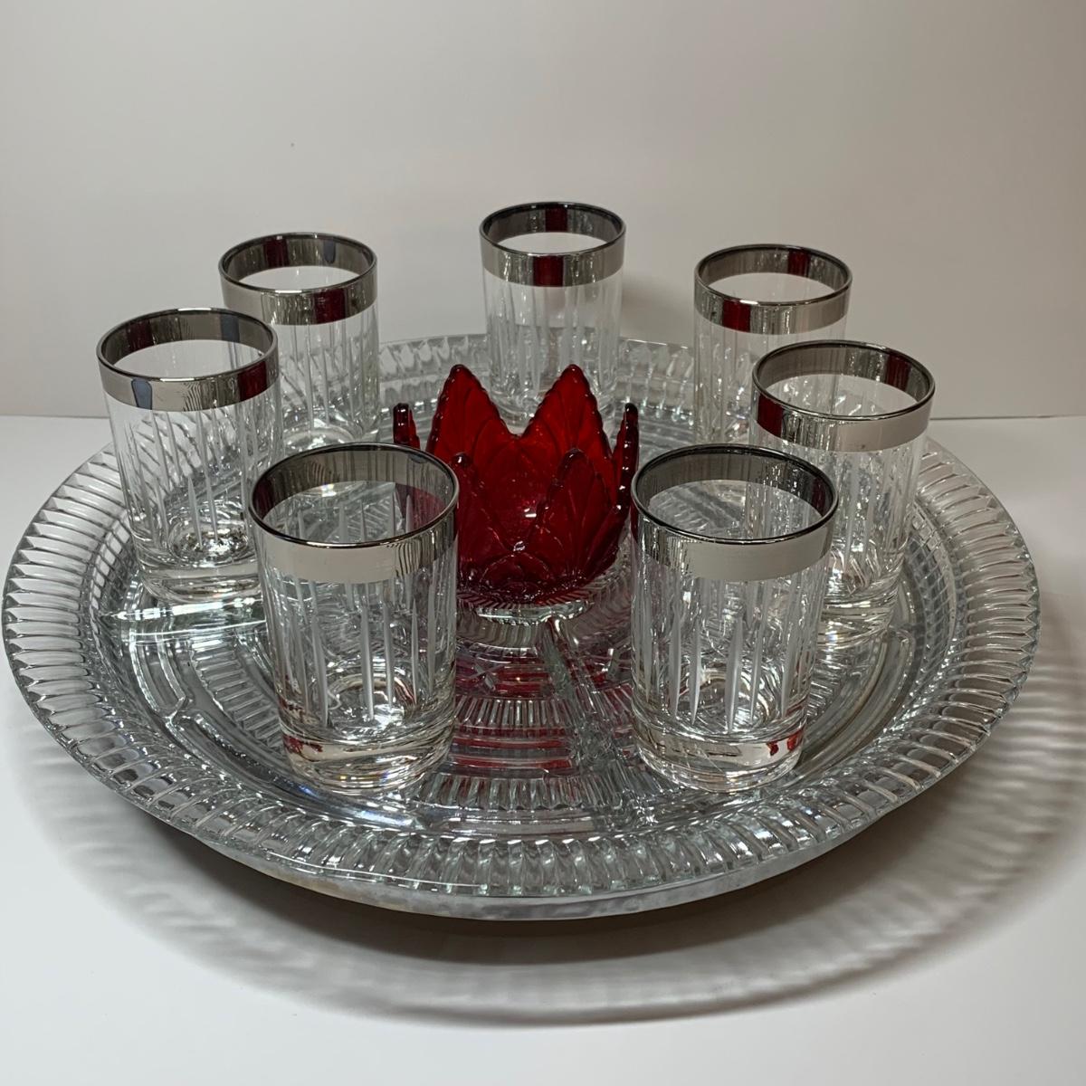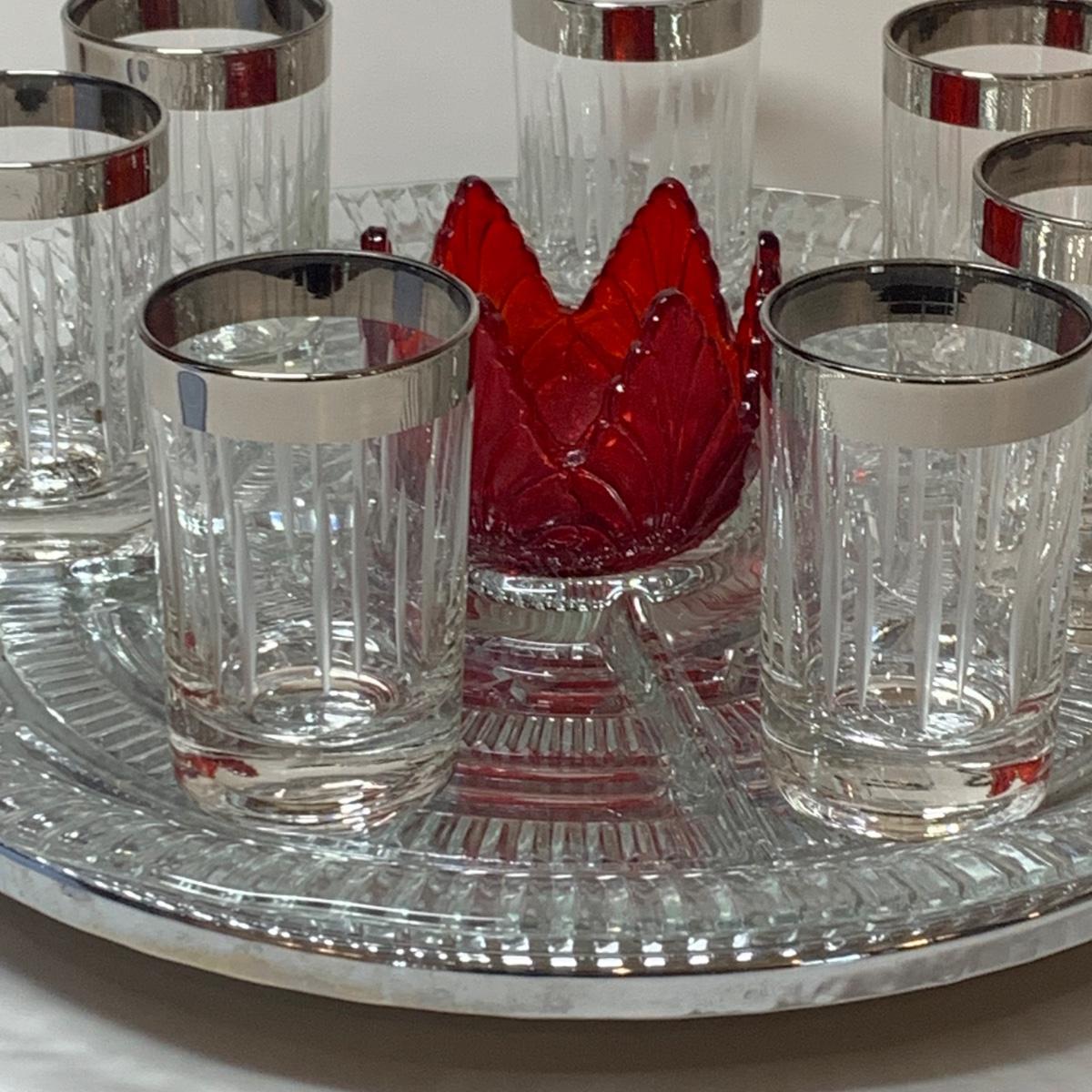 LOT 150R: Set of 7 Vintage MCM Etched Silver Rimmed Cocktail/Juice Glasses & Vintage Kromex Lazy Susan w/Divided Relish Dish