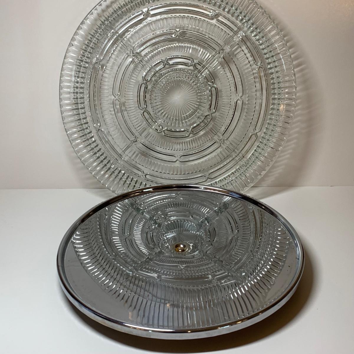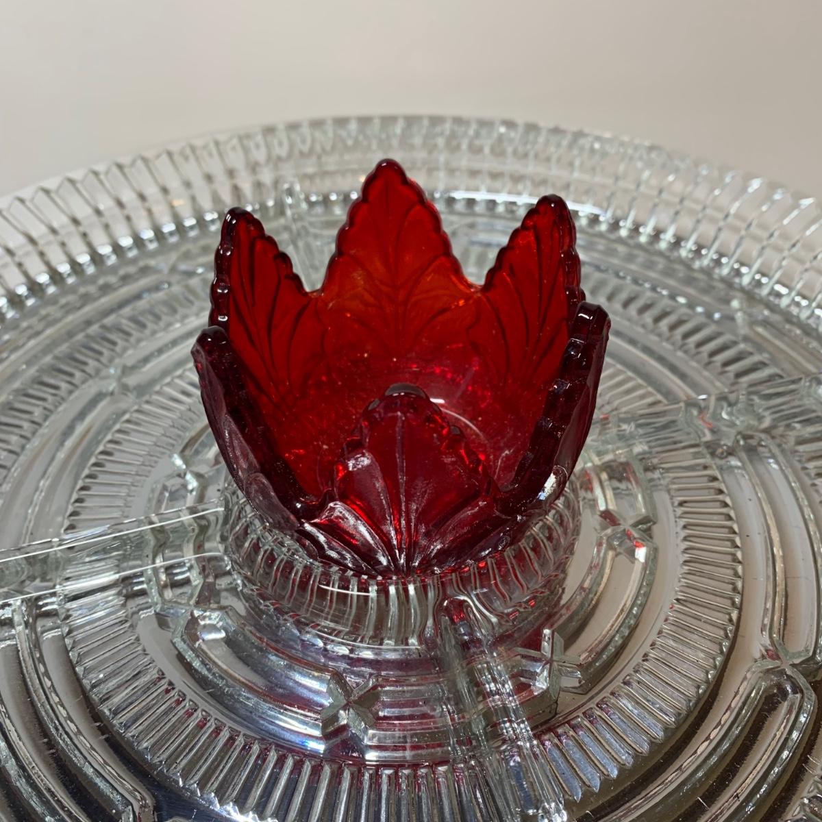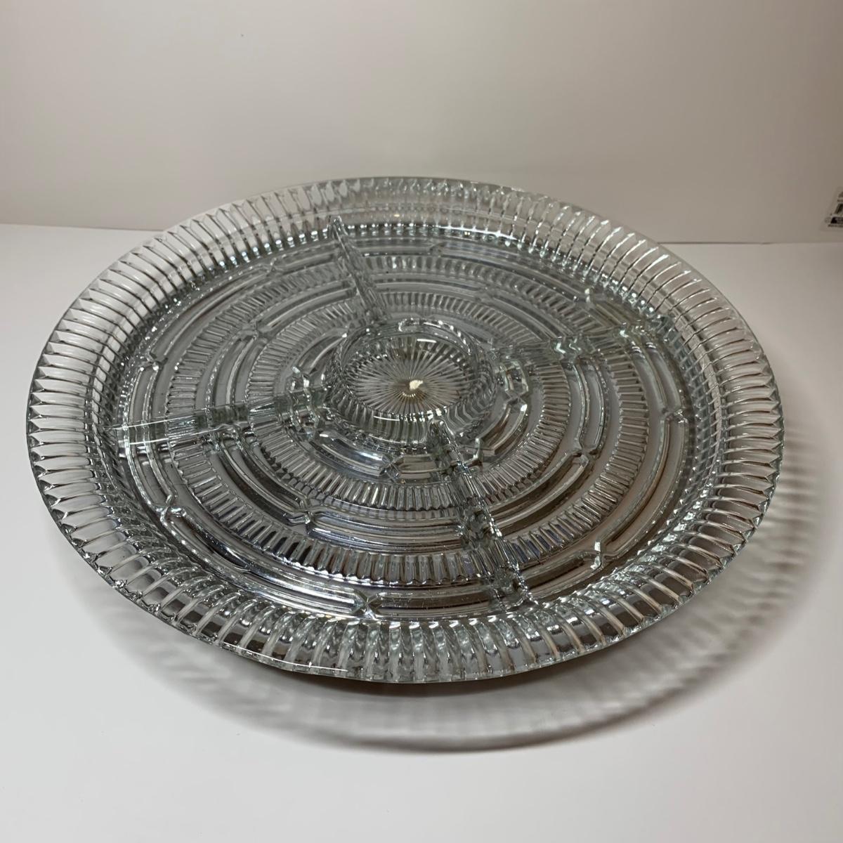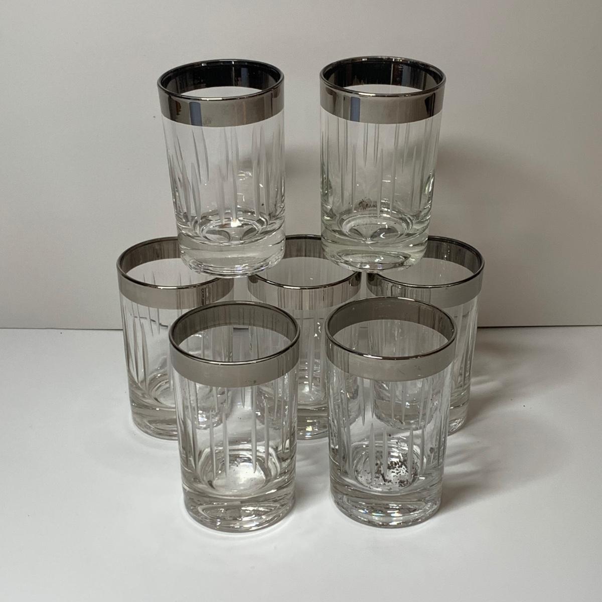 LOT 150R: Set of 7 Vintage MCM Etched Silver Rimmed Cocktail/Juice Glasses & Vintage Kromex Lazy Susan w/Divided Relish Dish