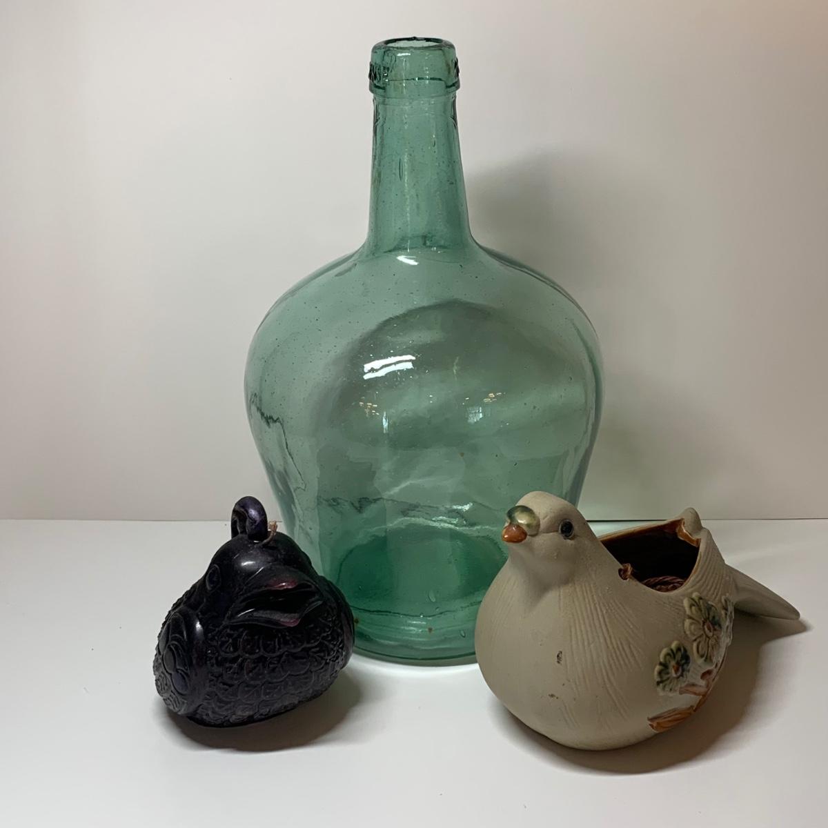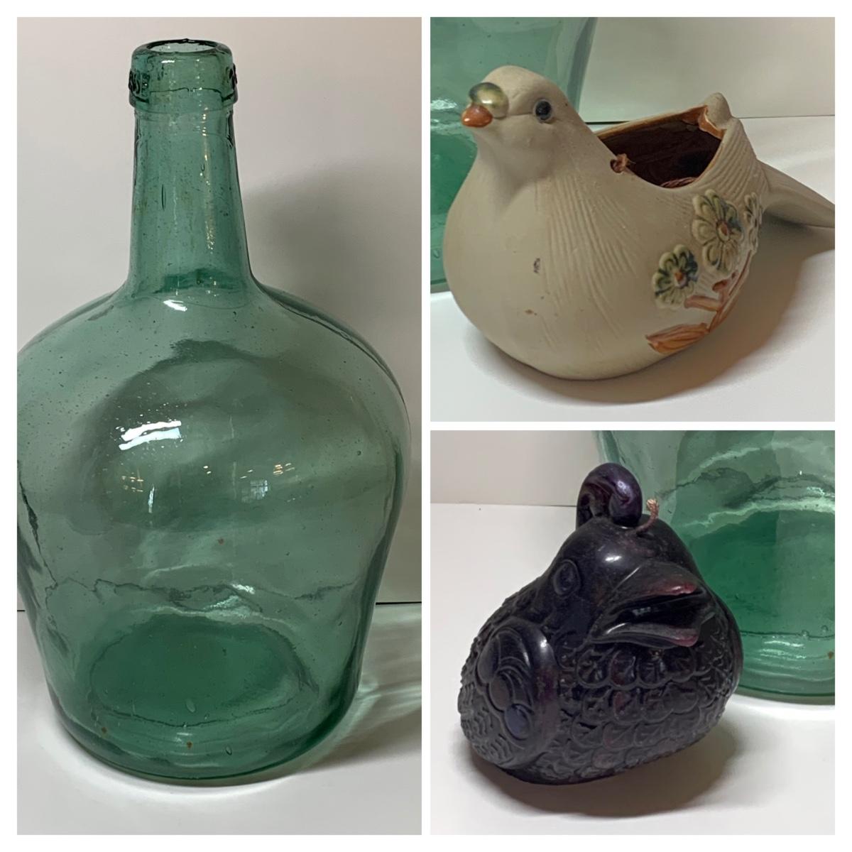LOT 151R: Vintage Demijohn Bottle by V Ayelense, Vintage Bird Planter & Candle