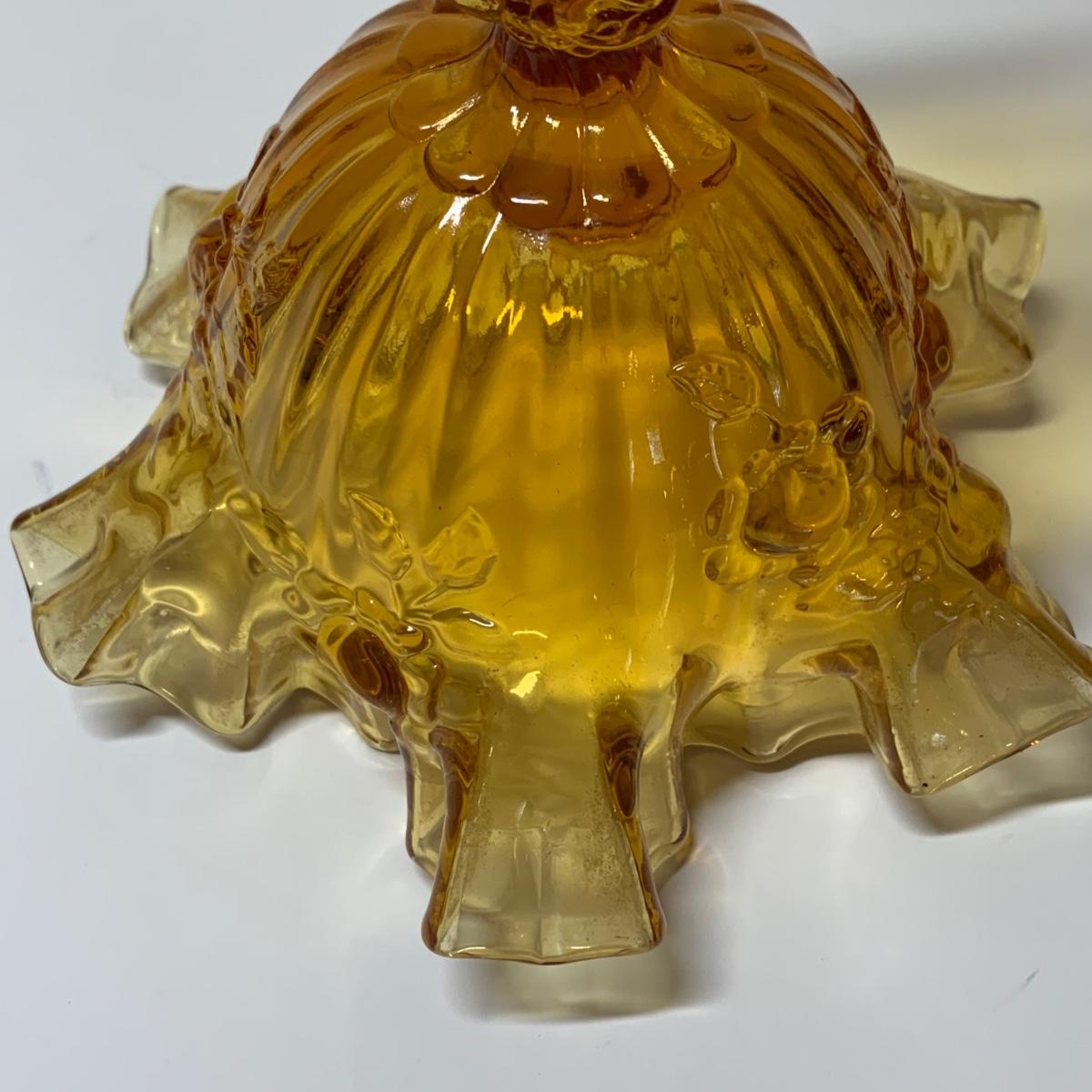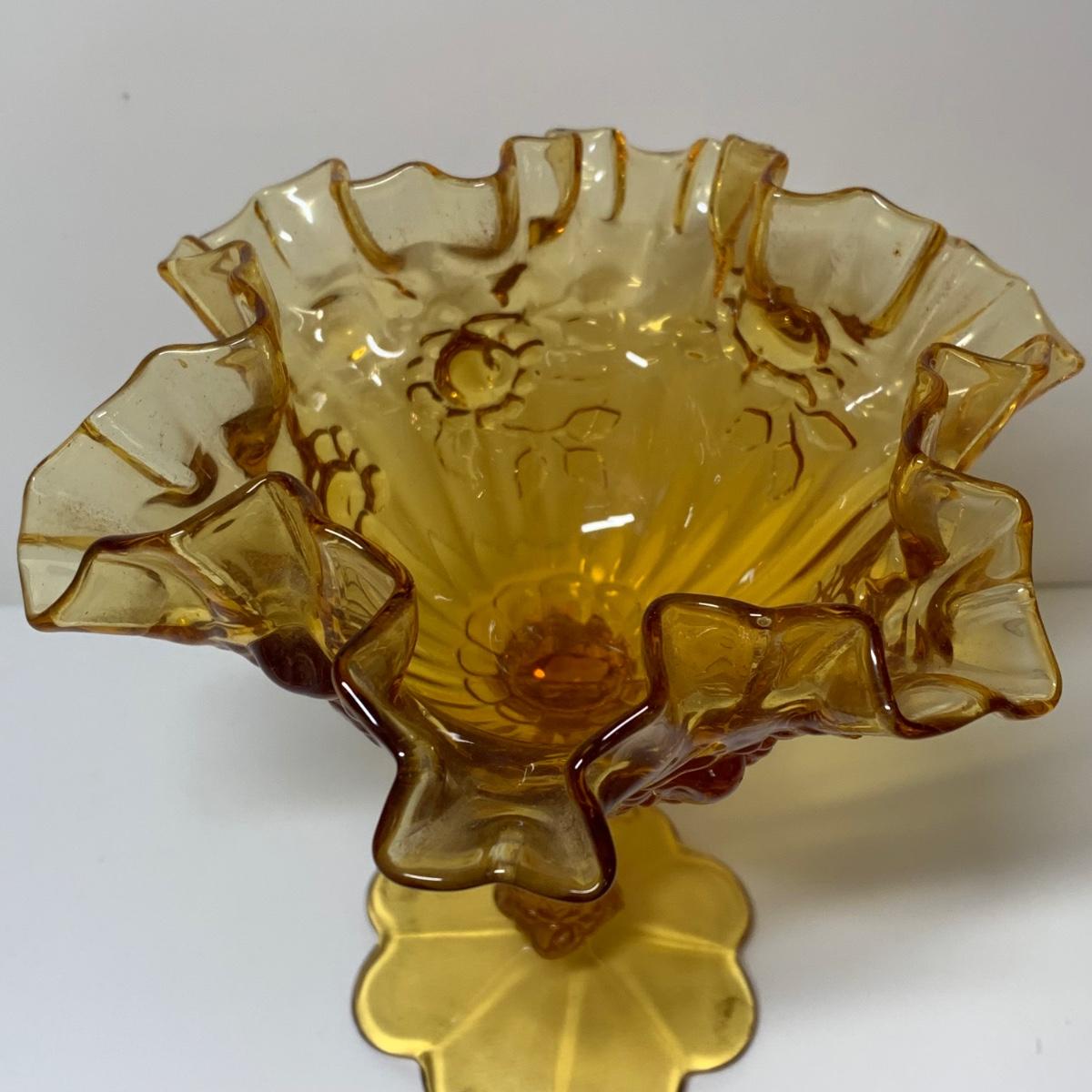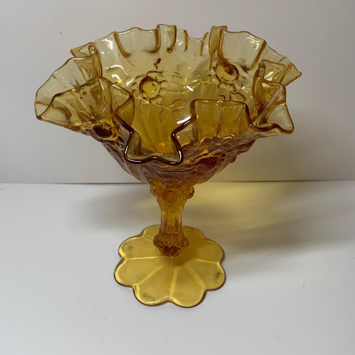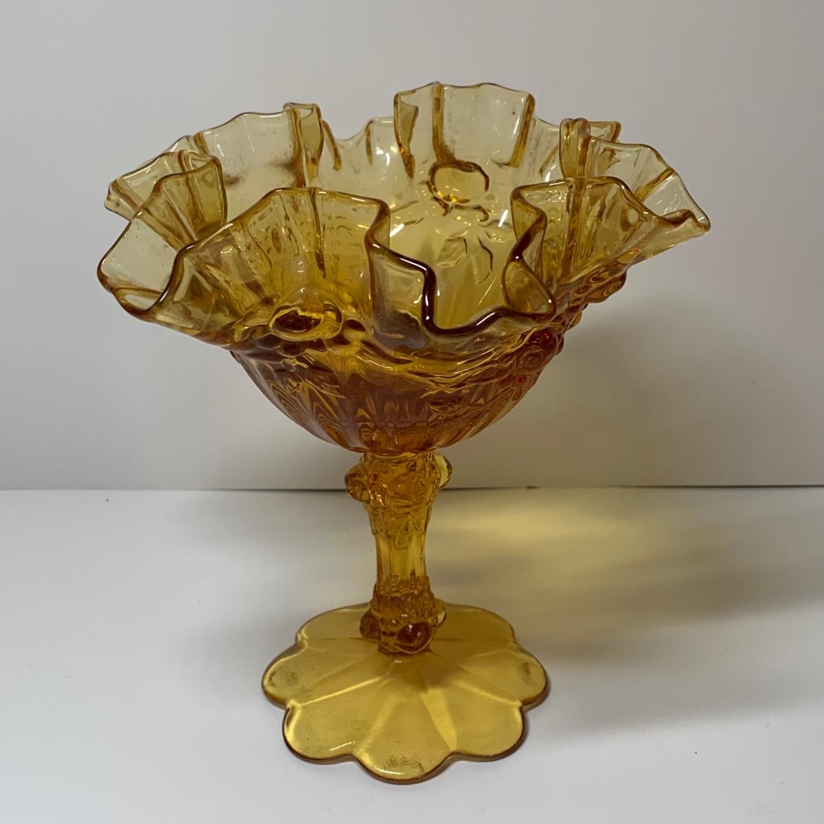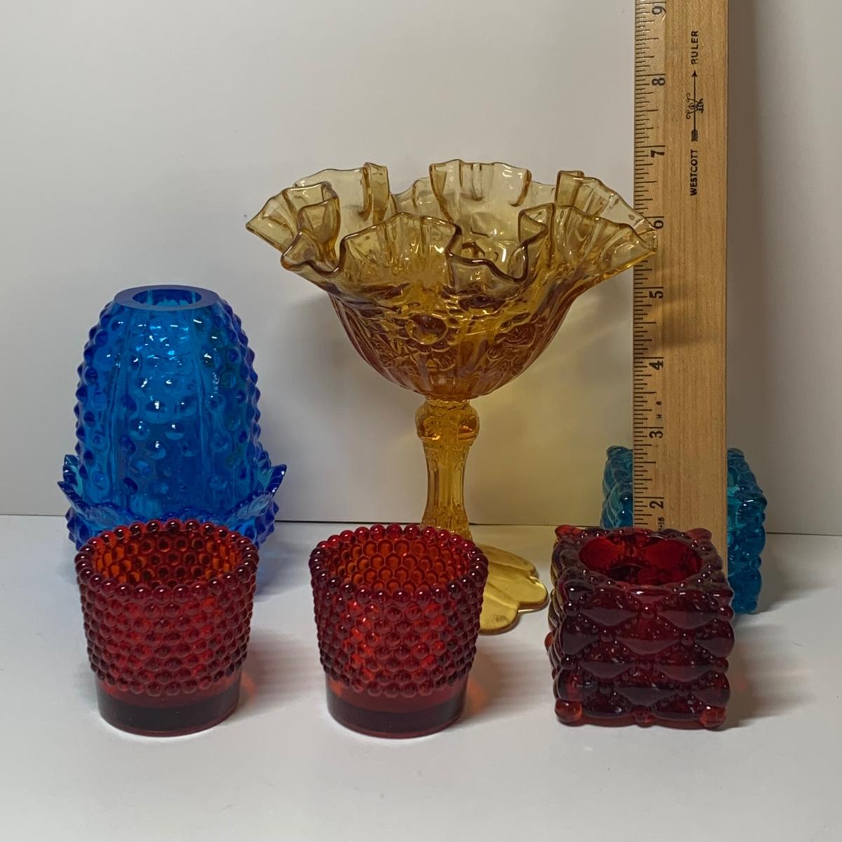 LOT 153R: Fenton Amber Ruffle Top Compote, Fenton Colonial Blue Hobnail Candle Holder & More