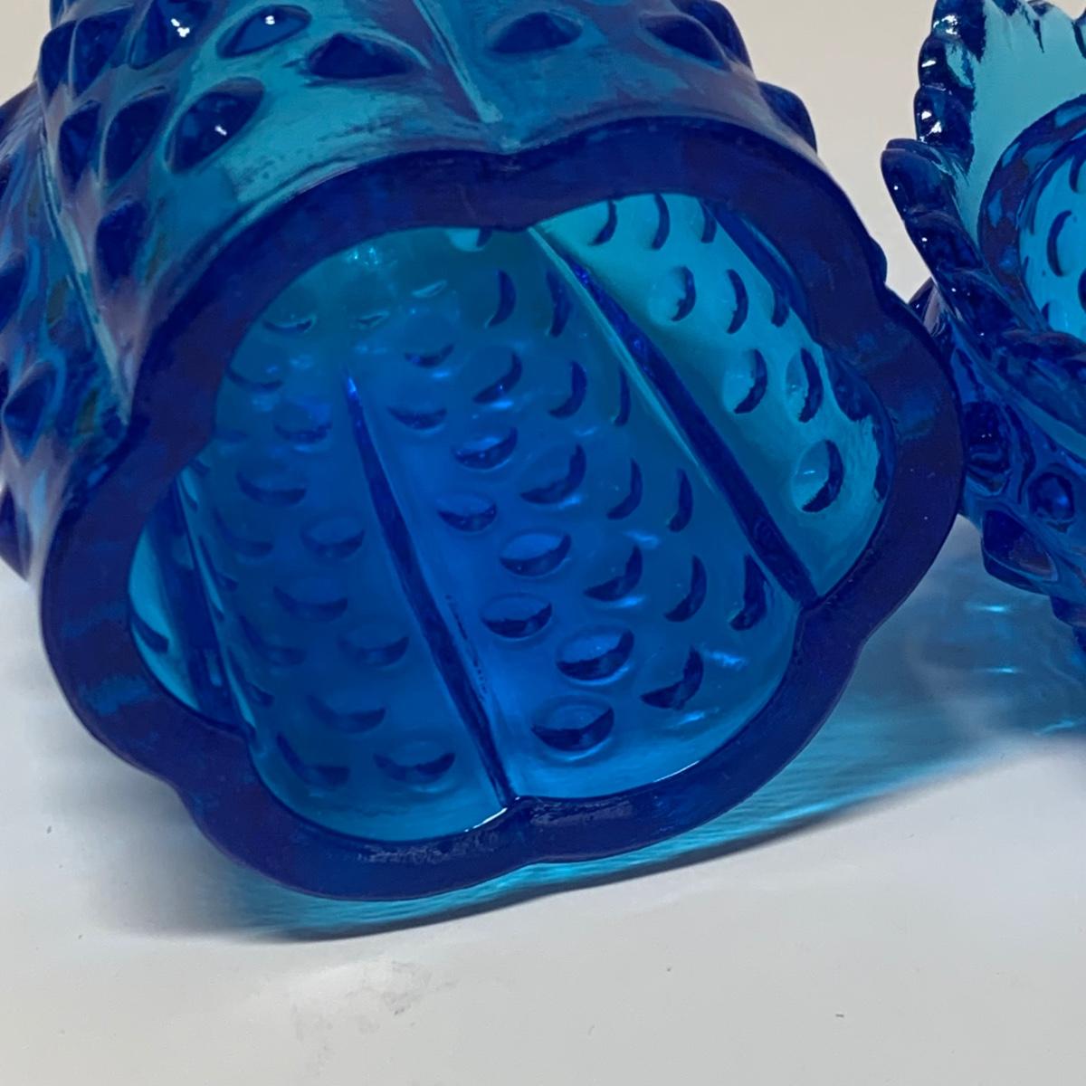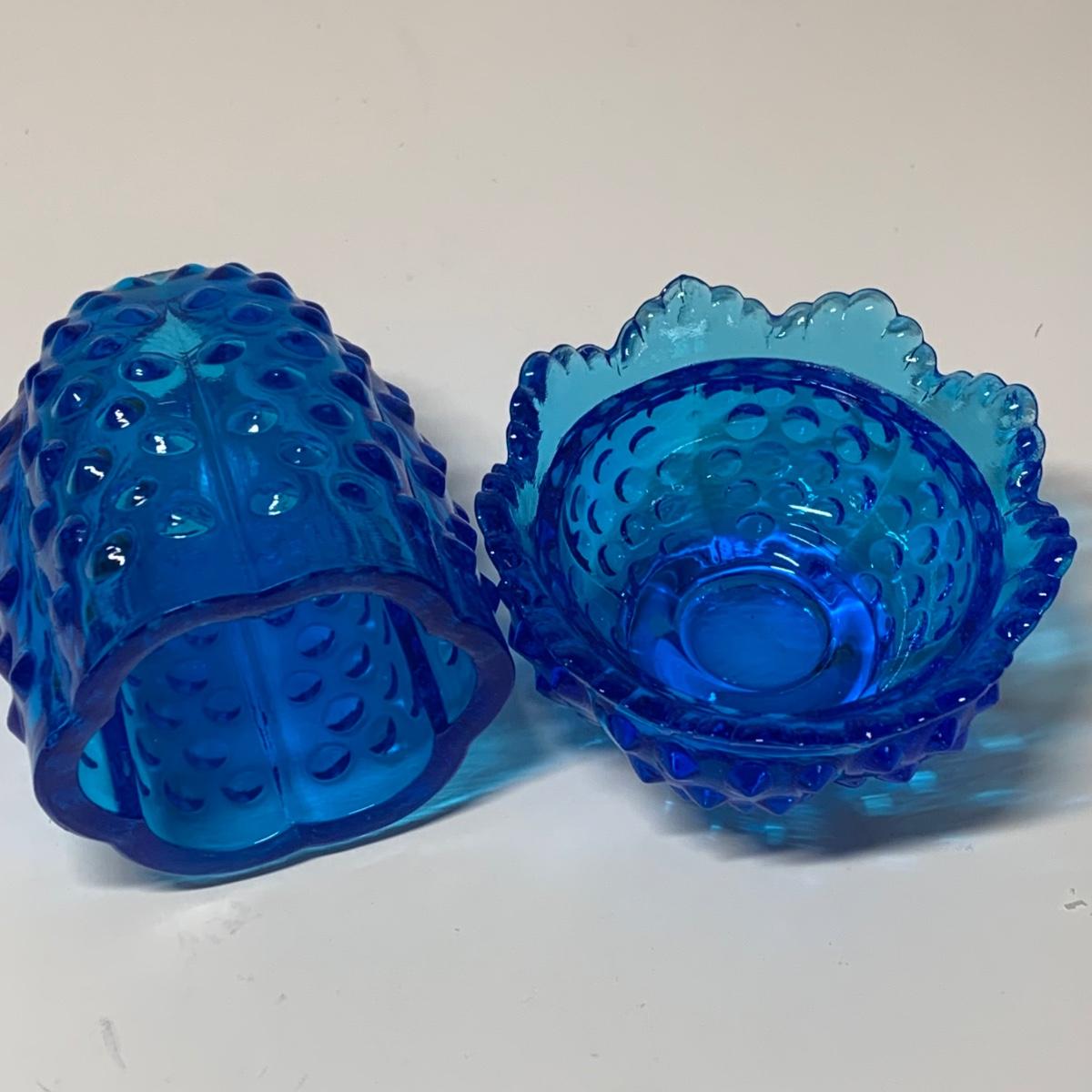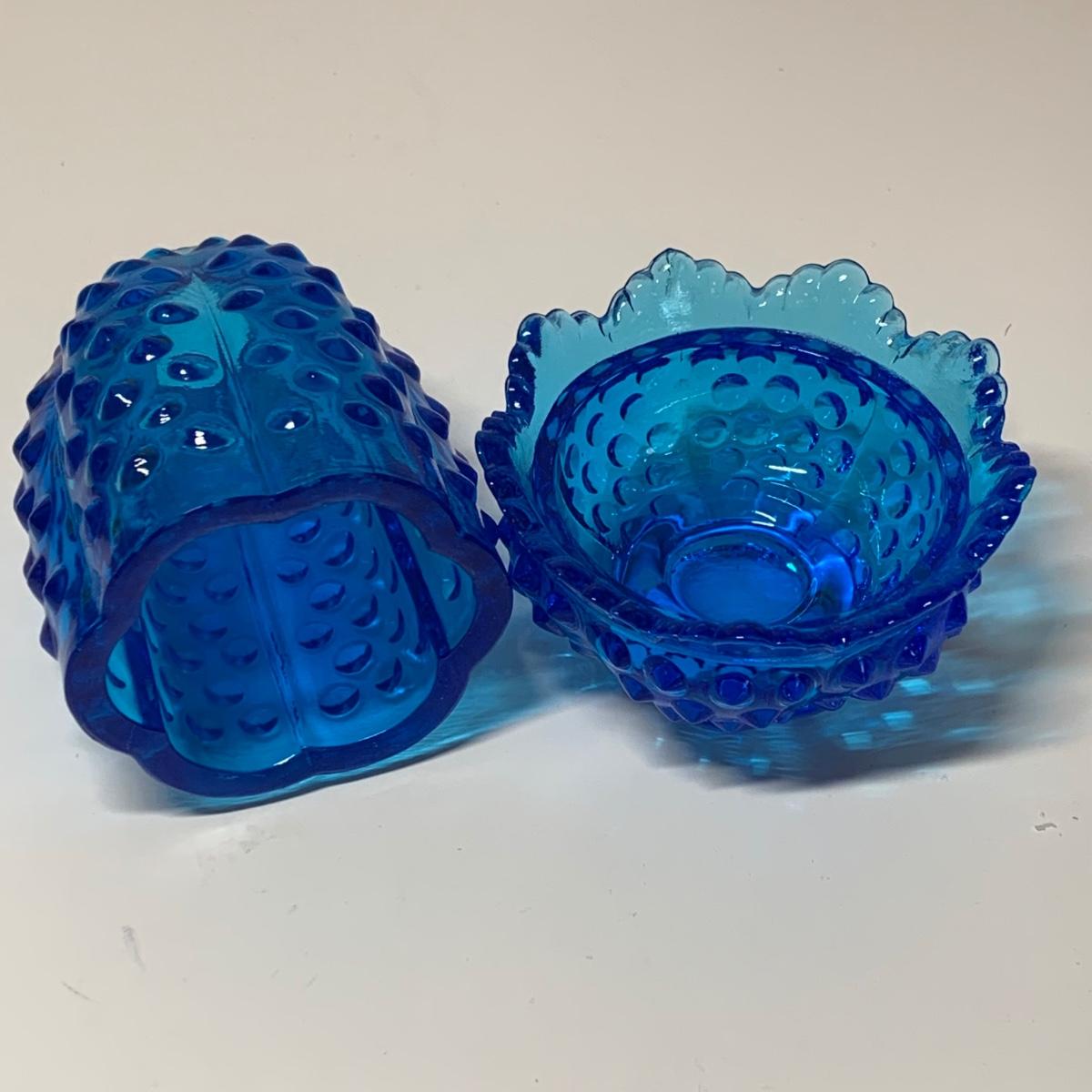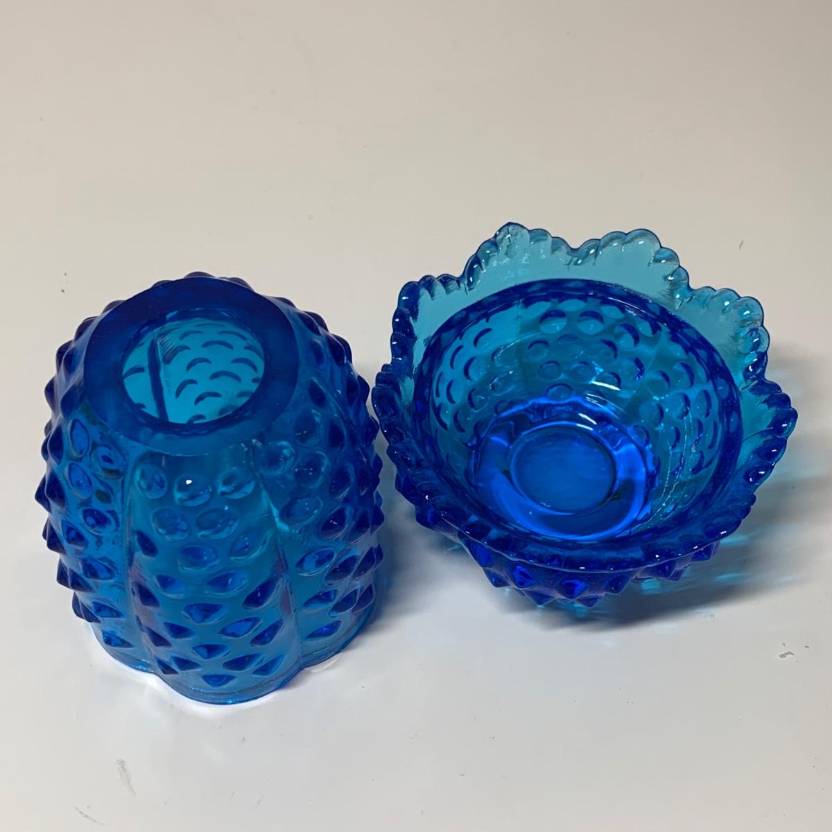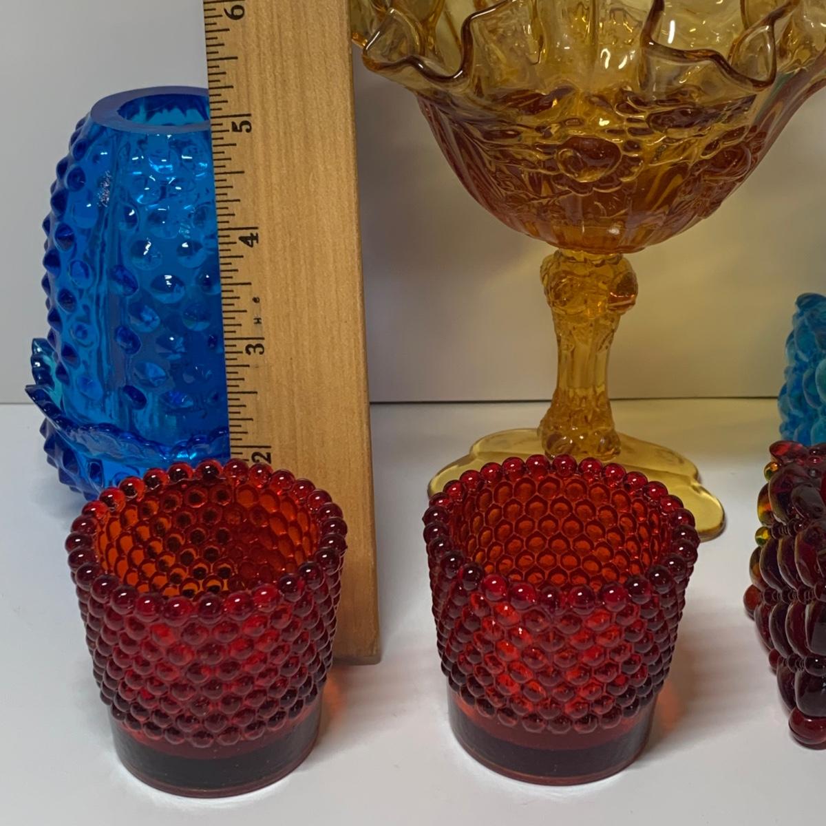 LOT 153R: Fenton Amber Ruffle Top Compote, Fenton Colonial Blue Hobnail Candle Holder & More