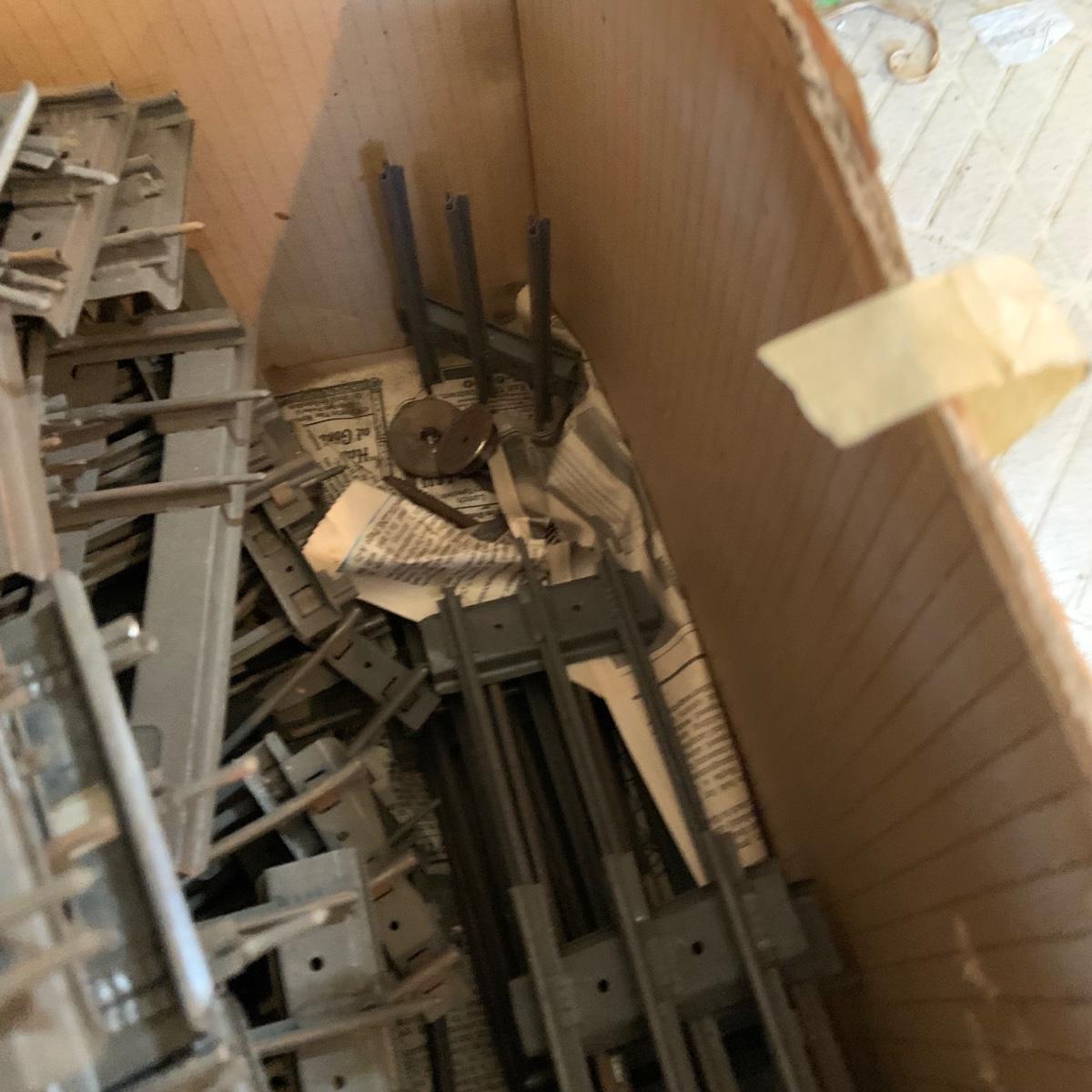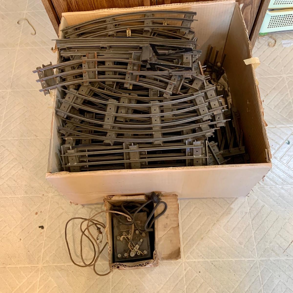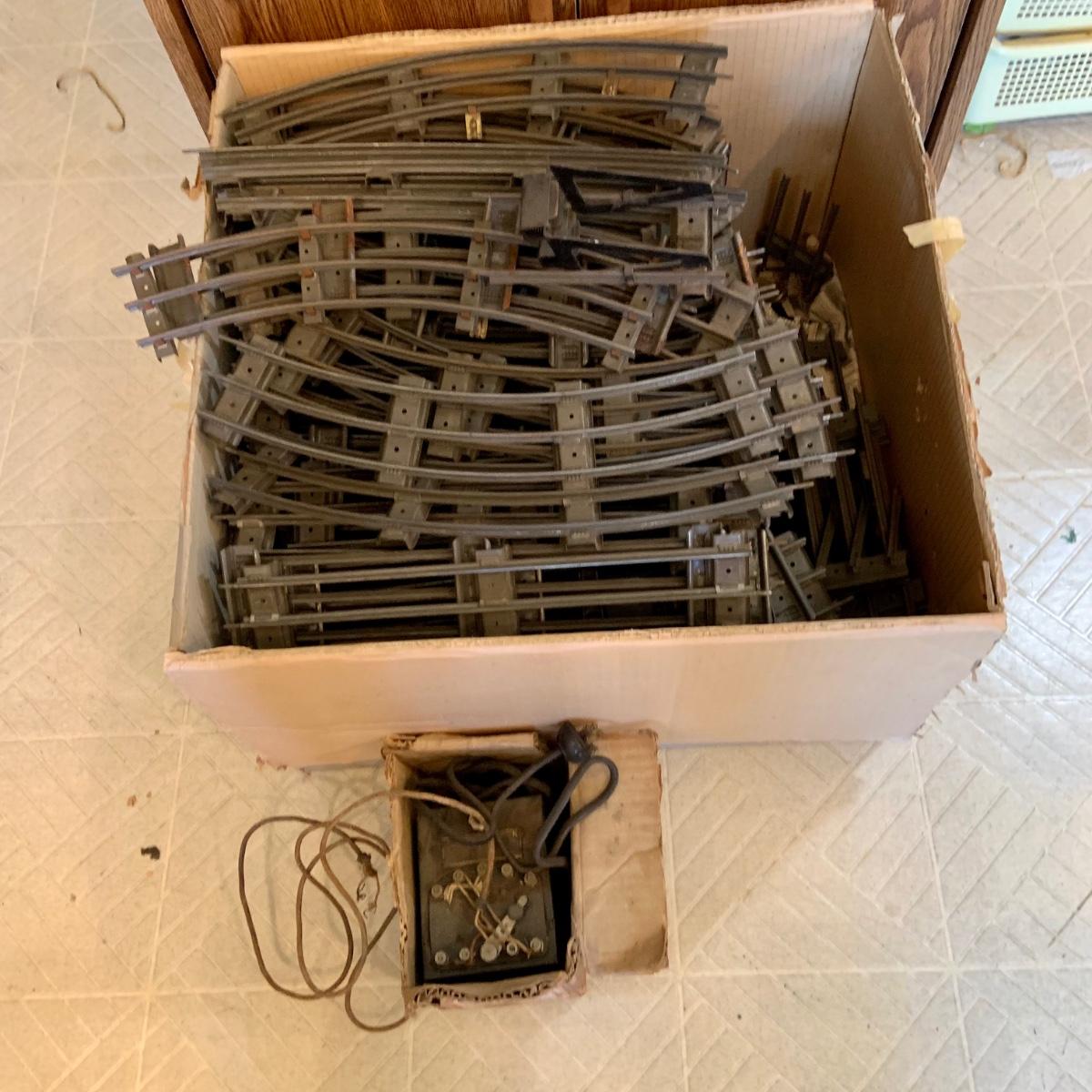 LOT:167G: Large Box of Lionel O- Gage Track and Very Old Lionel Transformer