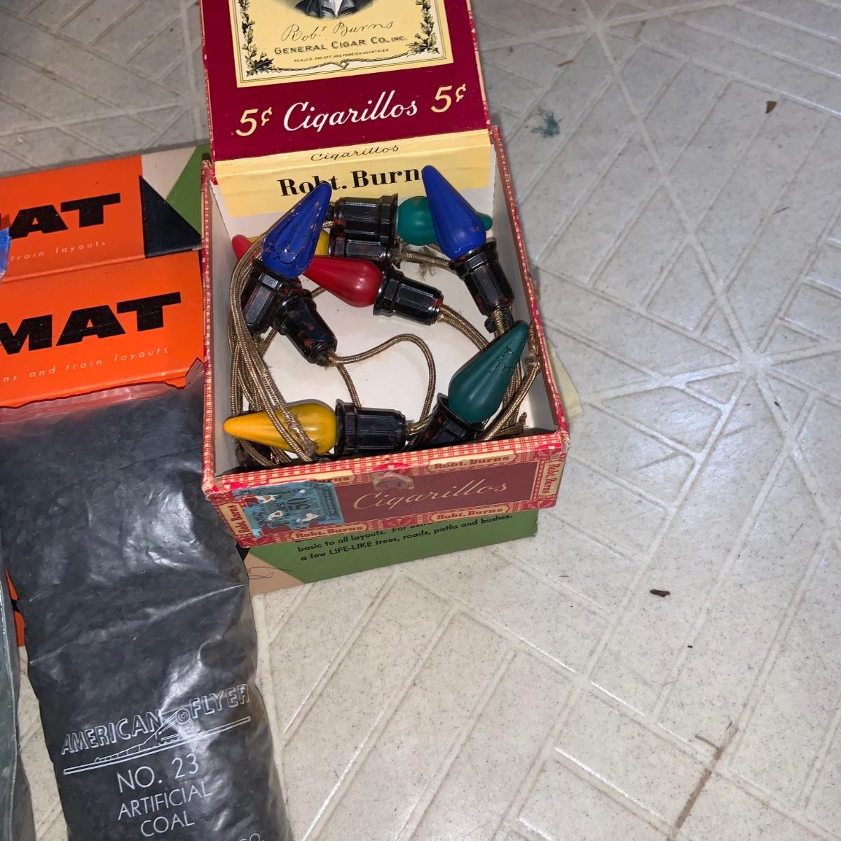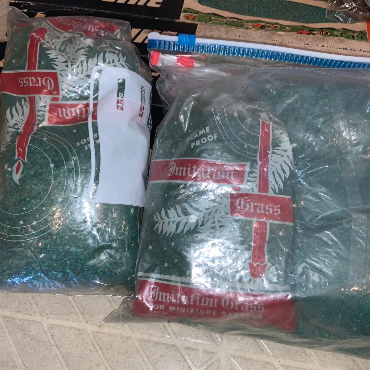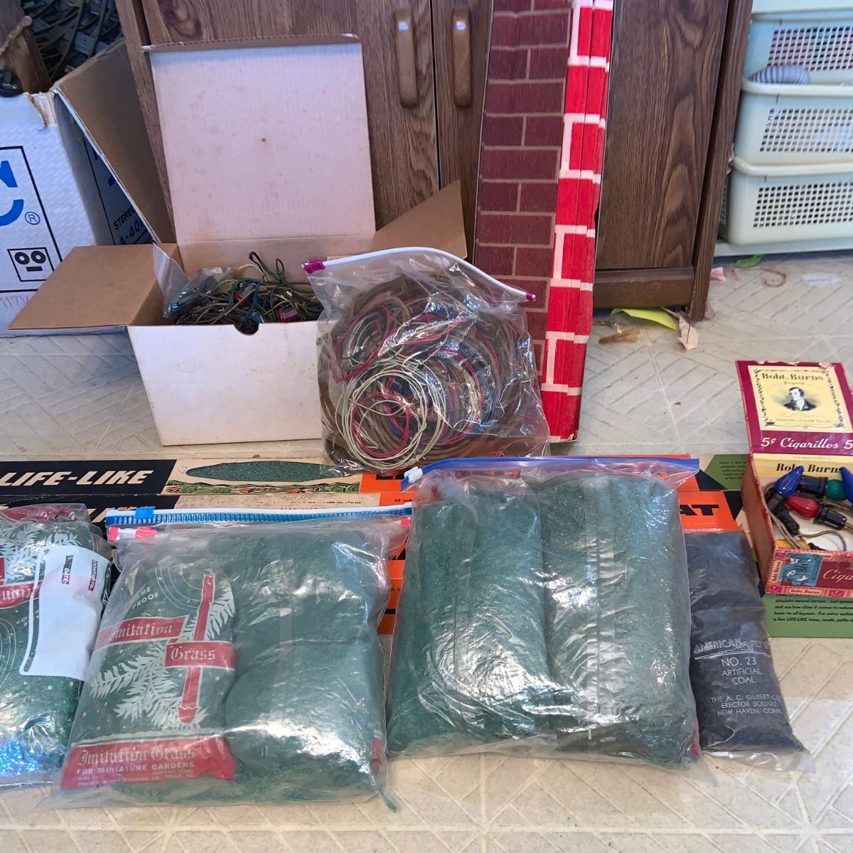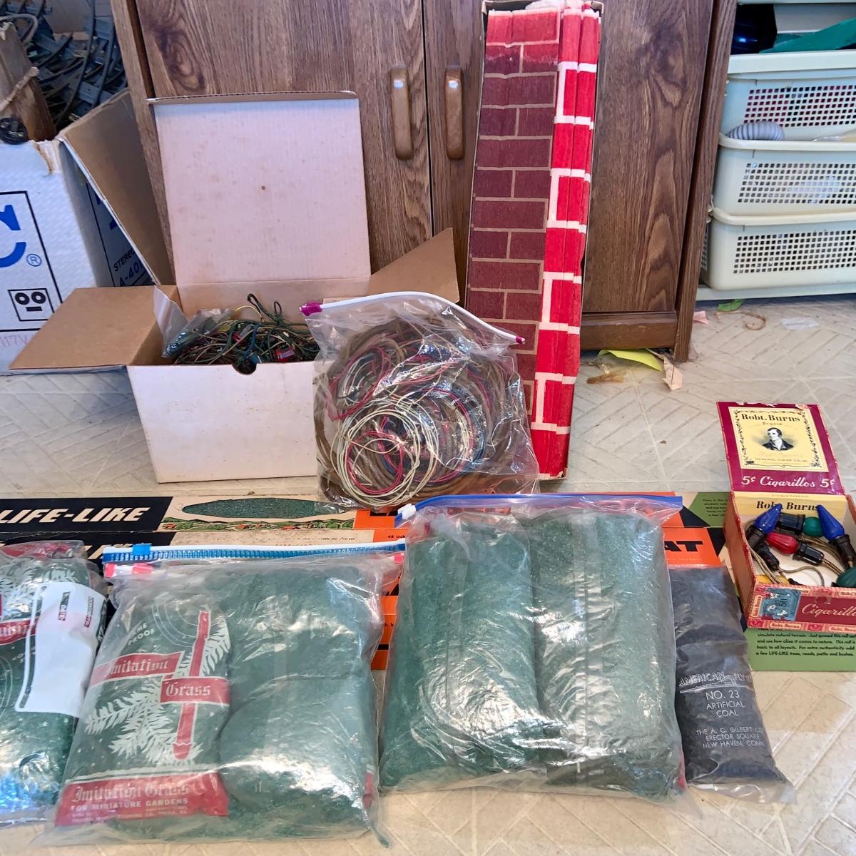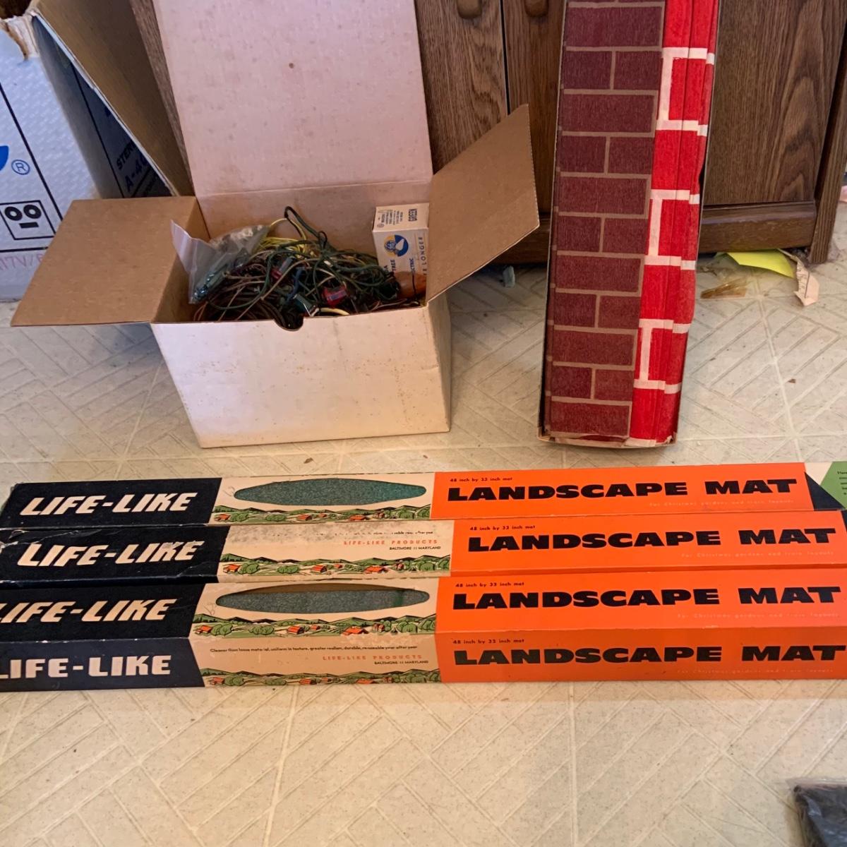 LOT:168G: Collection of Toy Train Landscape Essentials Including 3 Landscape Mats, Atrificial Coal, Vintage Lights, Artificial Grass and More