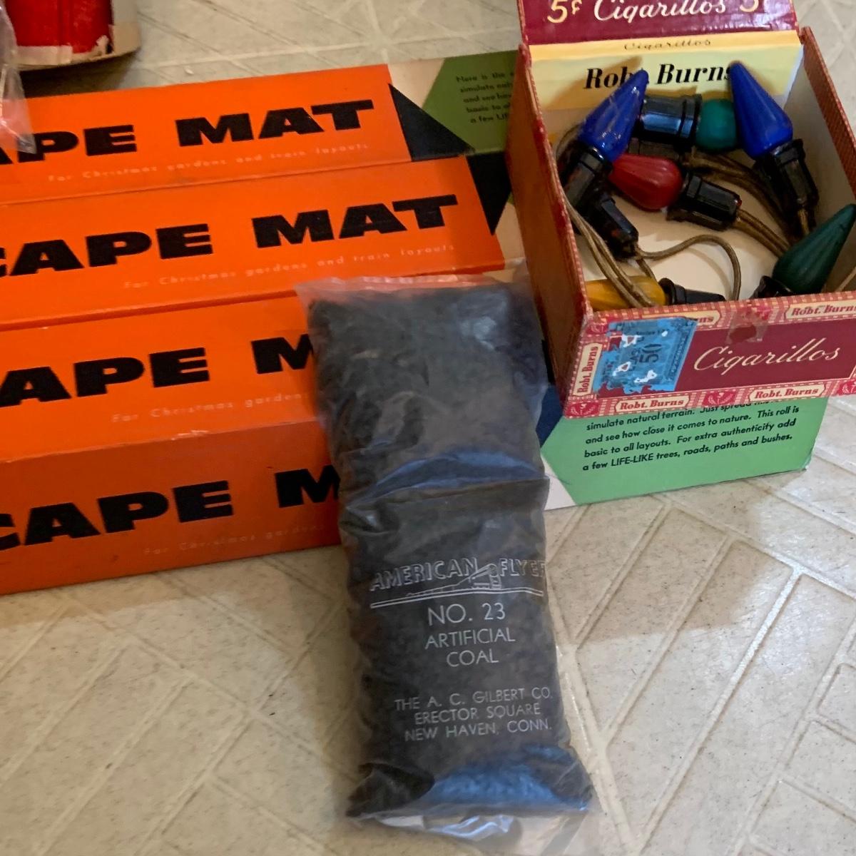 LOT:168G:  Collection of Toy Train Landscape Essentials Including 3 Landscape Mats, Atrificial Coal, Vintage Lights, Artificial Grass and More