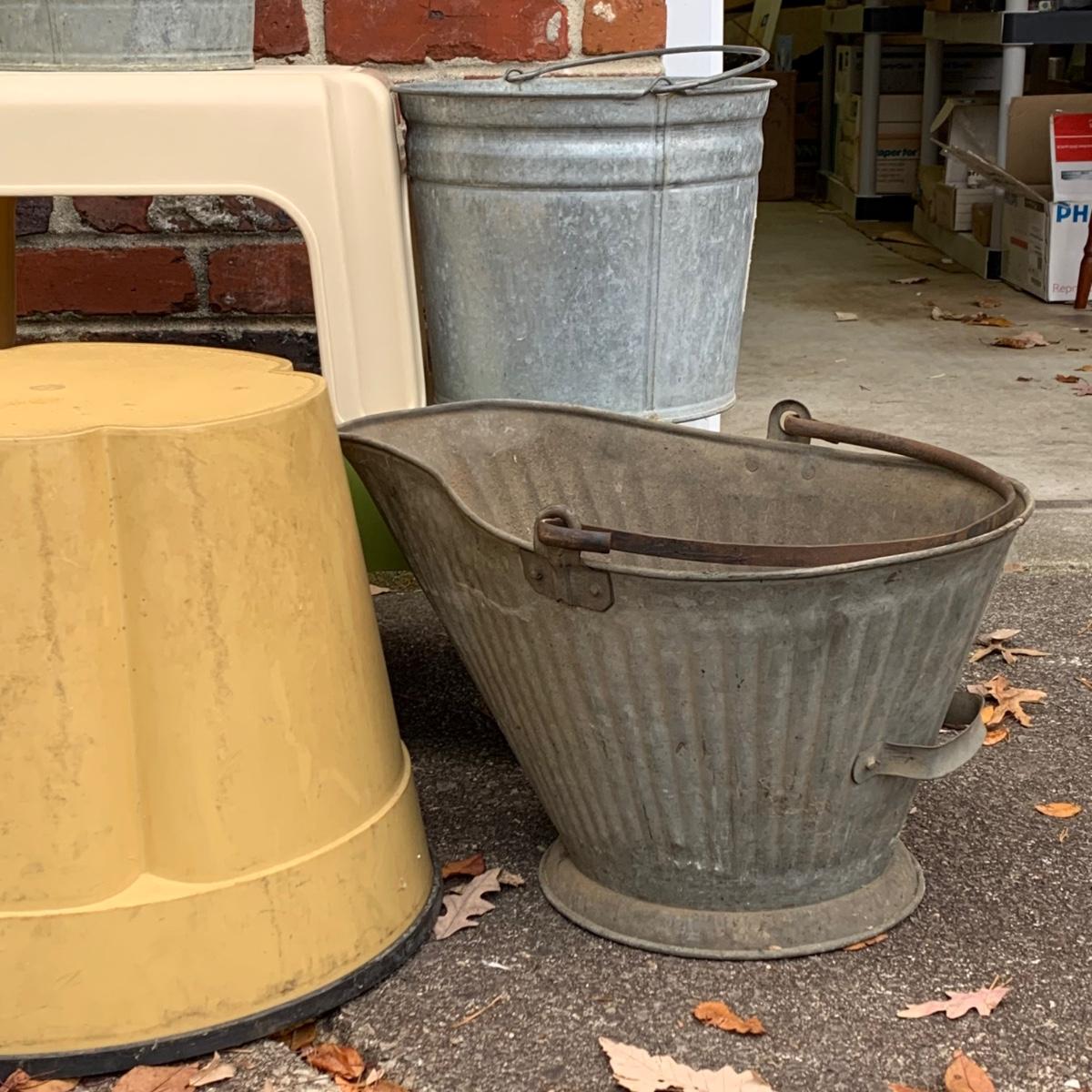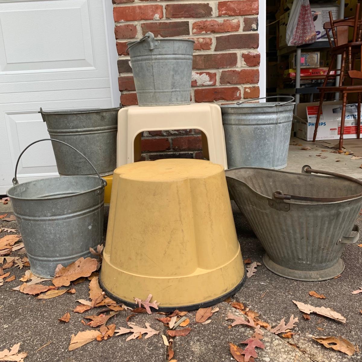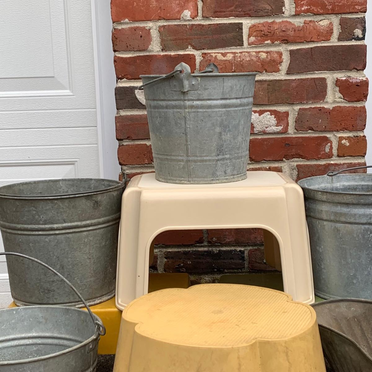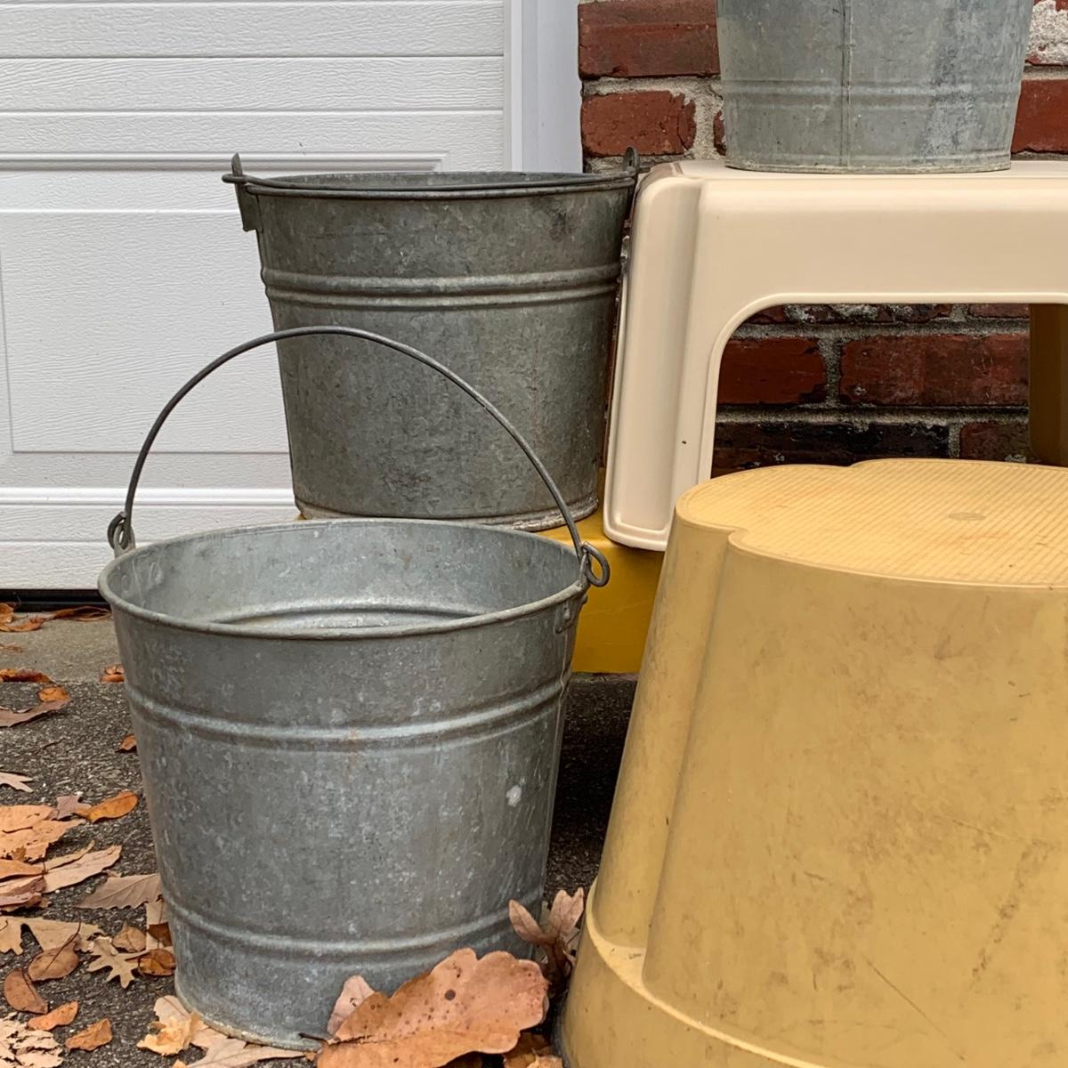 LOT 219R: Galvanized Steel Buckets, Ash Pail and Vintage Step Stools