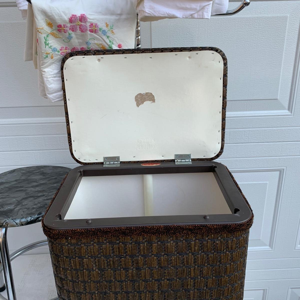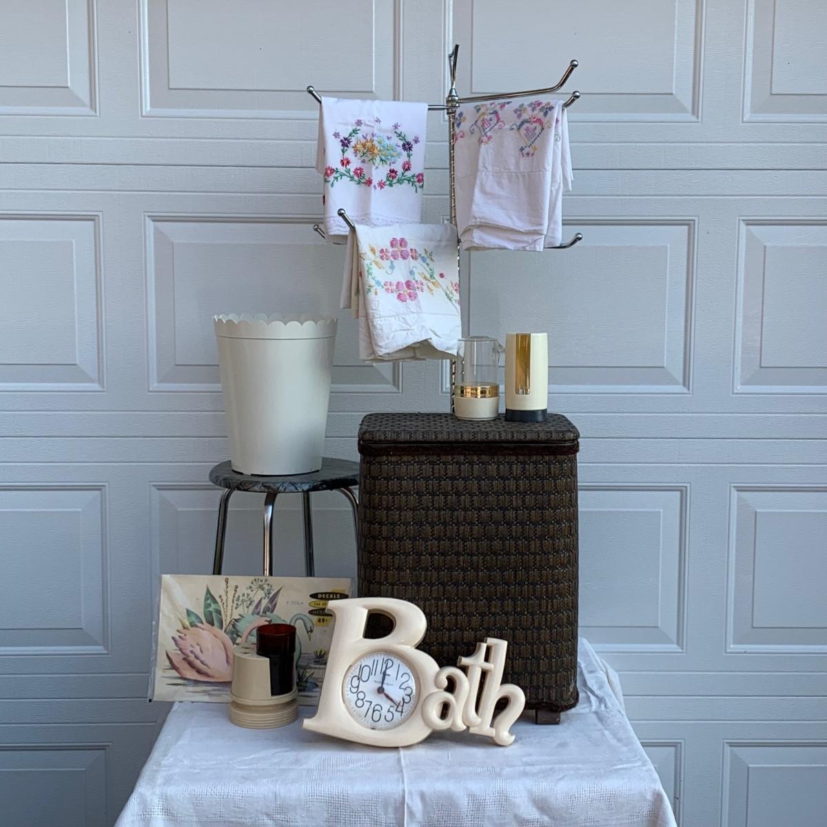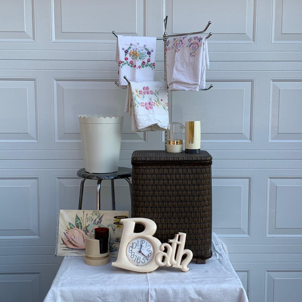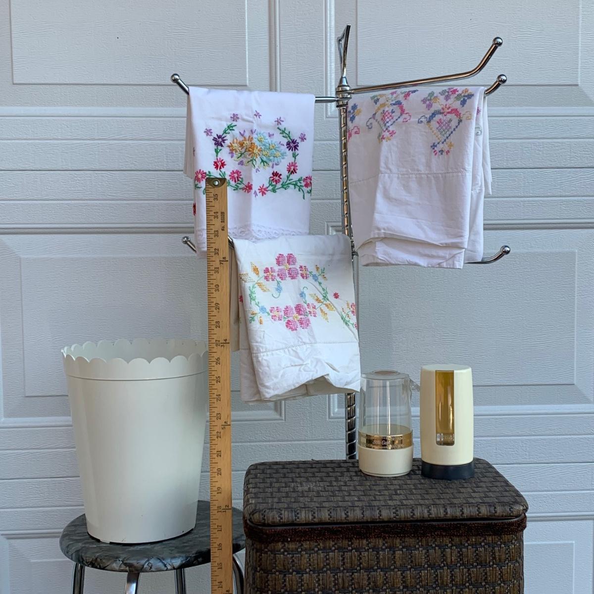 LOT 224R: Bath &n Bed Collection: Redmon Wicker Style Hamper, Needlework Pillowcases, Dixie Cup Dispensers, Standing Towel Bar & More