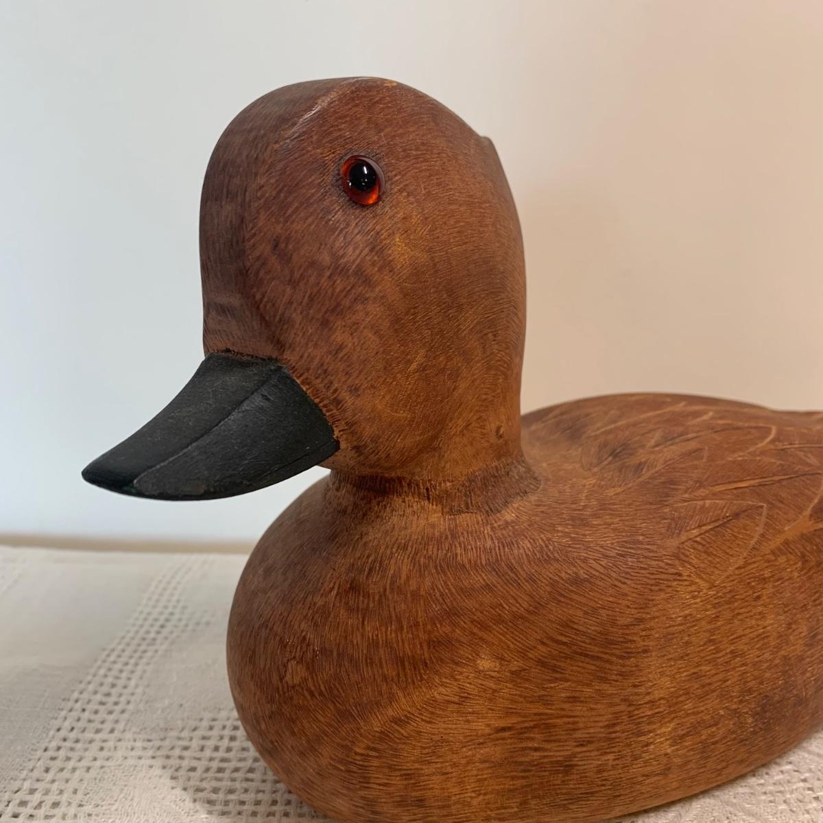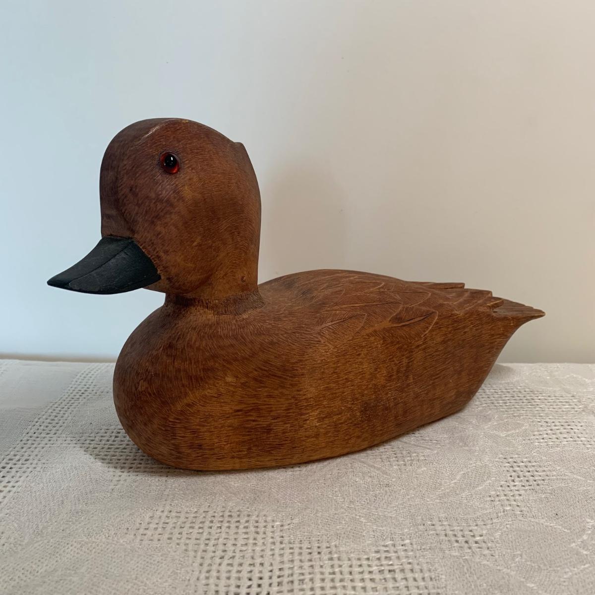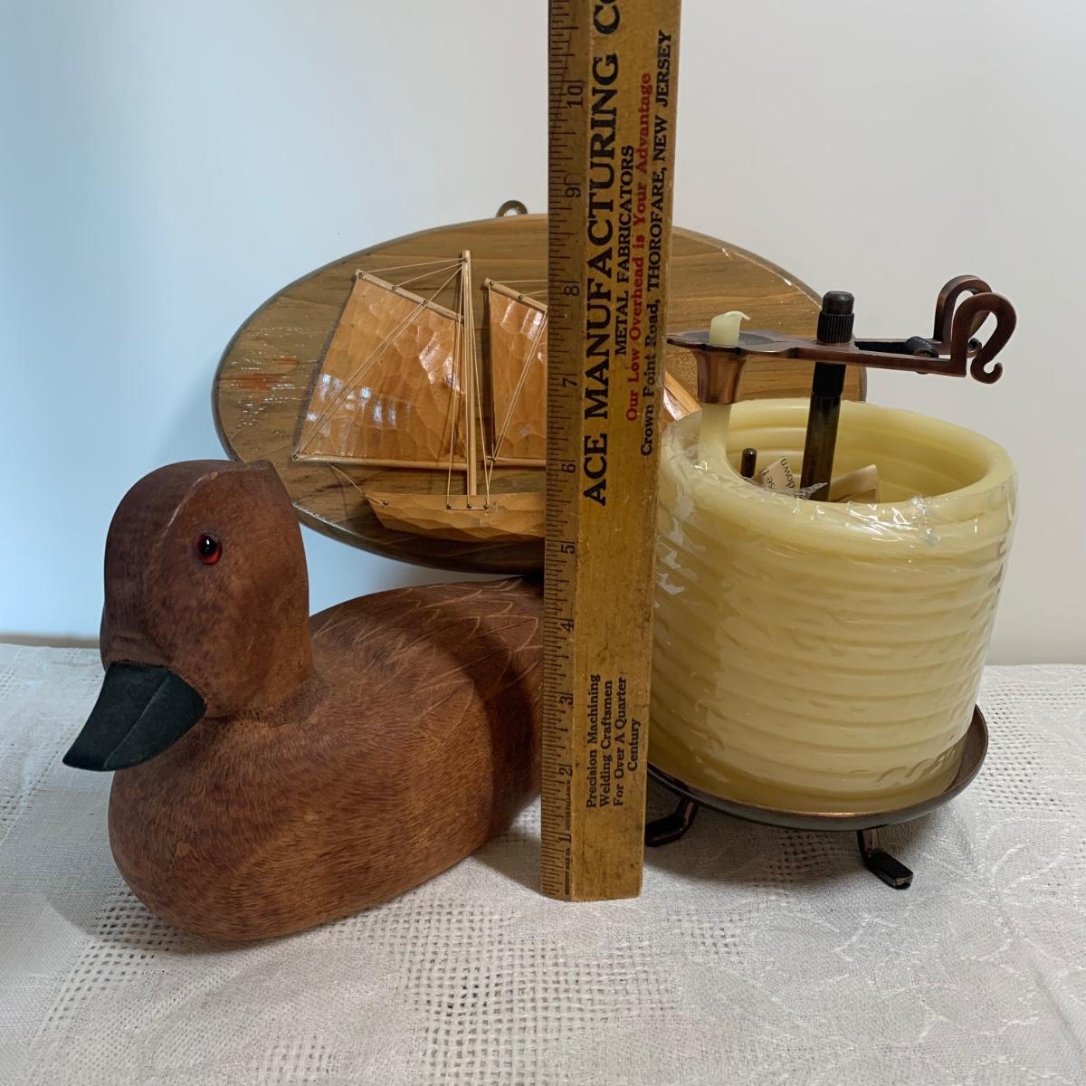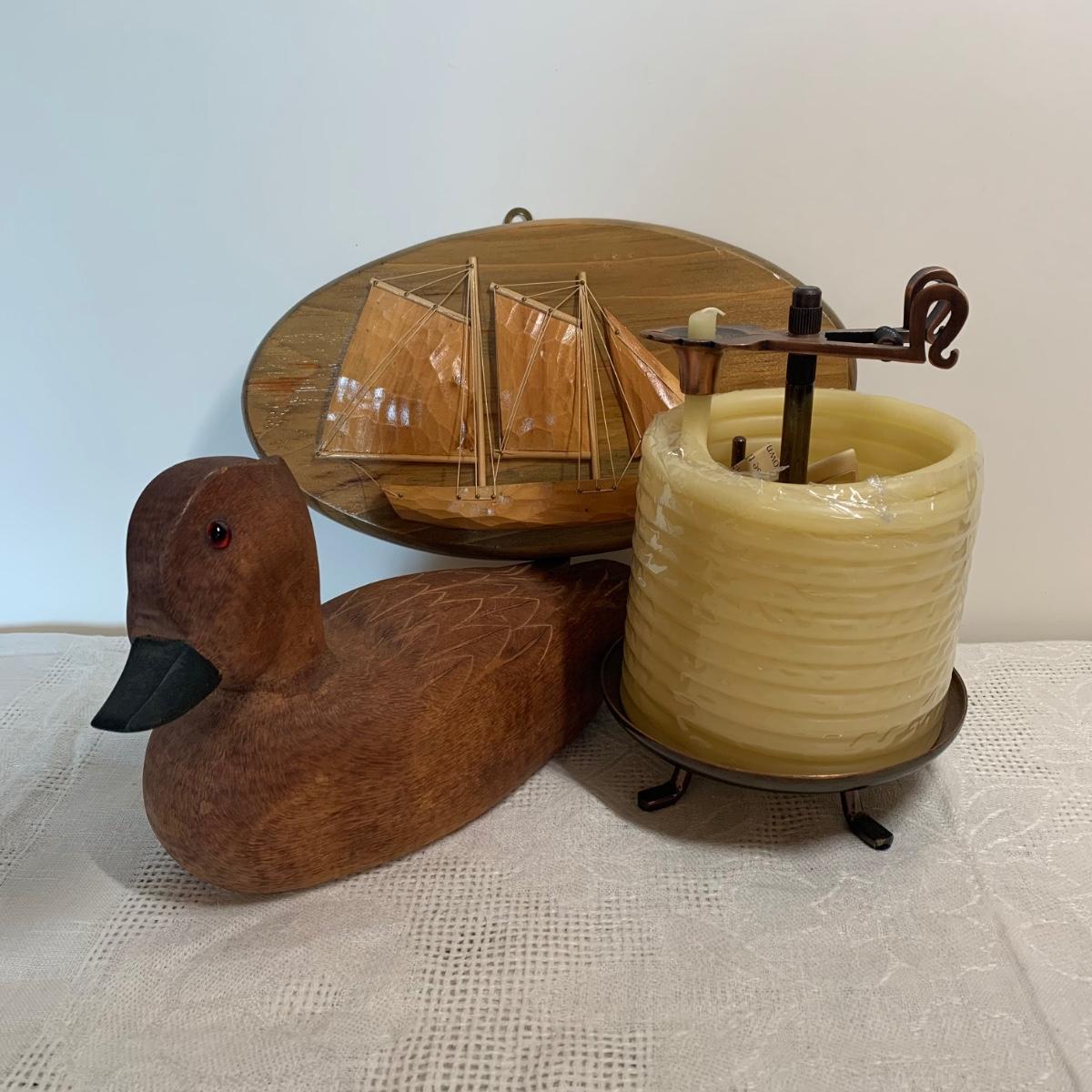 LOT 233R: Carved Wood Duck Decoy, Bees Wax Candle & Wood Clipper Ship Wall Art