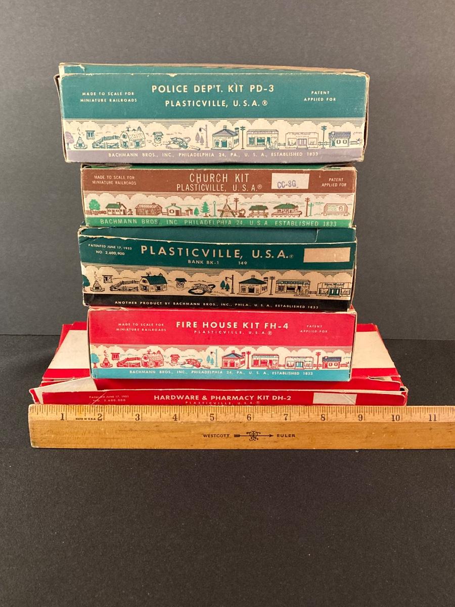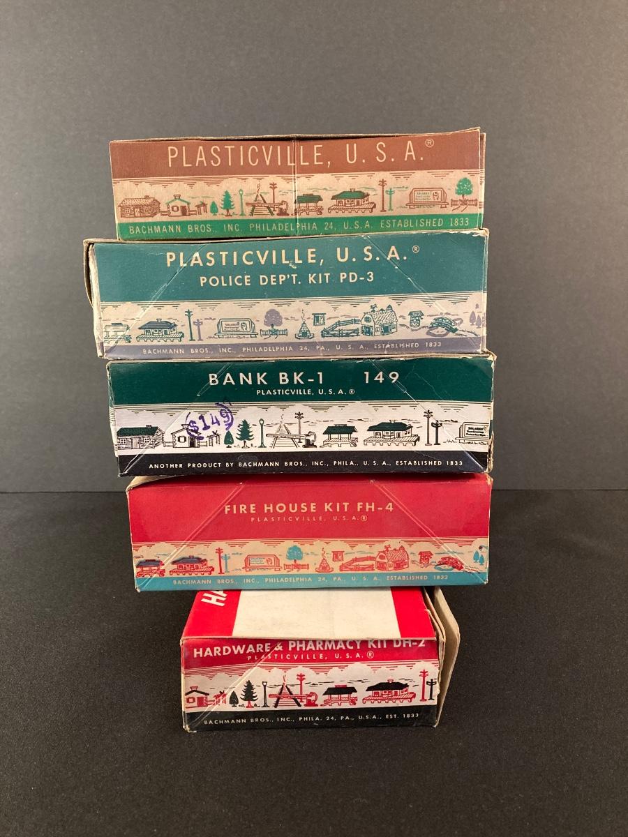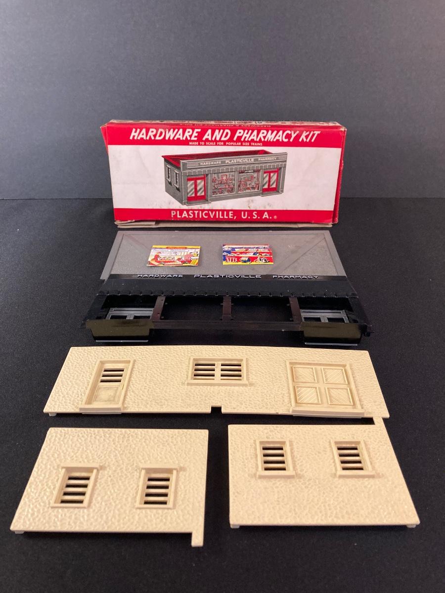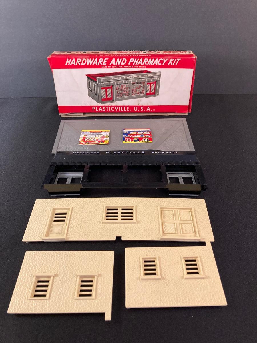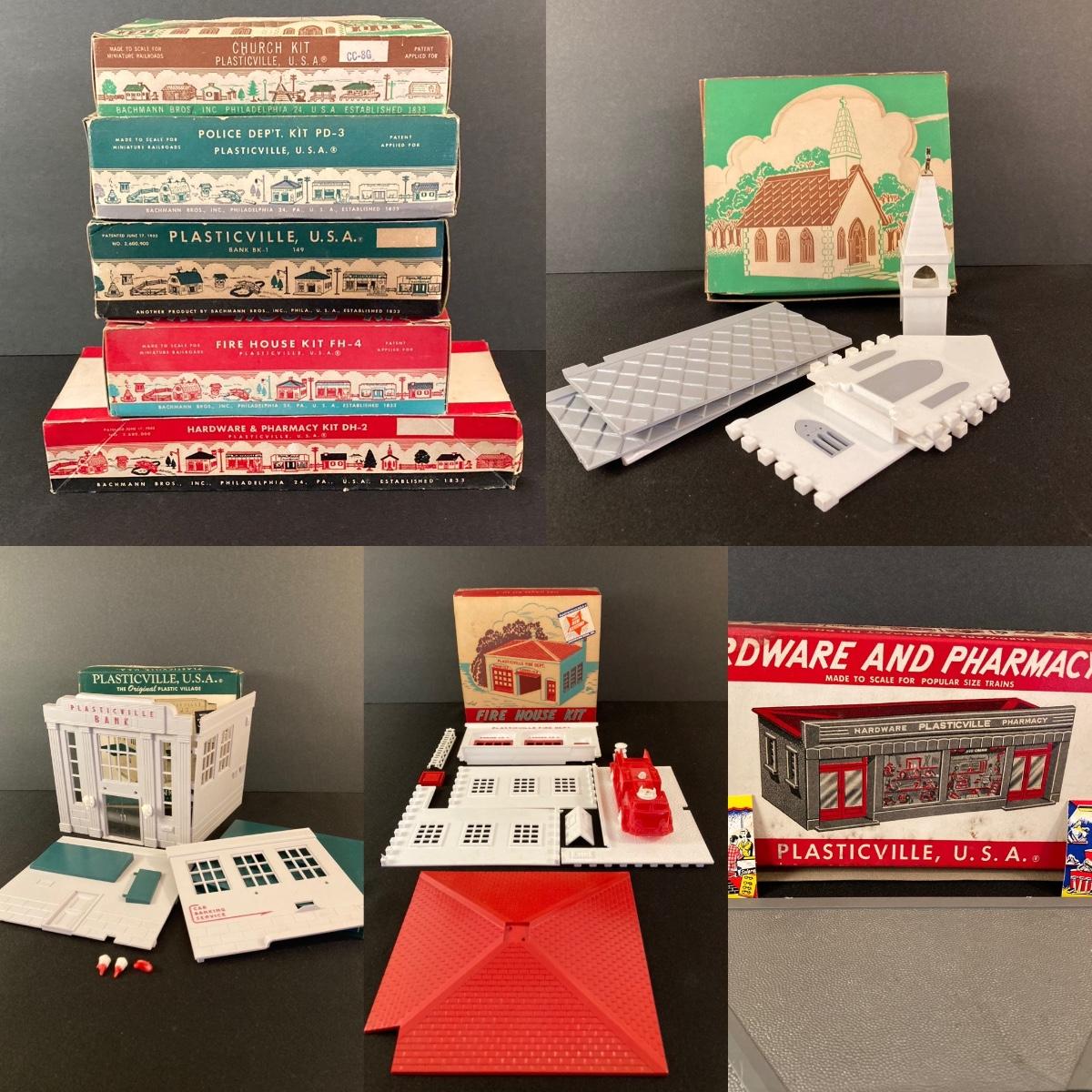 LOT 247J: Plasticville Kit Collection - Church, Police Dept., Bank, Fire House and Hardware / Pharmacy