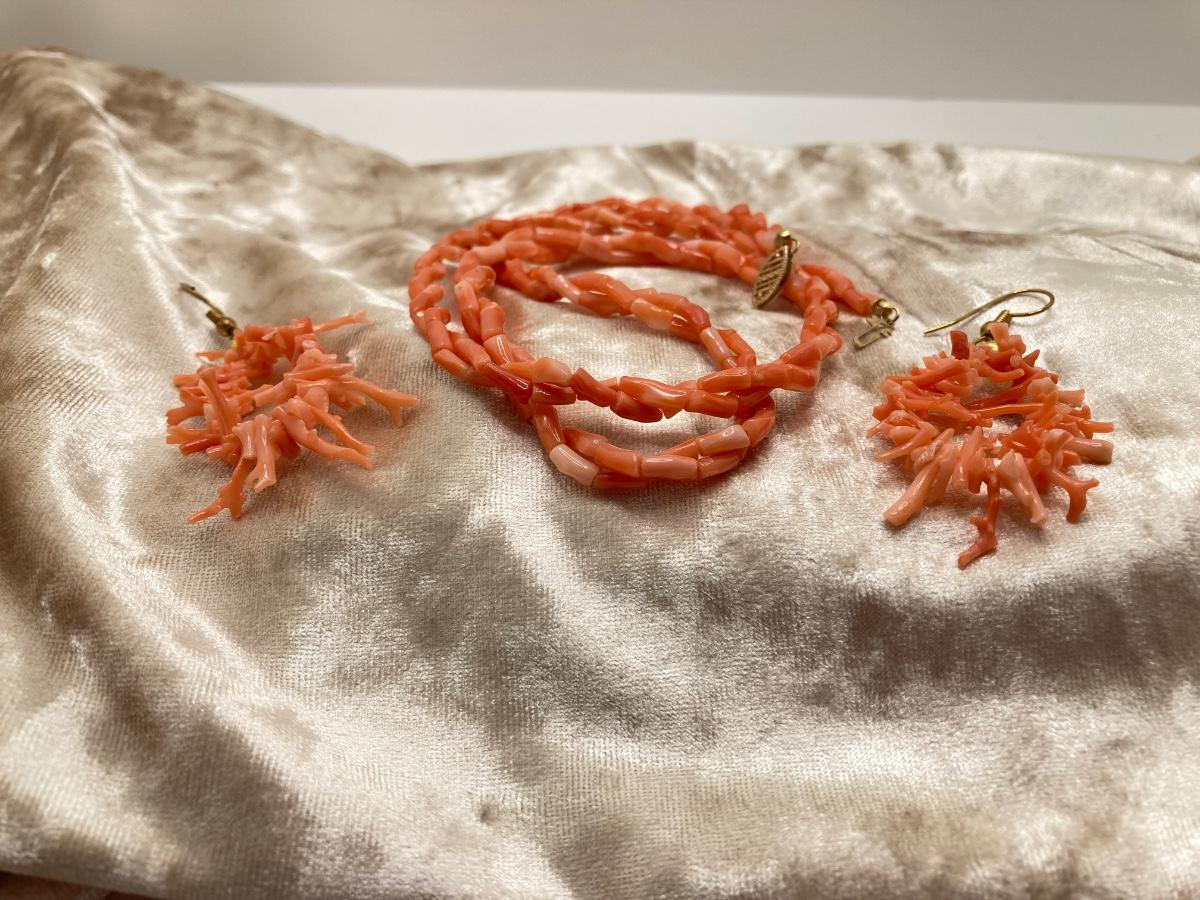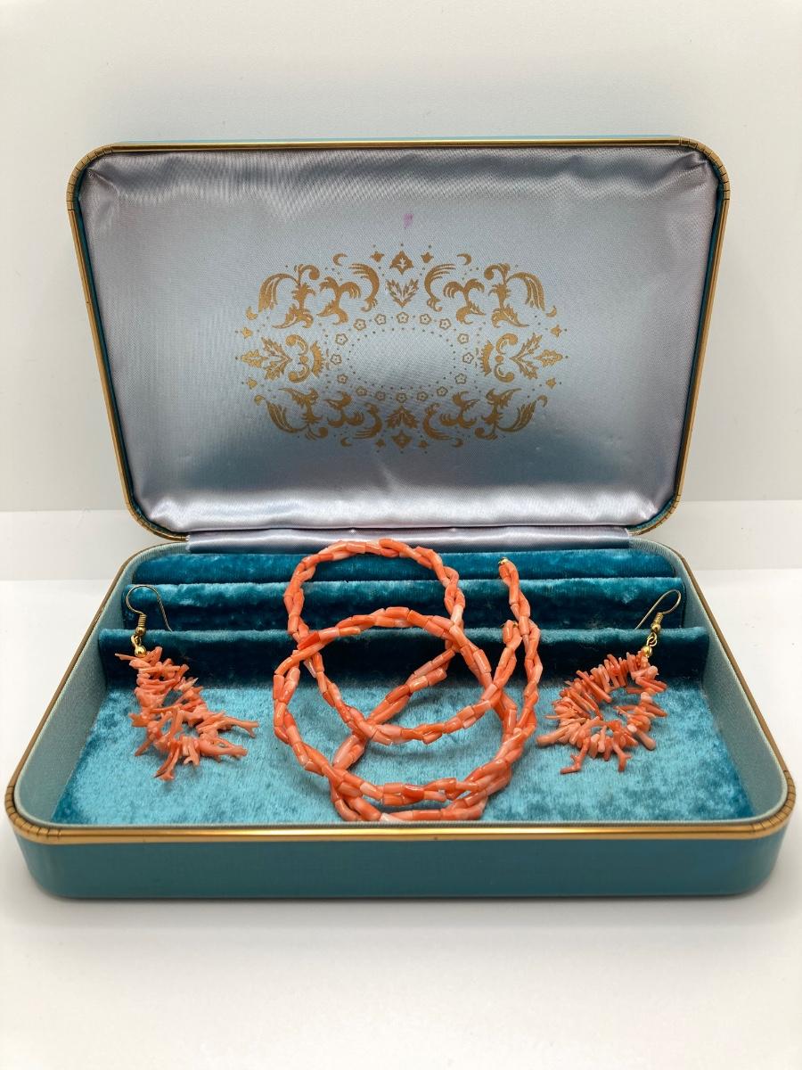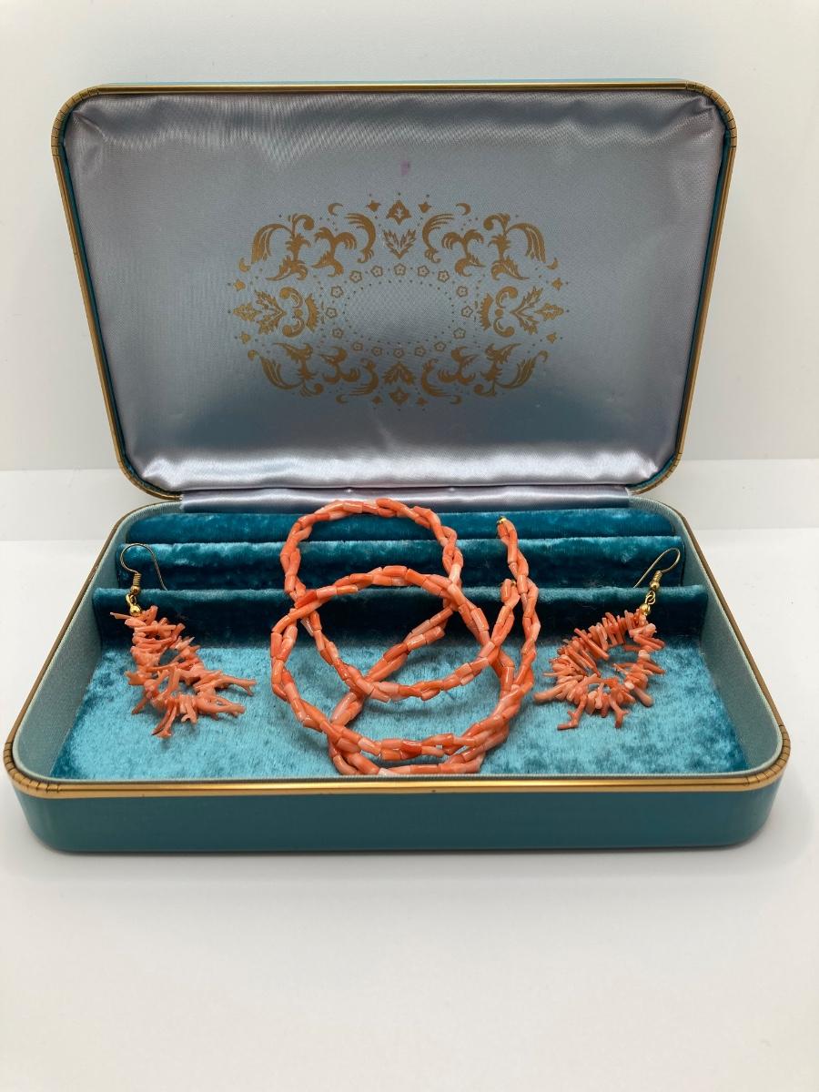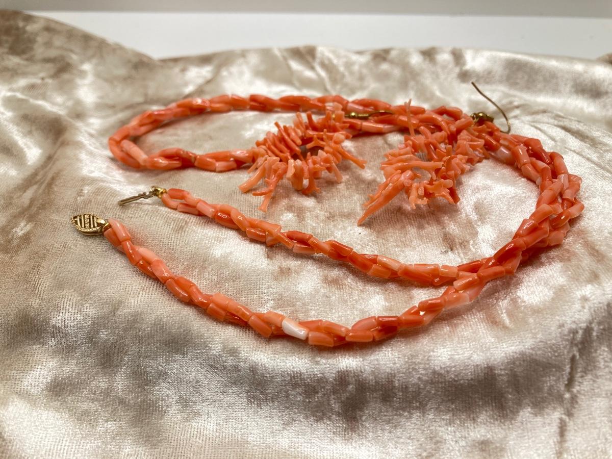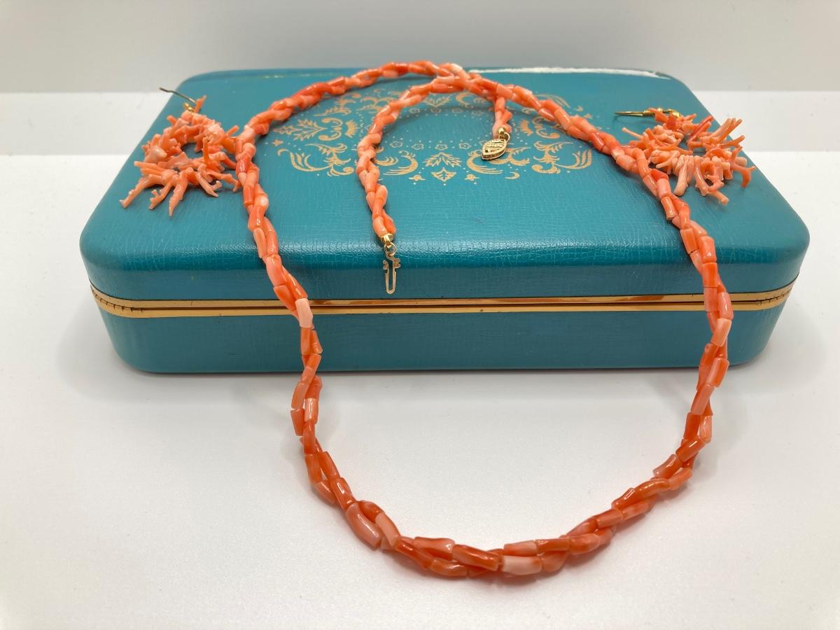 LOT 255J: Vintage Coral Necklace 14k clasp, Branch Coral Pierced Earrings & Vintage Jewelry Box