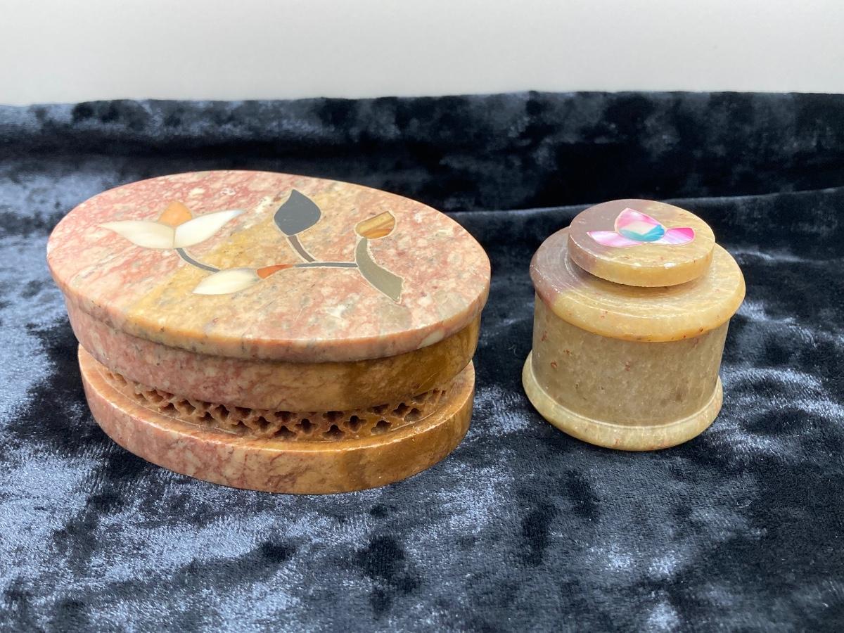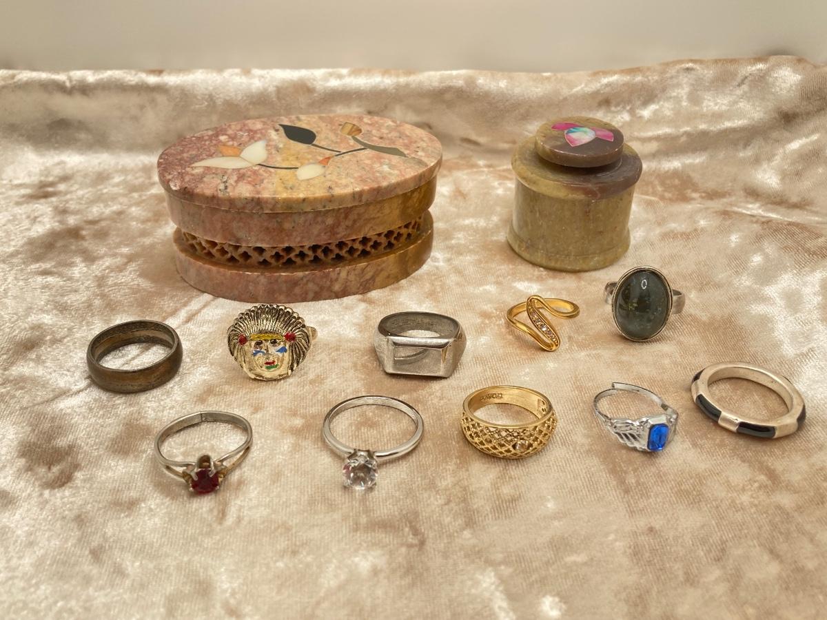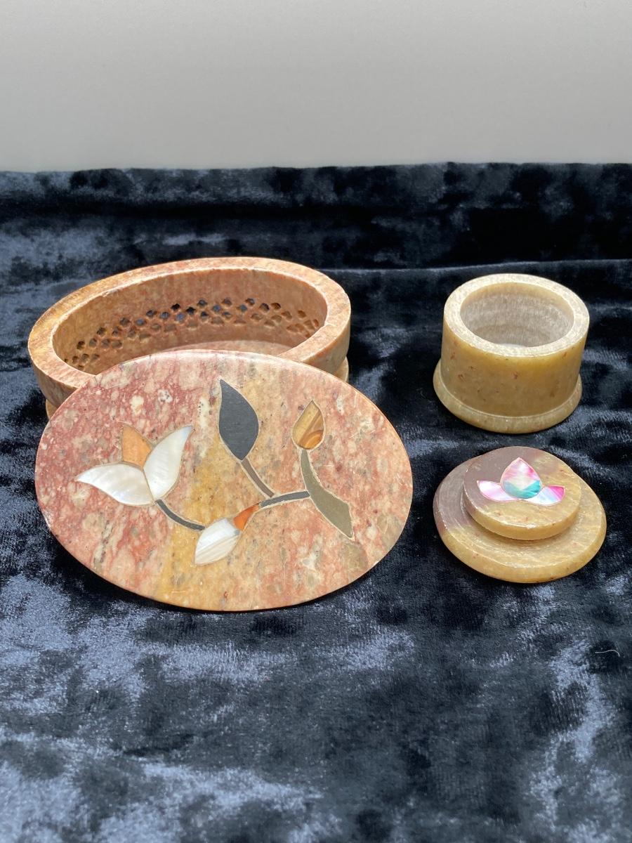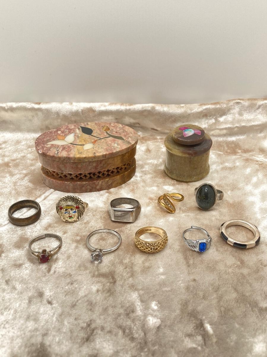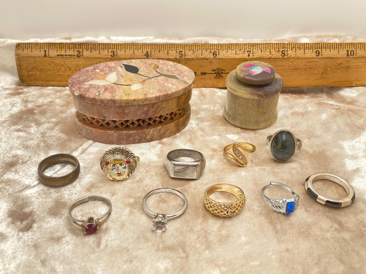 LOT 265J: Made in India Mother of Pearl Inlay Trinket Boxes with a Collection of Rings