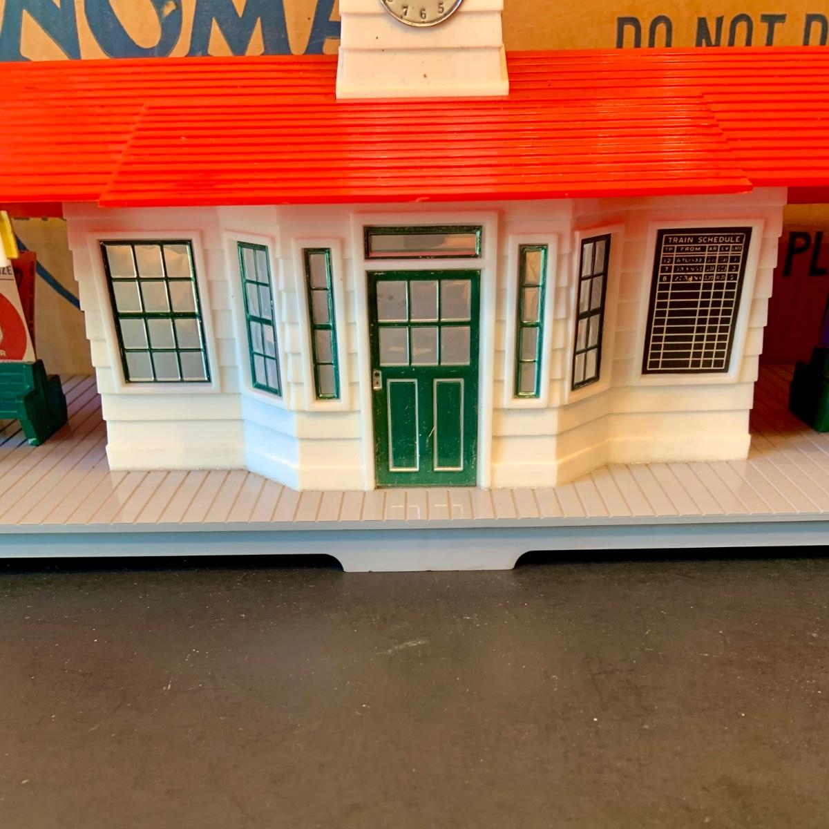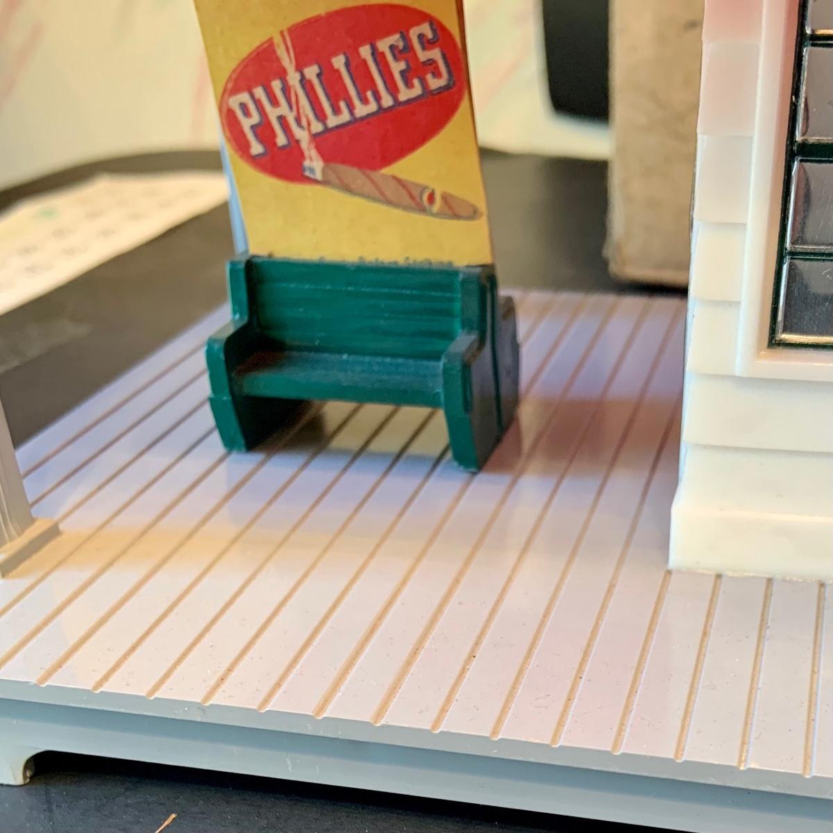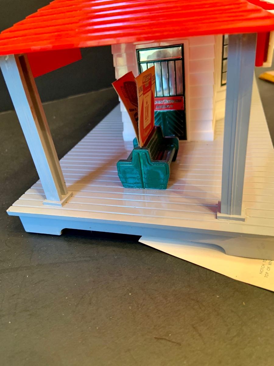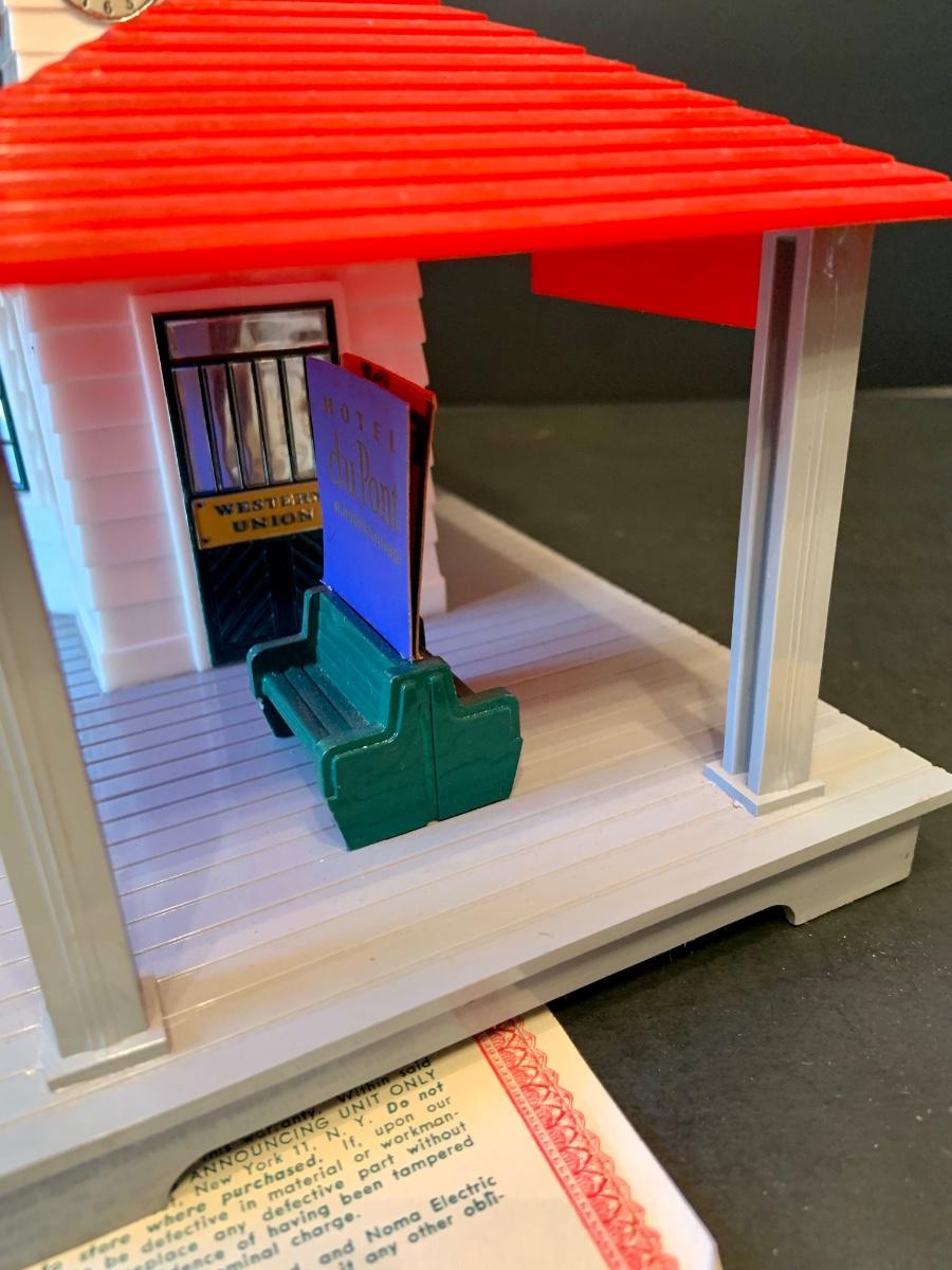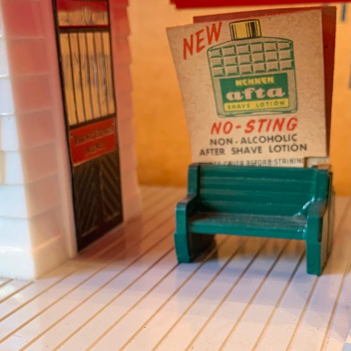 LOT:278G: Vintage Noma Tin Train Station Platform with Vintage Adverstisement Bench Signs.