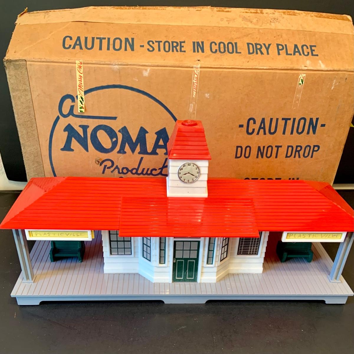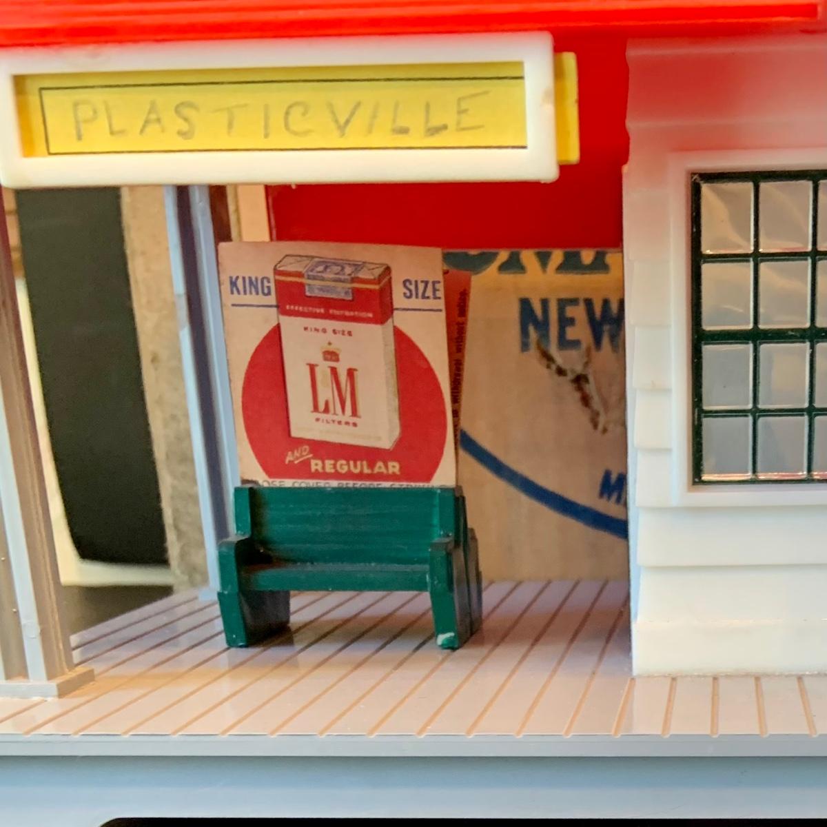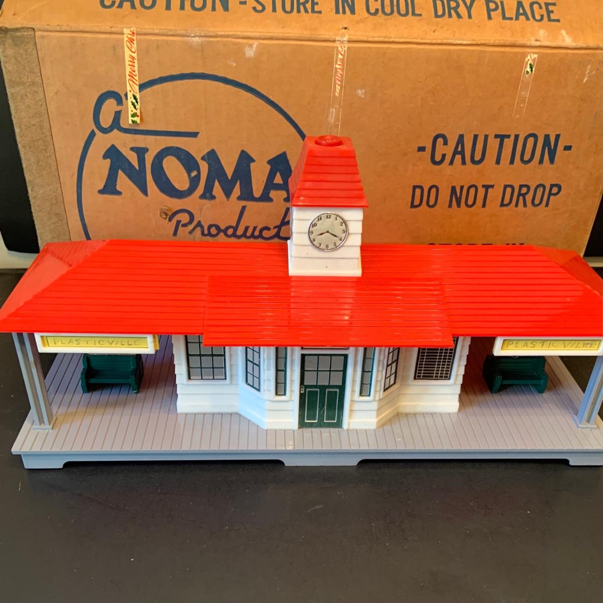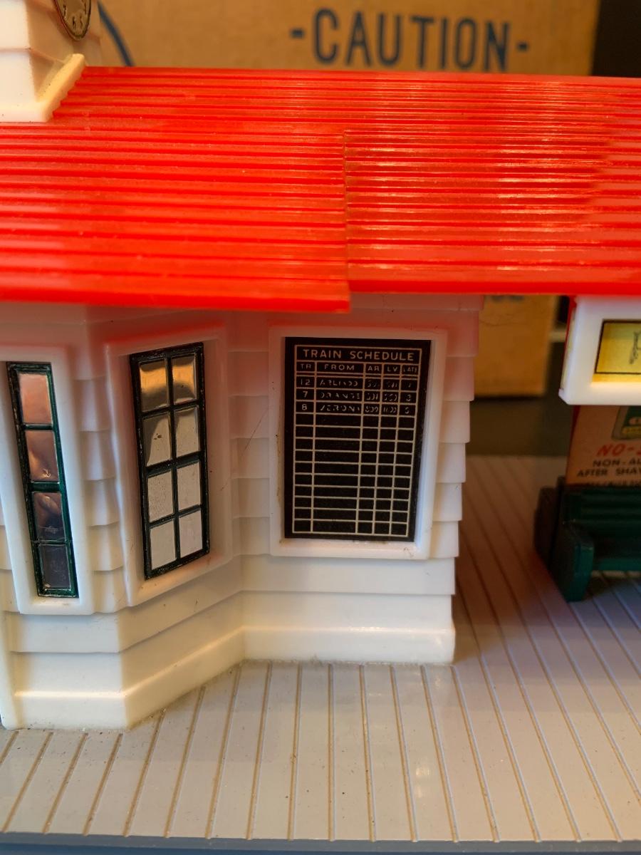 LOT:278G: Vintage Noma Tin Train Station Platform with Vintage Adverstisement Bench Signs.