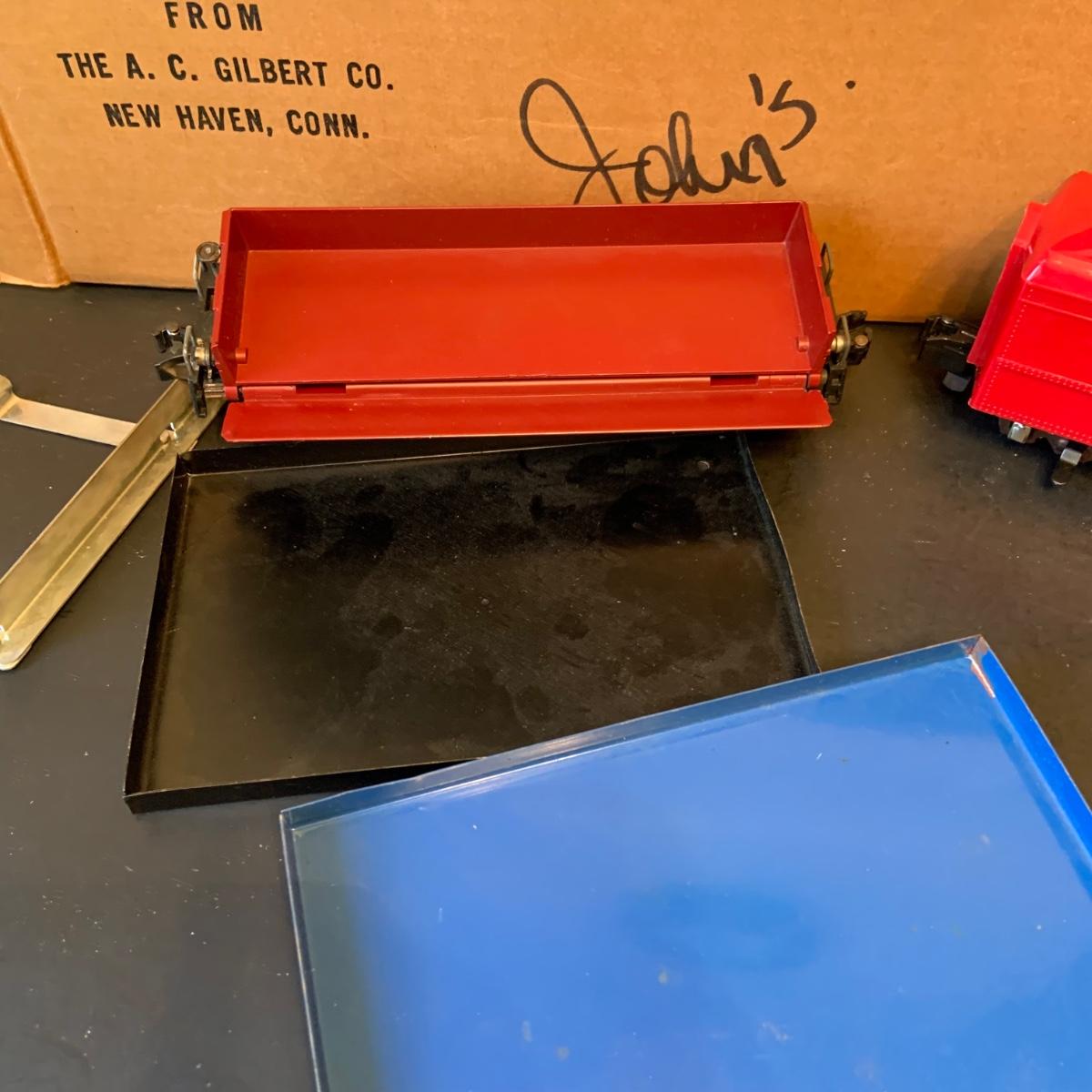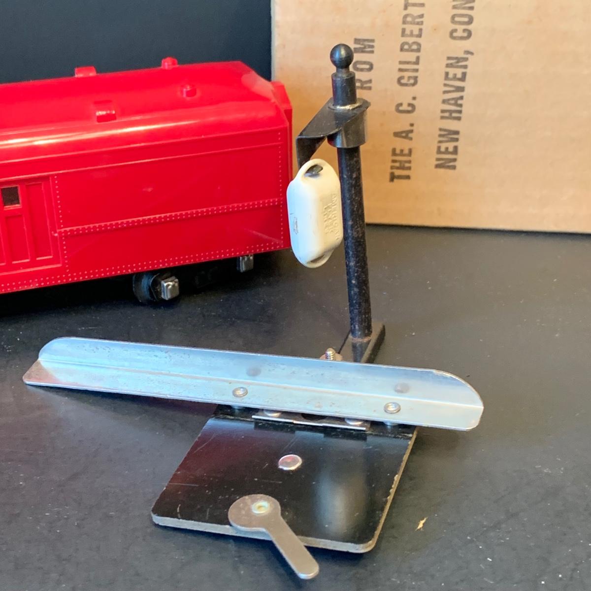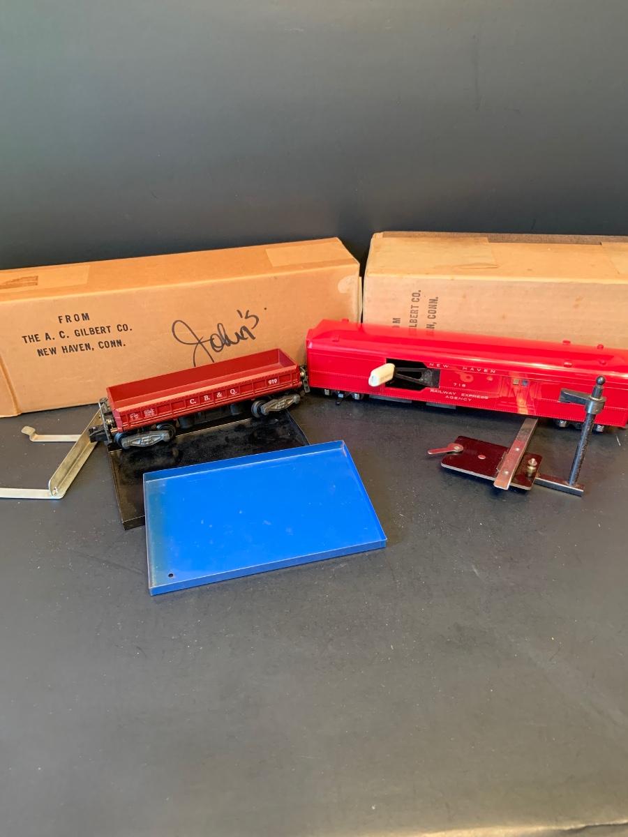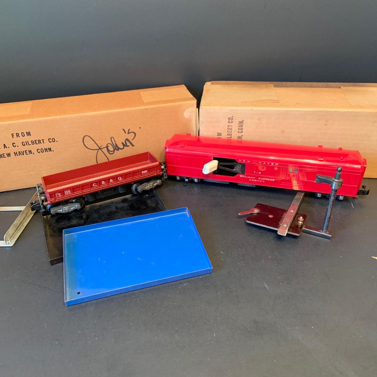 LOT:279G: American Flyer Train Cars - Operating Dump Car and Mail Pick-up Car