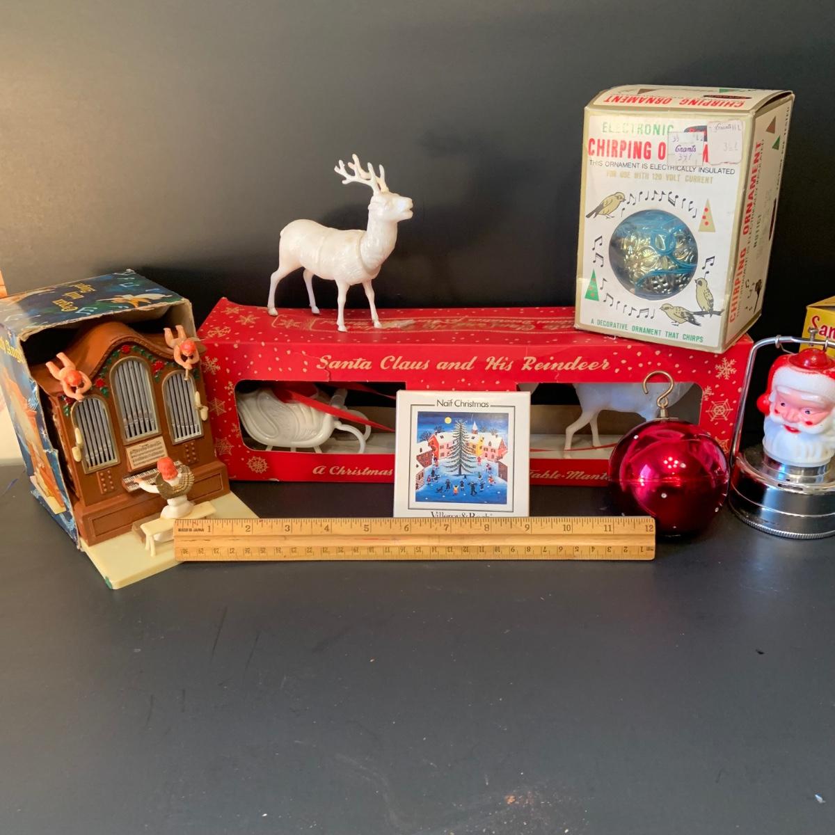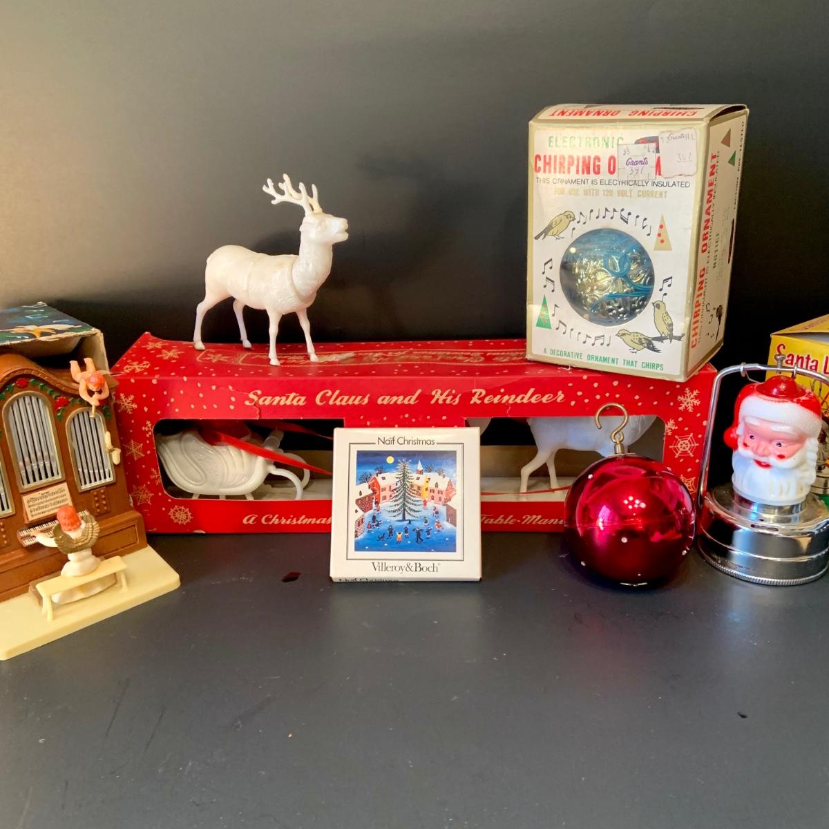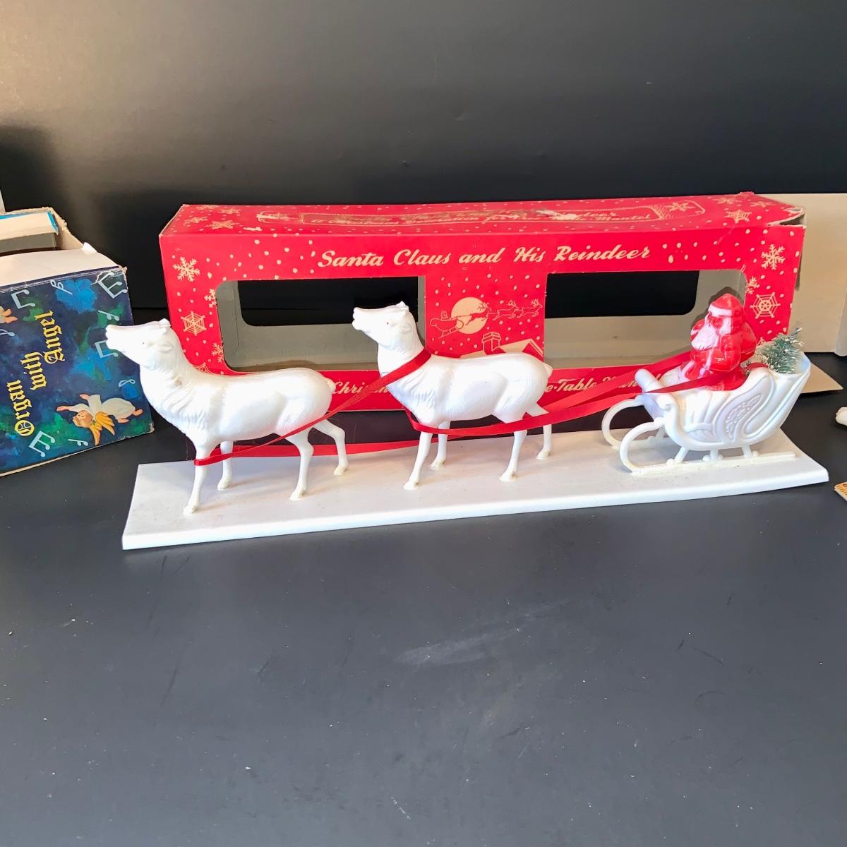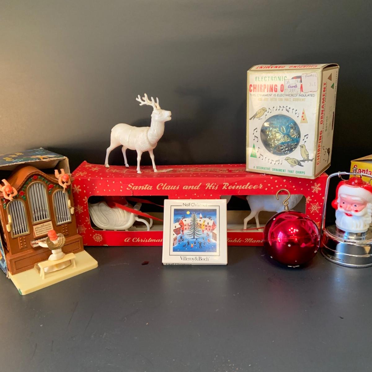 LOT:292G: Vintage Christmas Decor Including Including Plastic Bobble Head Reindeer, Santa's Sleigh, Musical Ornaments, Santa Head Lanter and More