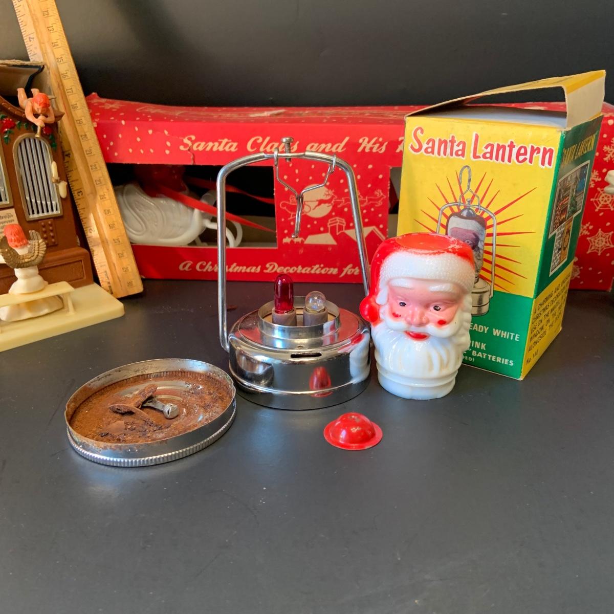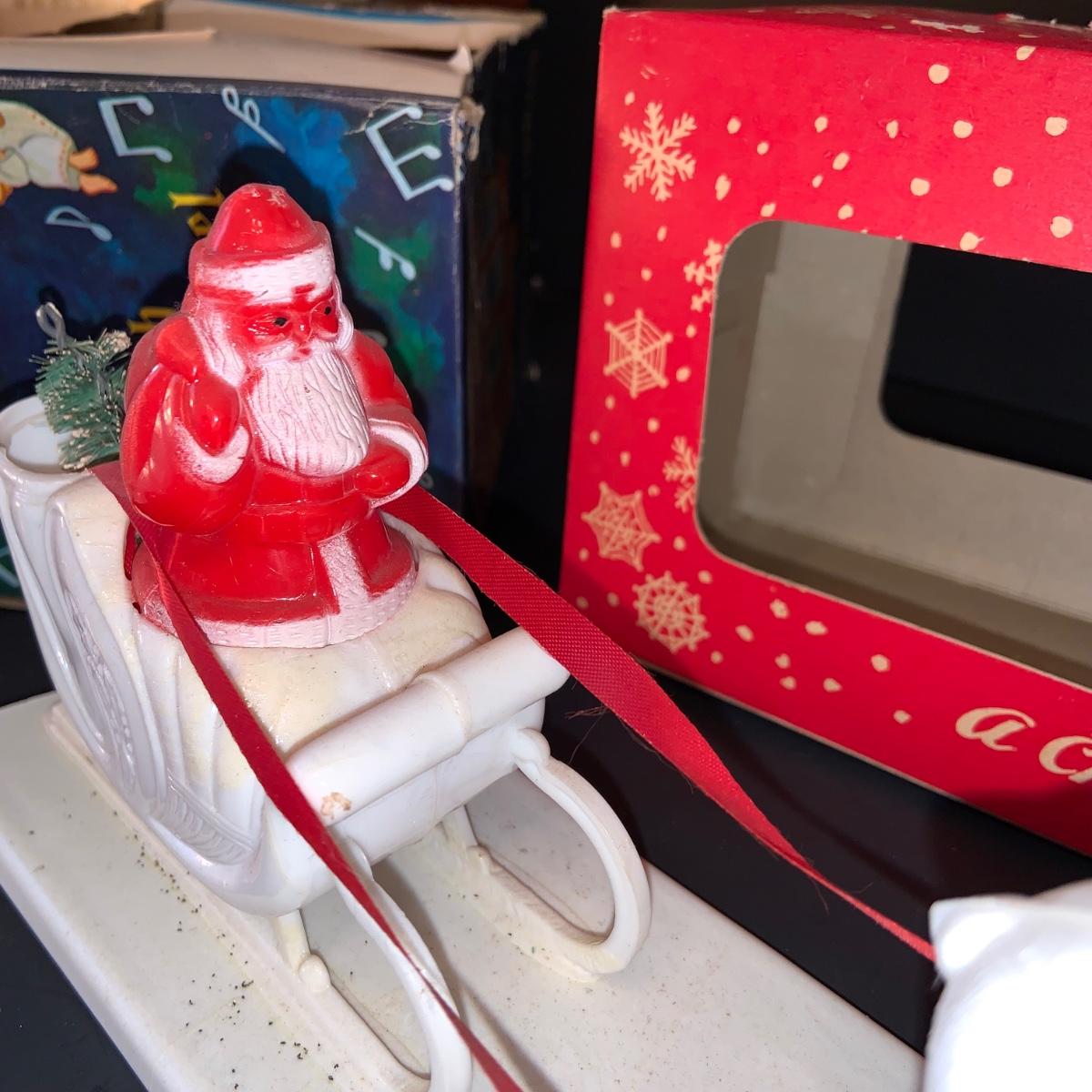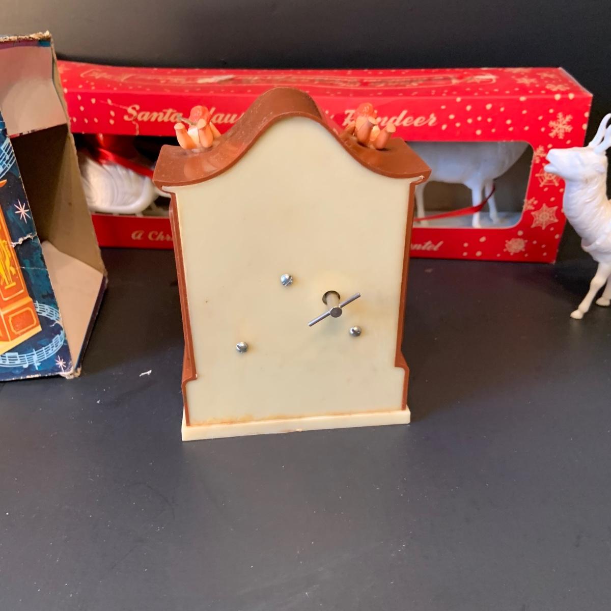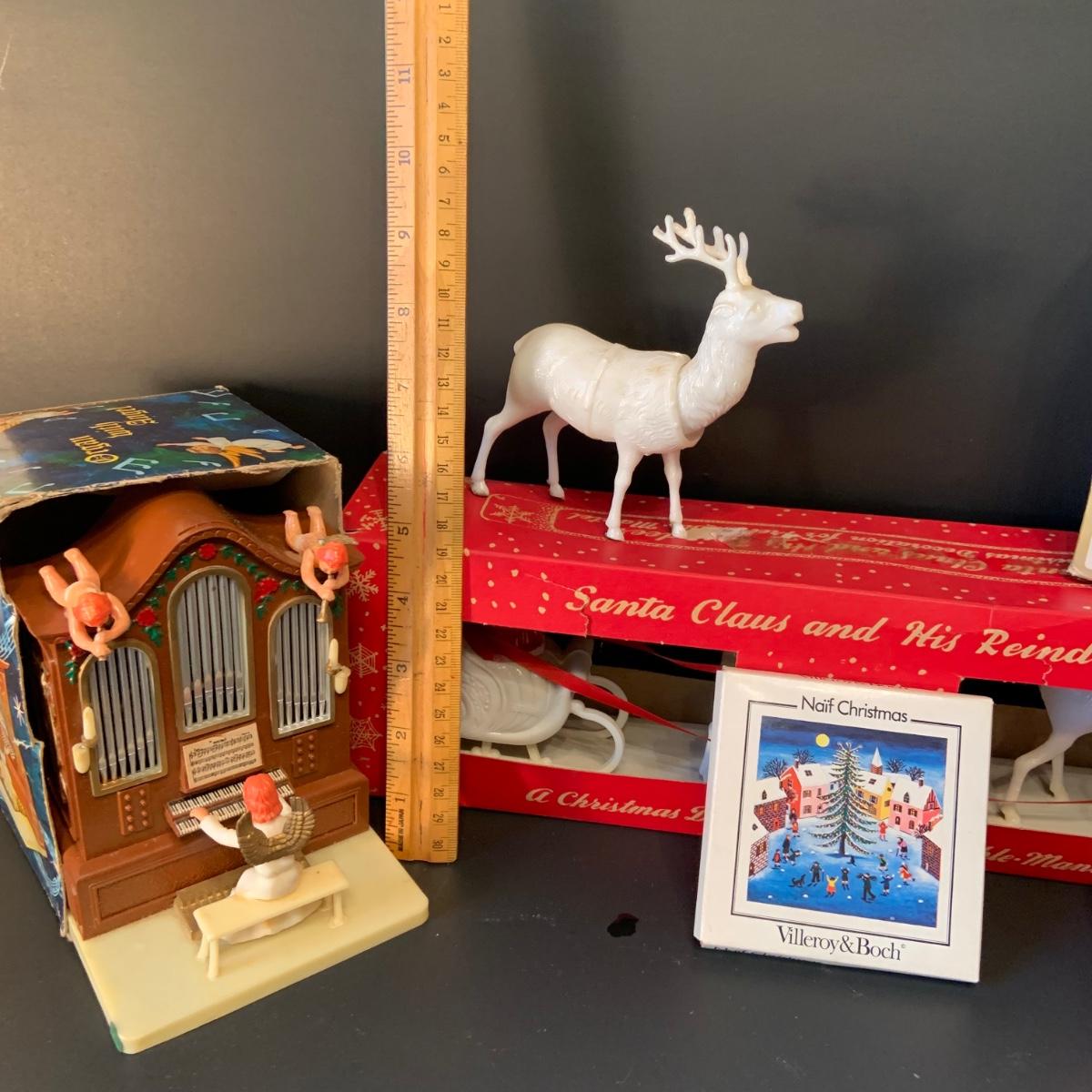 LOT:292G: Vintage Christmas Decor Including Including Plastic Bobble Head Reindeer, Santa's Sleigh, Musical Ornaments, Santa Head Lanter and More